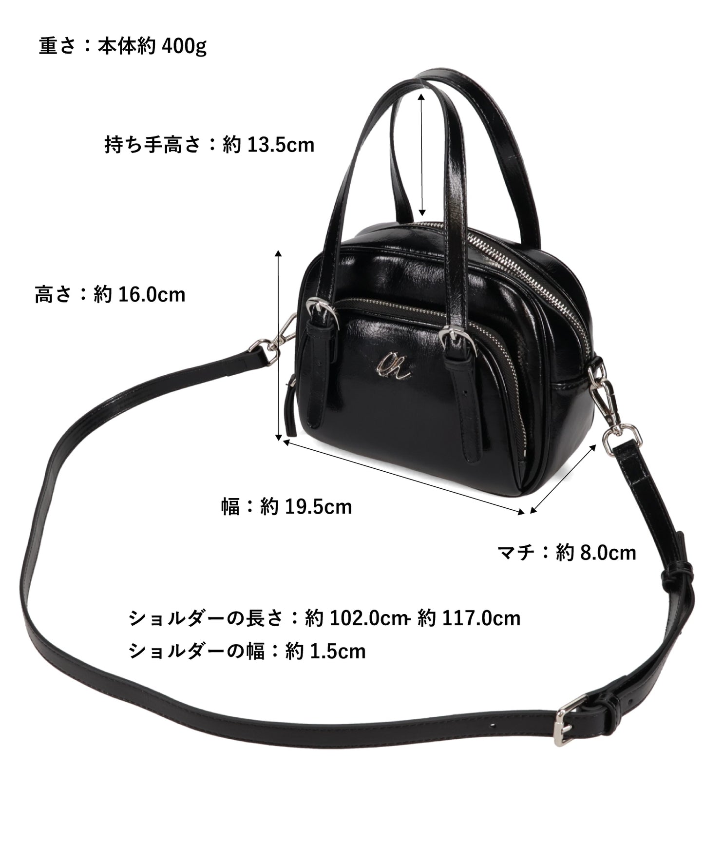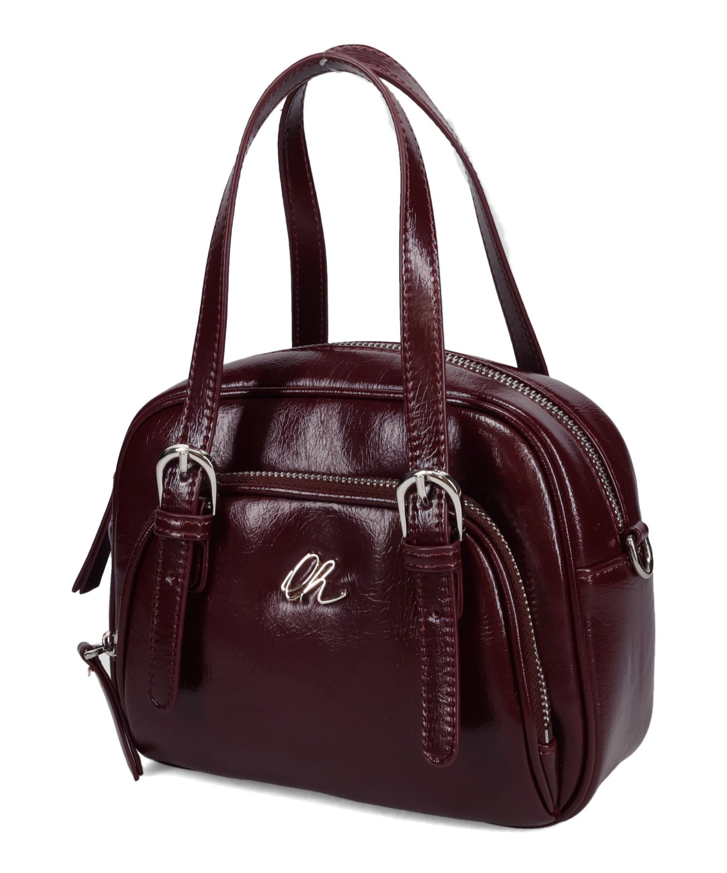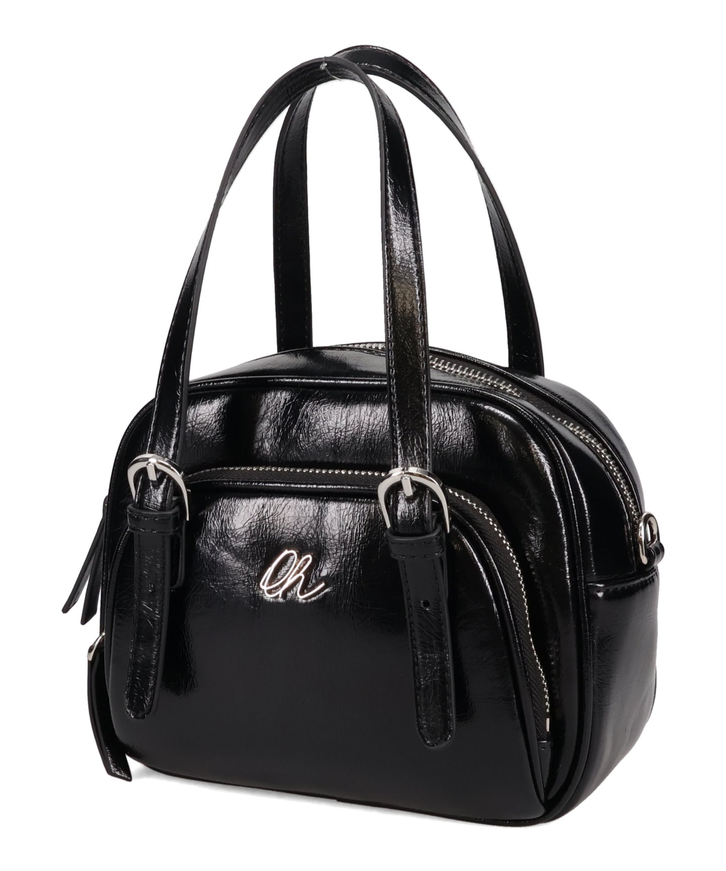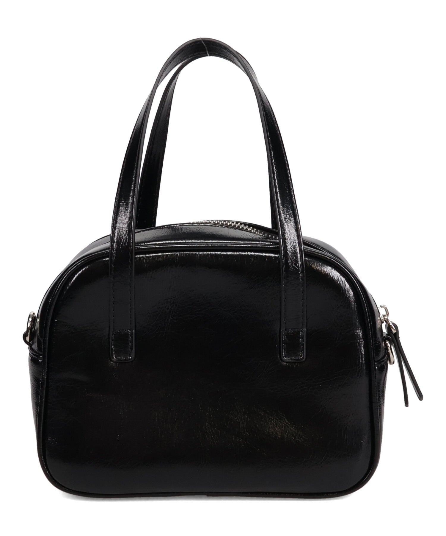 光沢のある素材を使用したボストンバッグはさりげないシルバーの金具が大人見えするデザイン。さらにフロント部分がファスナー付きのポケットになっているので小物の収納にぴったり。しっかりめのマチがあるので小ぶりのサイズ感ながらも毎日の必需品が収まる容量なのも使いやすい。取り外し可能なショルダーストラップ付き。