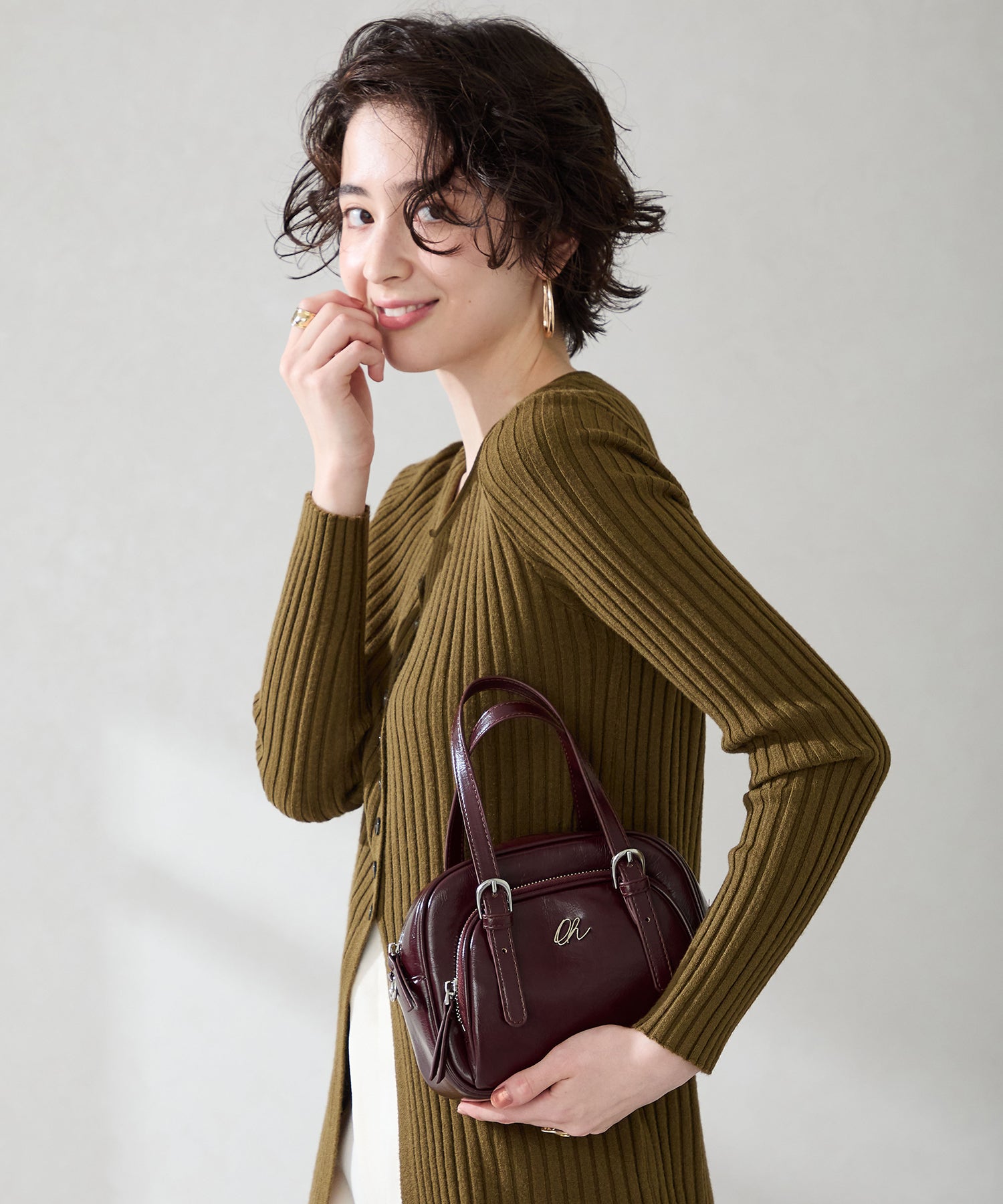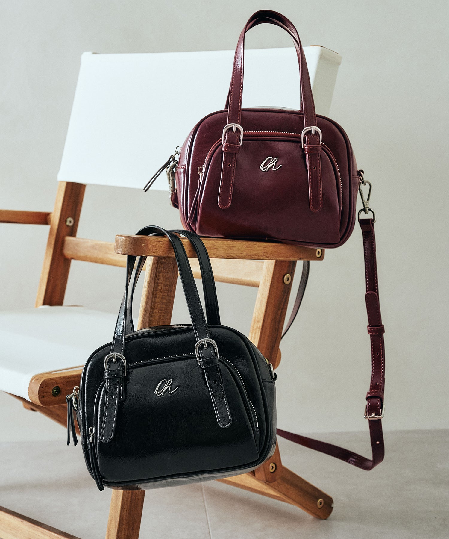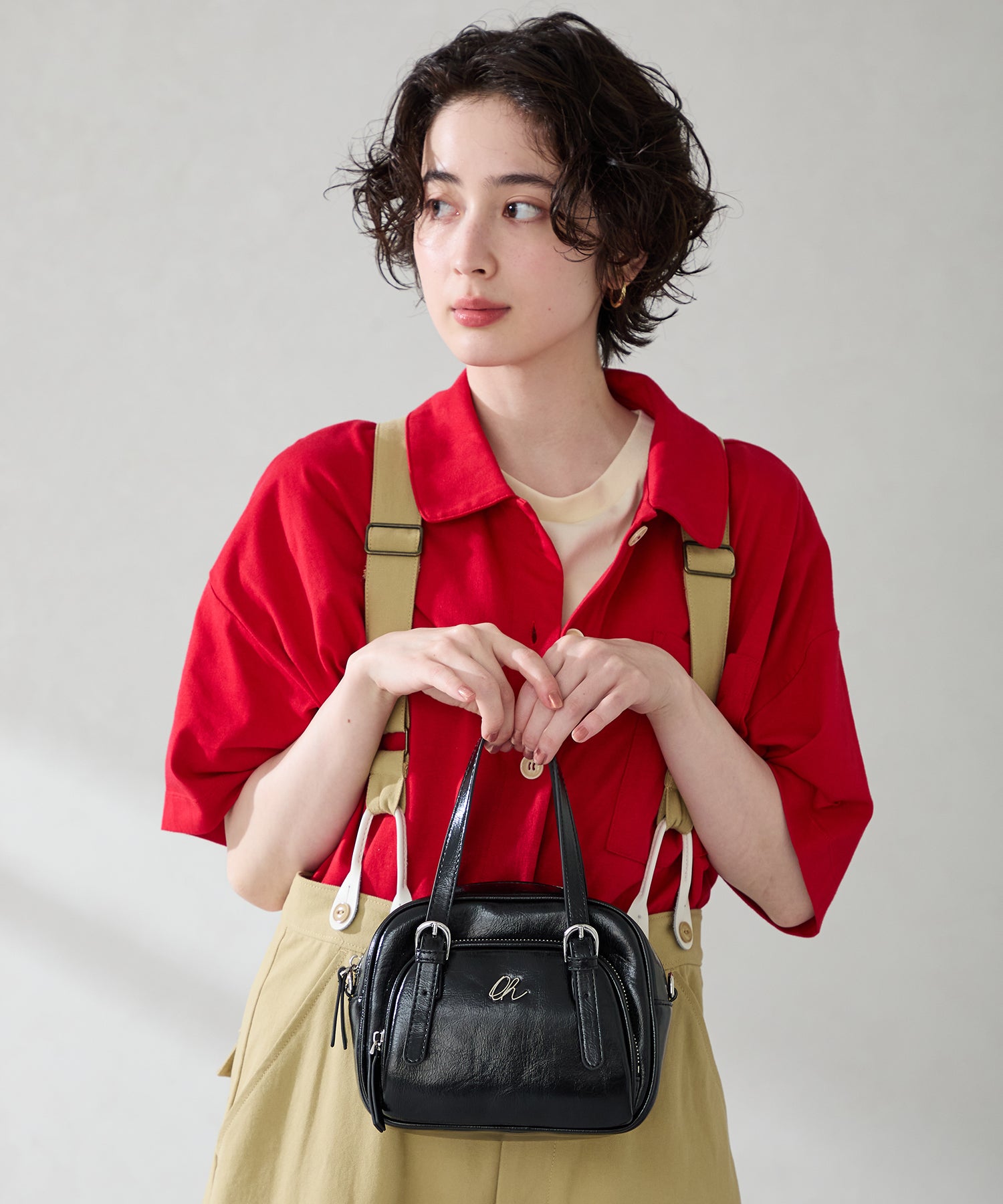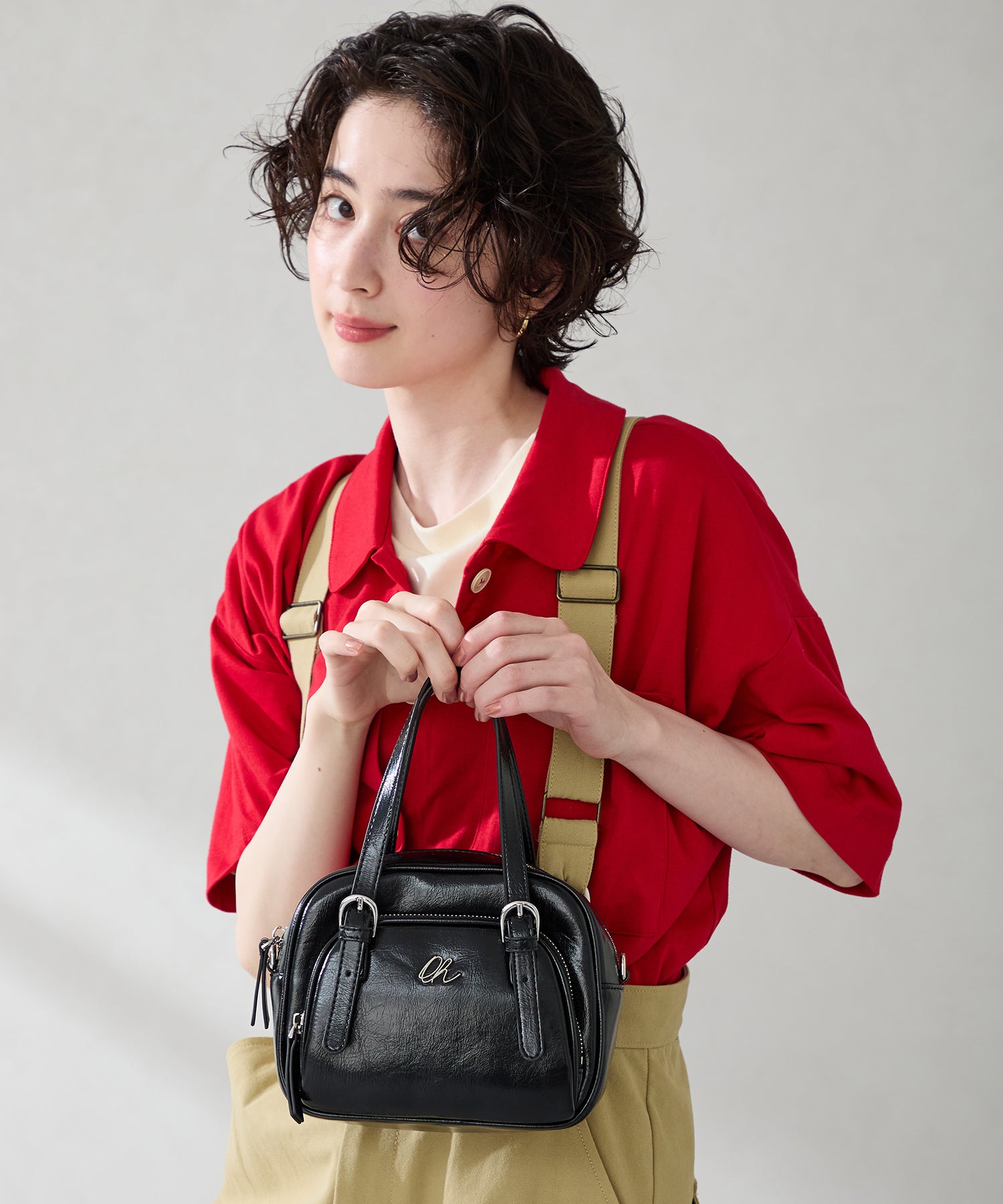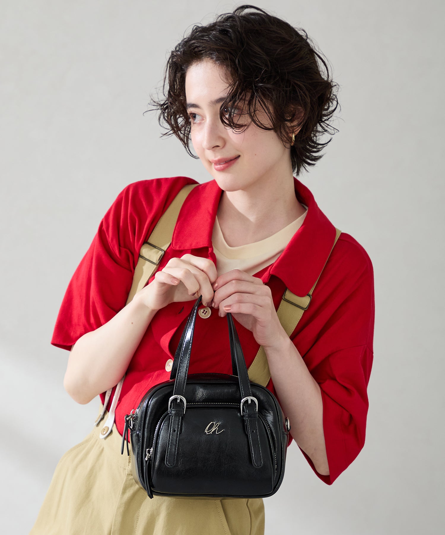 光沢のある素材を使用したボストンバッグはさりげないシルバーの金具が大人見えするデザイン。さらにフロント部分がファスナー付きのポケットになっているので小物の収納にぴったり。しっかりめのマチがあるので小ぶりのサイズ感ながらも毎日の必需品が収まる容量なのも使いやすい。取り外し可能なショルダーストラップ付き。