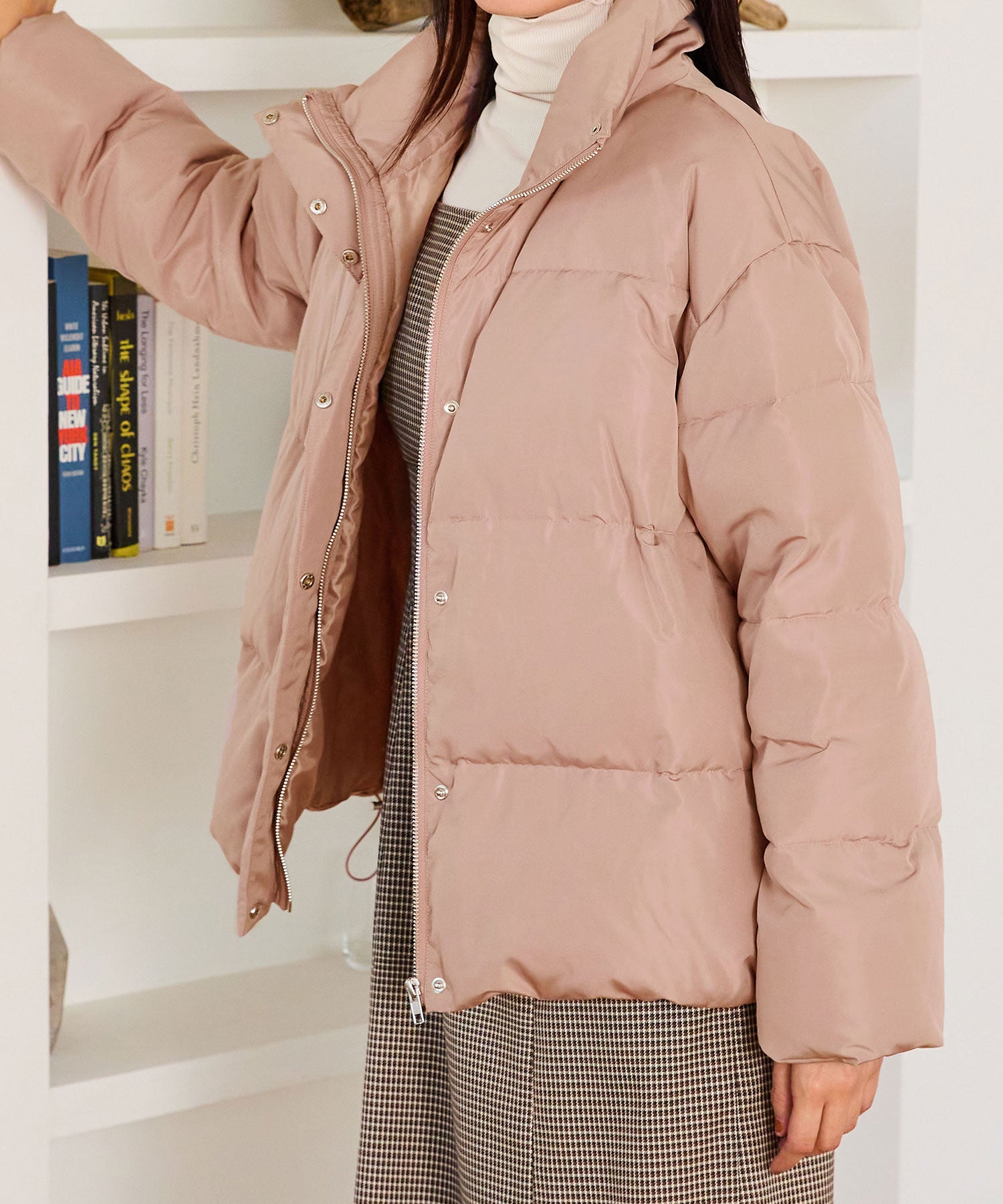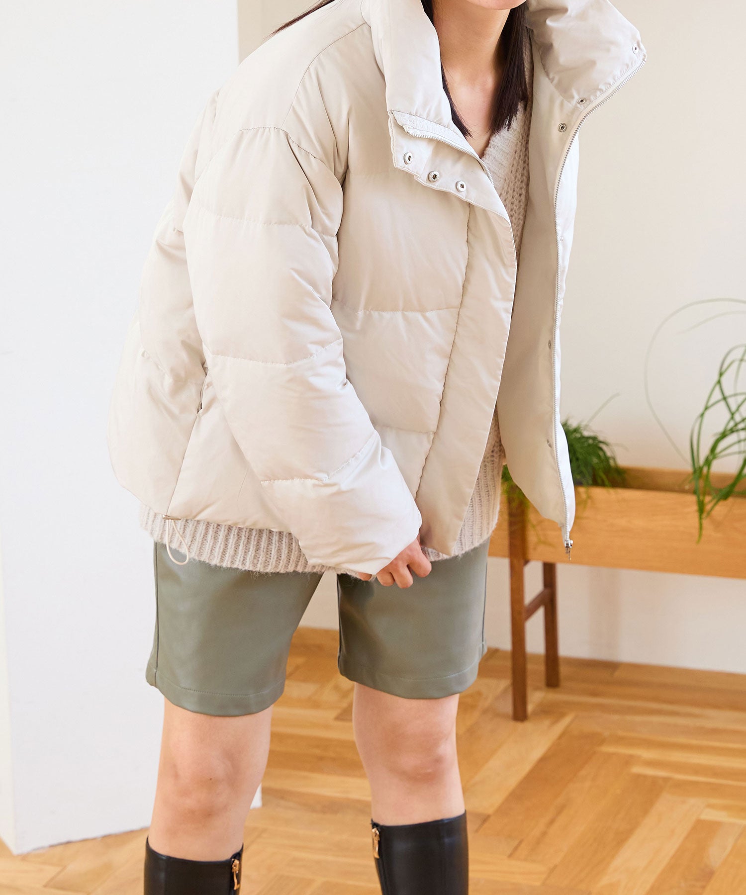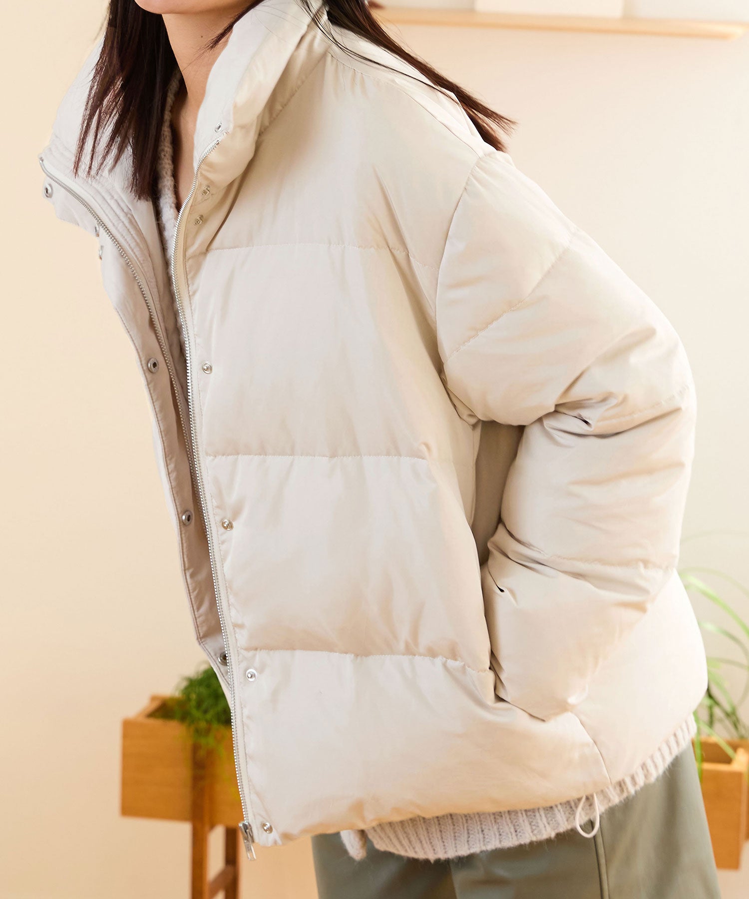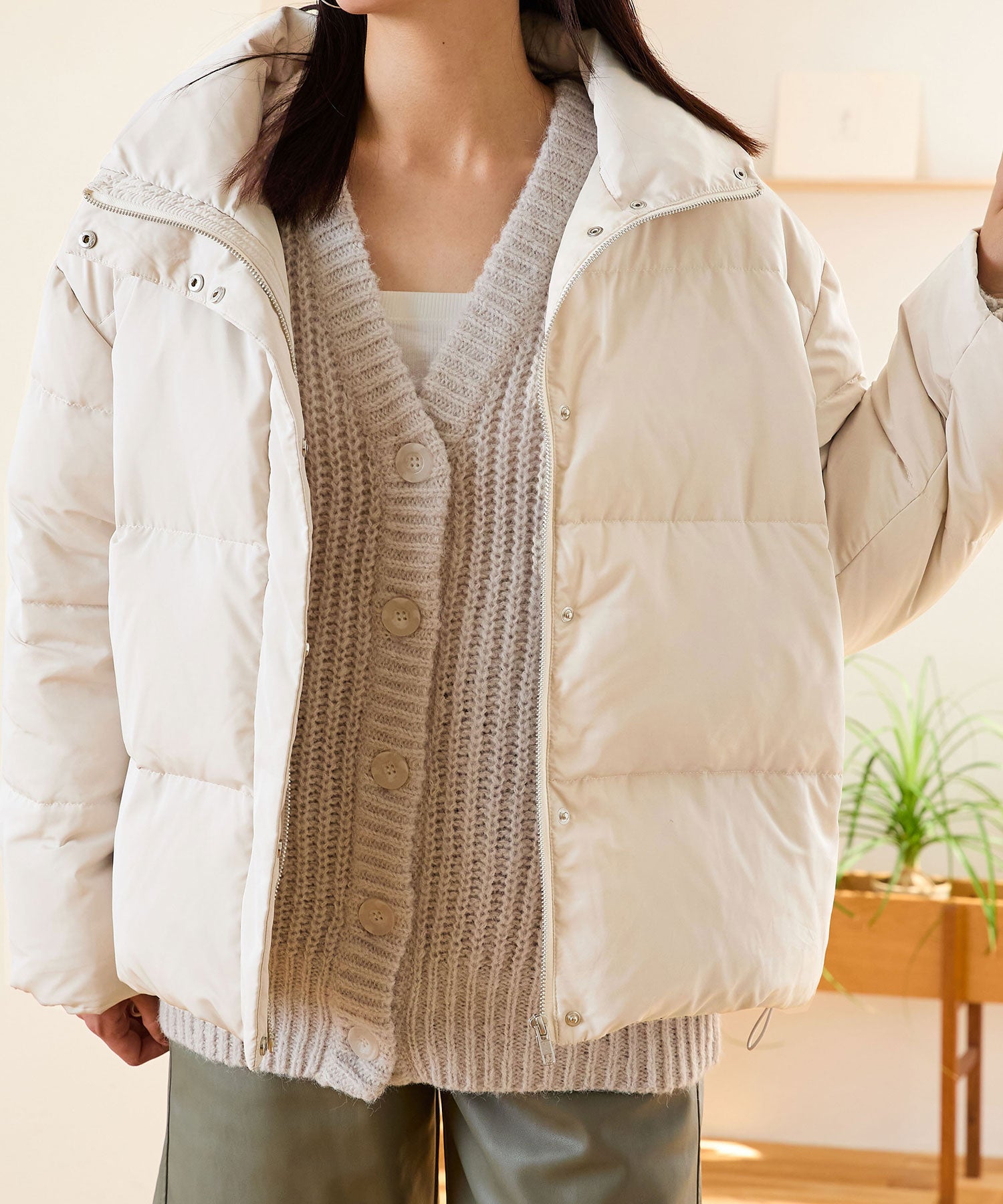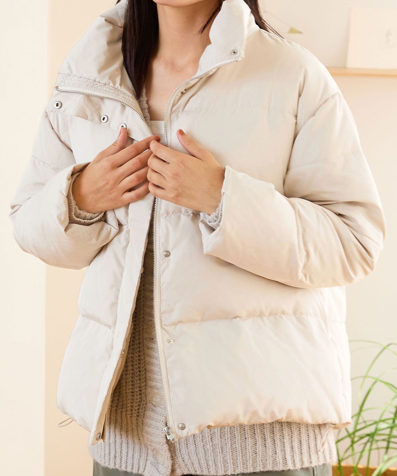 シンプルで幅広く合わせやすいダウンジャケットは、しっかり高さのあるスタンドネックで、首元や顔まわりまで防寒できる優秀アイテム。袖まわりや身幅はゆったりとした着心地で、中に厚手のニットやインナーを合わせられるサイズ感。ポケット裏地を起毛素材にしたのも隠れたこだわり。裾はぎゅっと絞れる2way仕様なので、その日の気分やスタイリングに合わせてシルエットを変えられる。