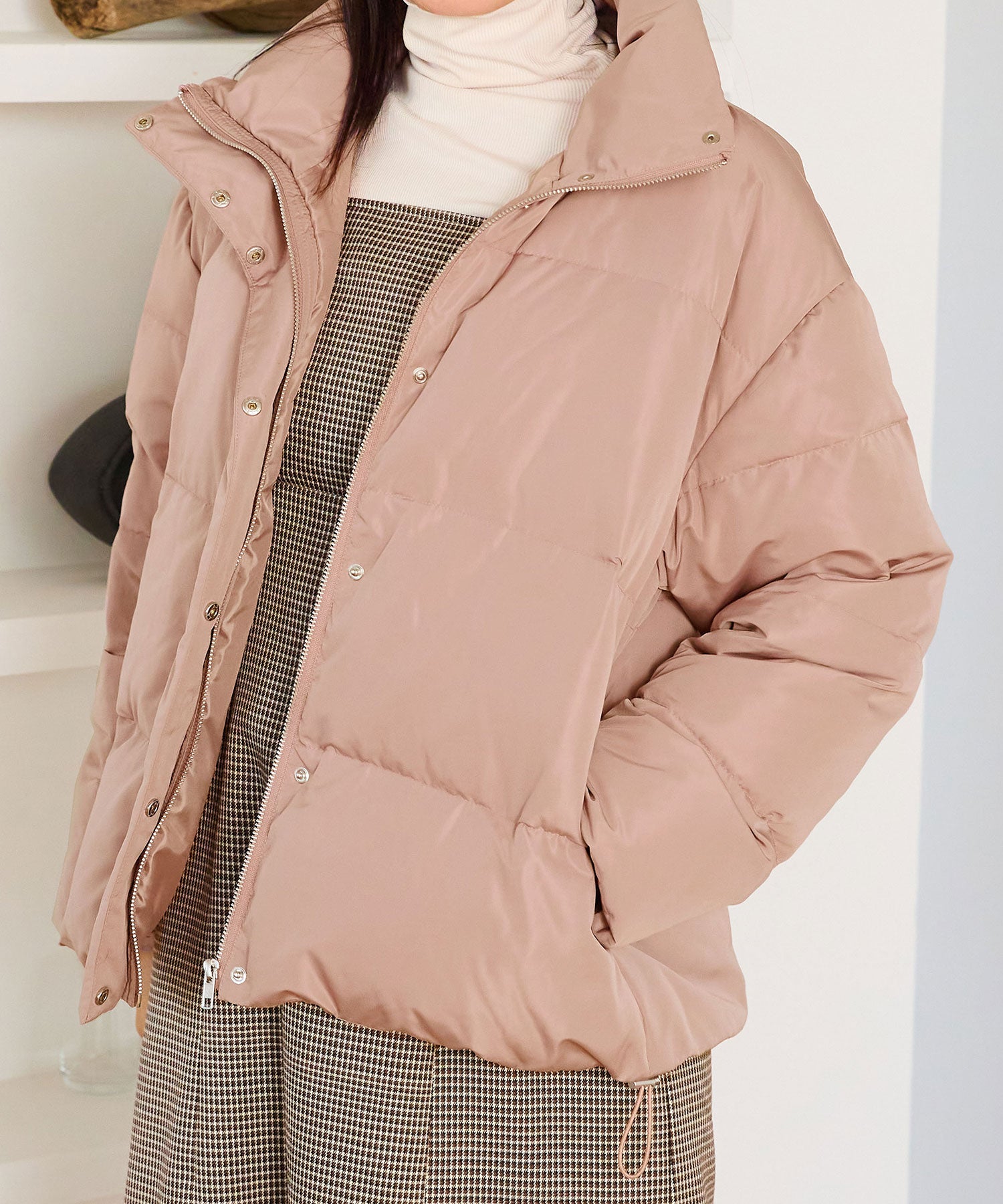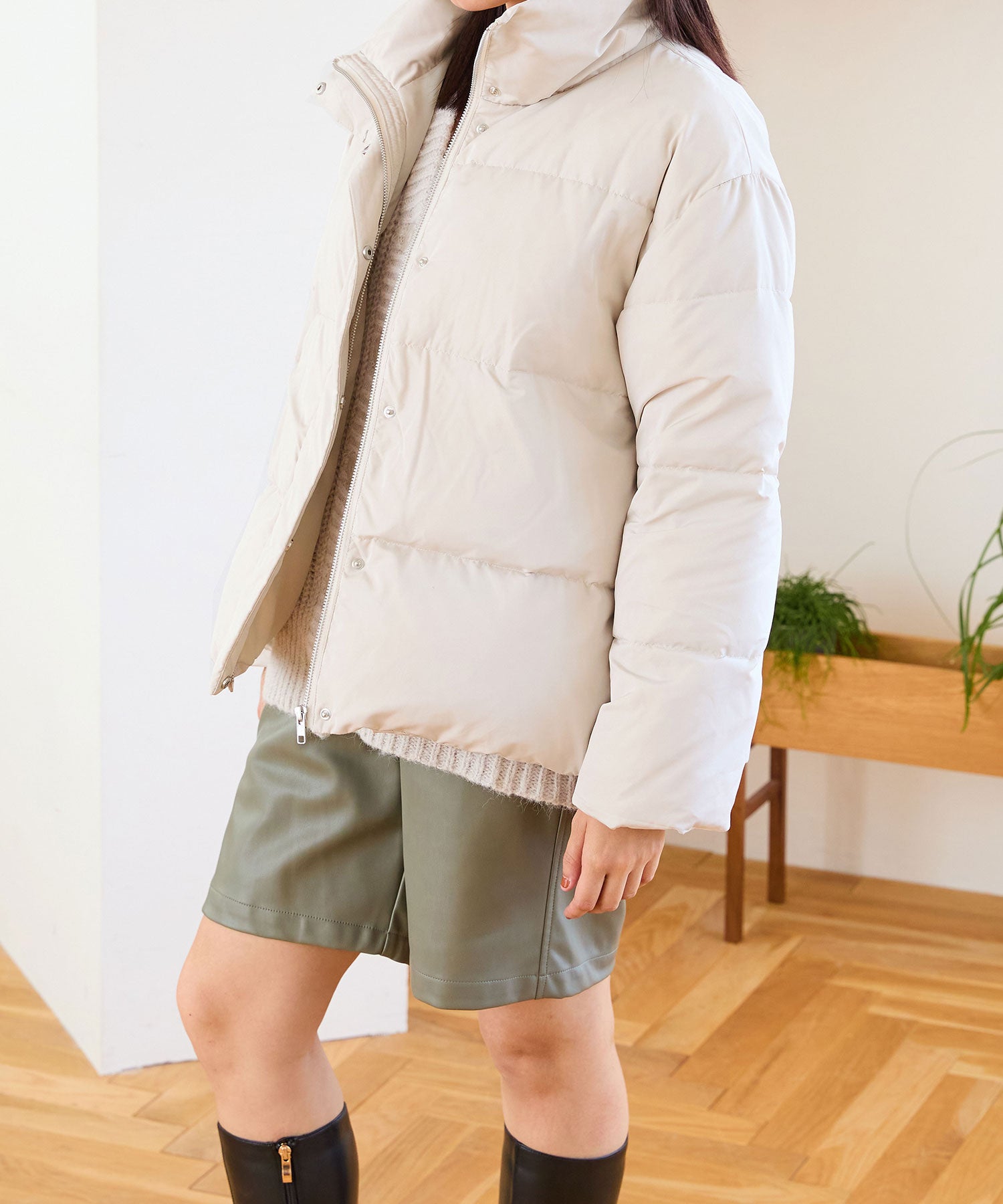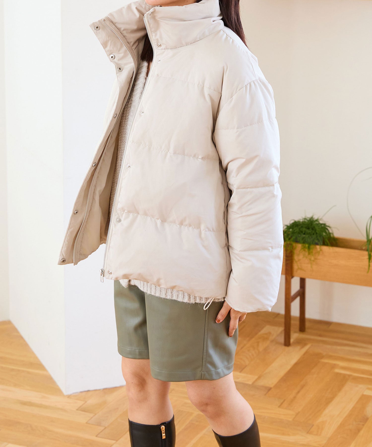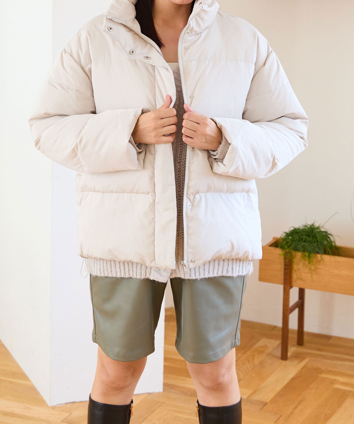 シンプルで幅広く合わせやすいダウンジャケットは、しっかり高さのあるスタンドネックで、首元や顔まわりまで防寒できる優秀アイテム。袖まわりや身幅はゆったりとした着心地で、中に厚手のニットやインナーを合わせられるサイズ感。ポケット裏地を起毛素材にしたのも隠れたこだわり。裾はぎゅっと絞れる2way仕様なので、その日の気分やスタイリングに合わせてシルエットを変えられる。