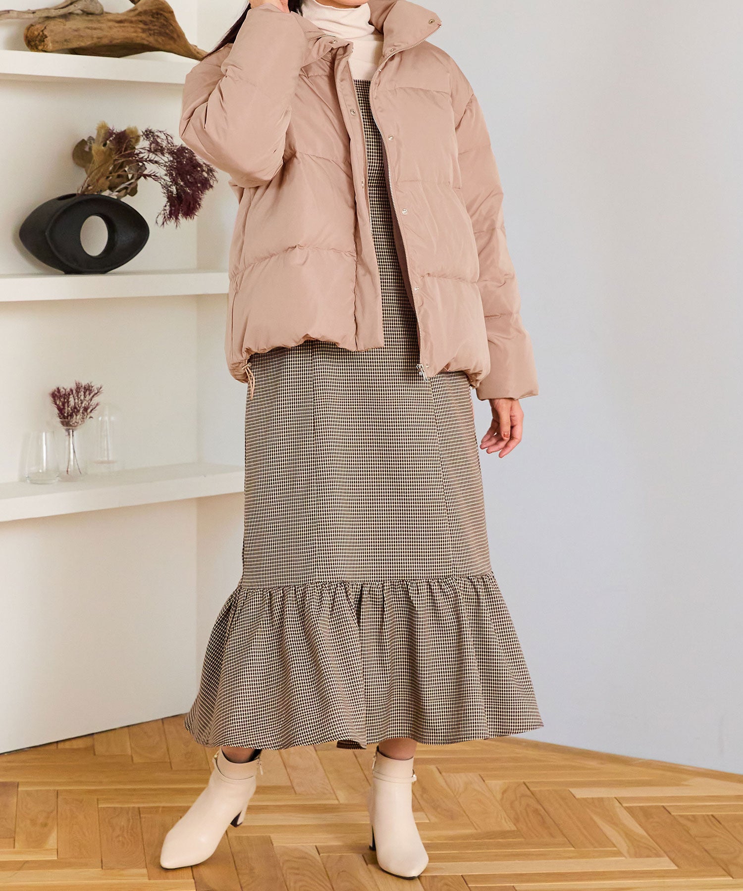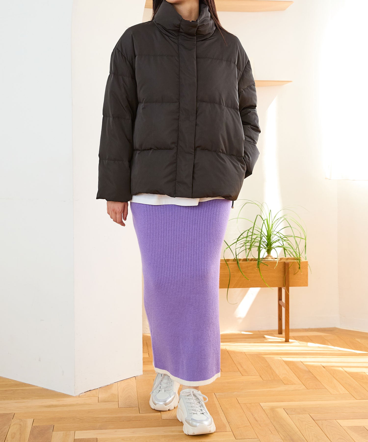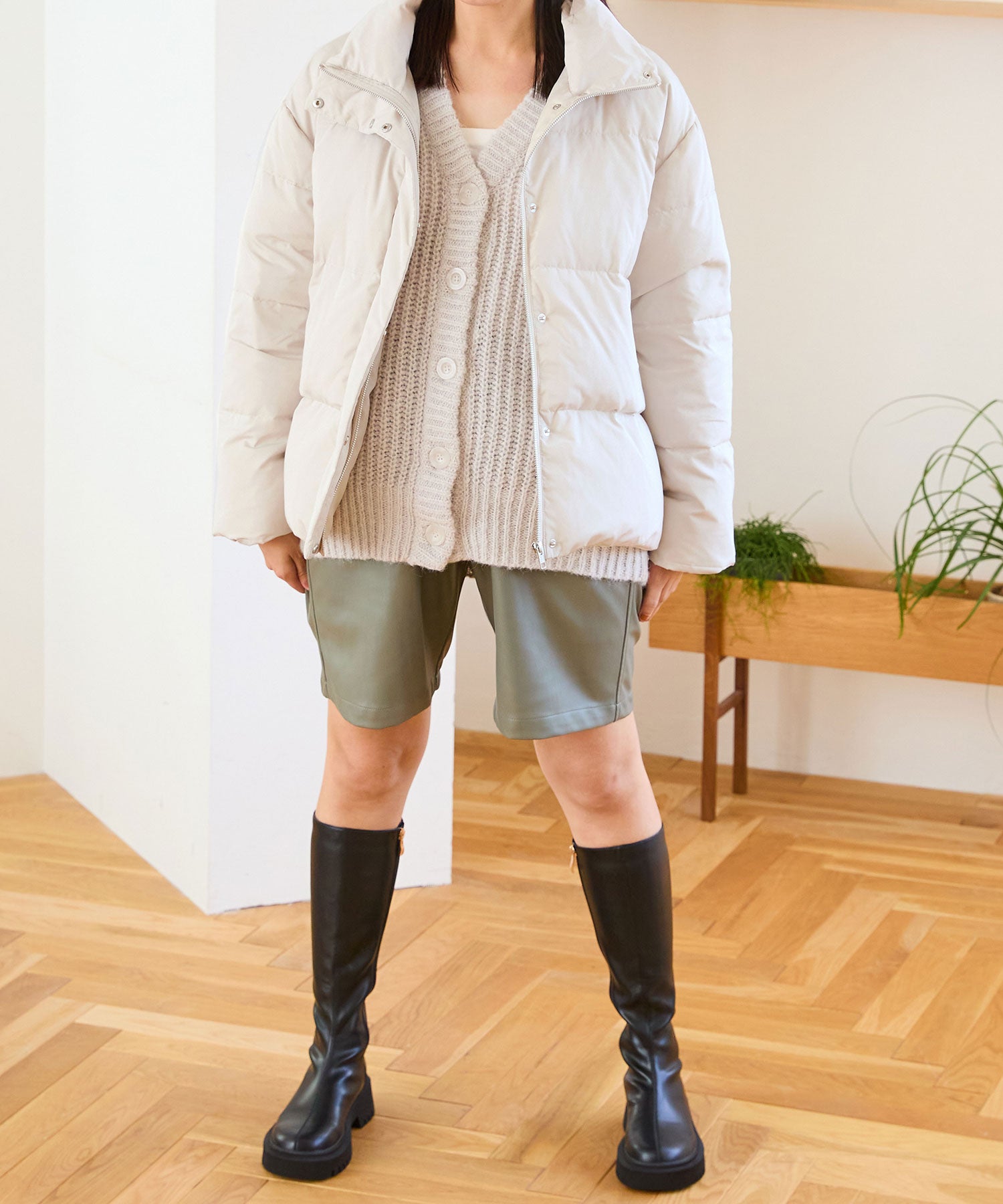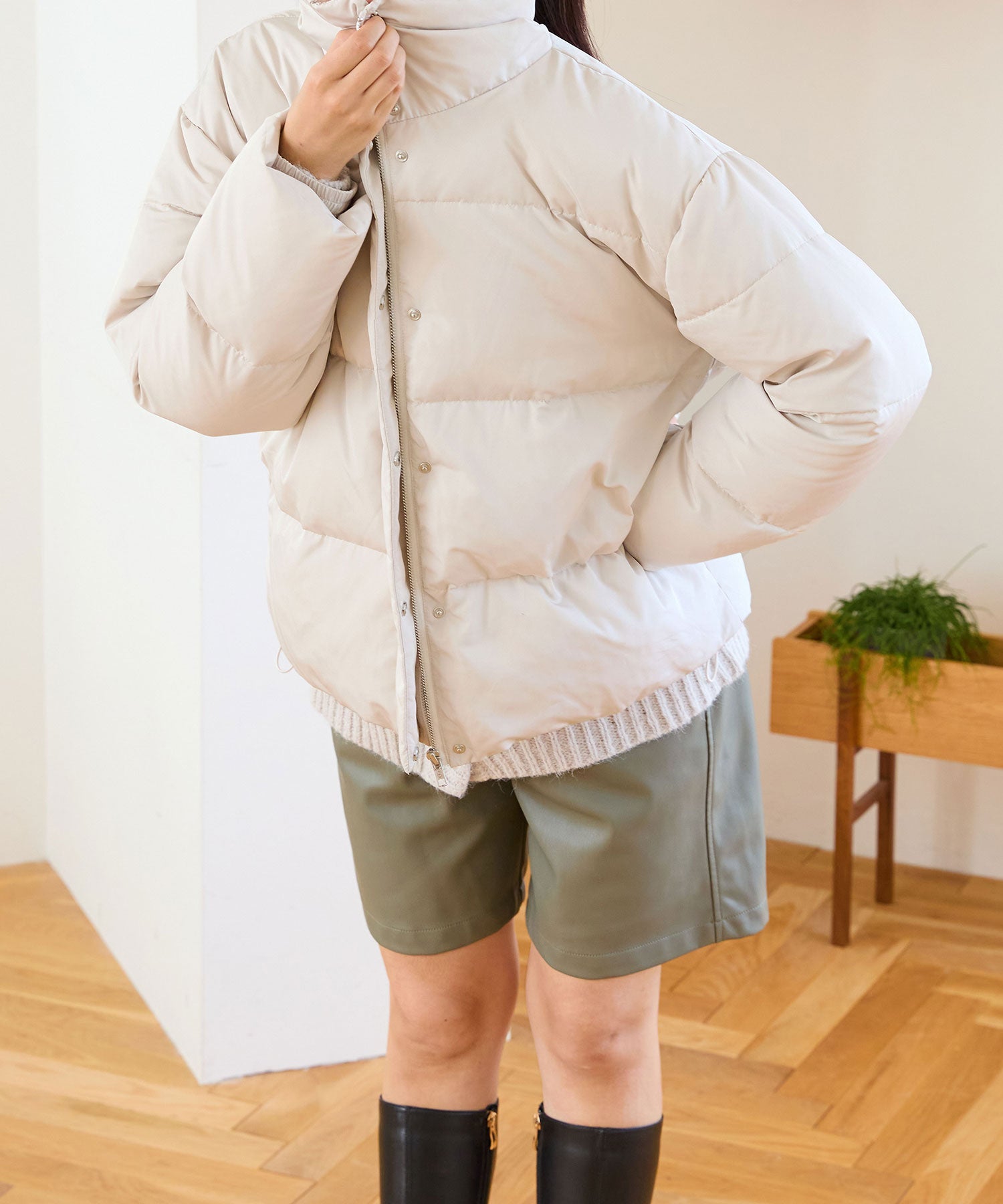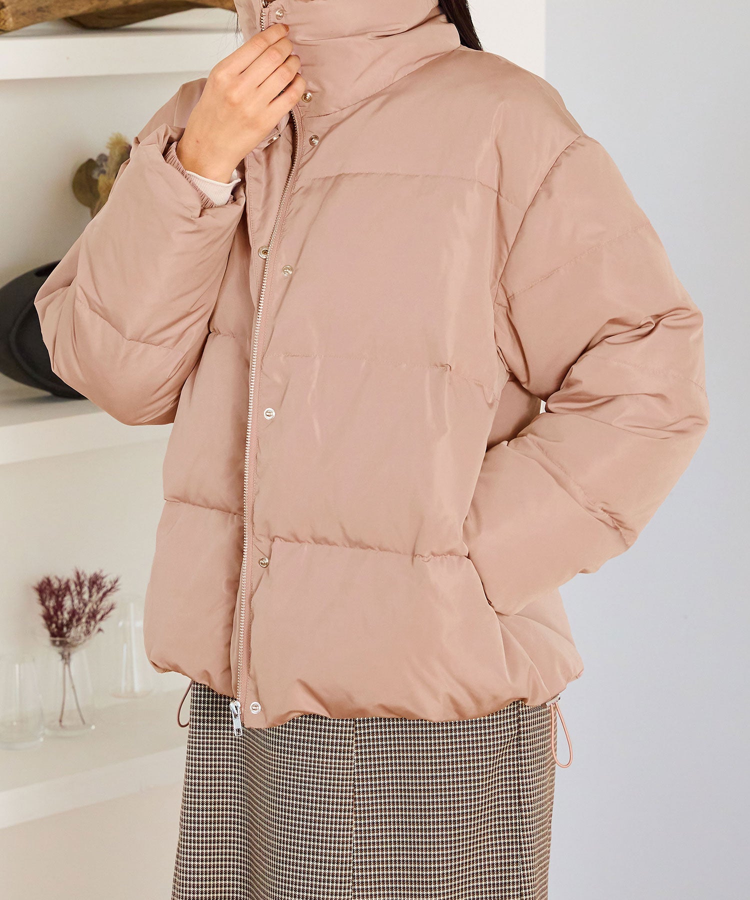 シンプルで幅広く合わせやすいダウンジャケットは、しっかり高さのあるスタンドネックで、首元や顔まわりまで防寒できる優秀アイテム。袖まわりや身幅はゆったりとした着心地で、中に厚手のニットやインナーを合わせられるサイズ感。ポケット裏地を起毛素材にしたのも隠れたこだわり。裾はぎゅっと絞れる2way仕様なので、その日の気分やスタイリングに合わせてシルエットを変えられる。