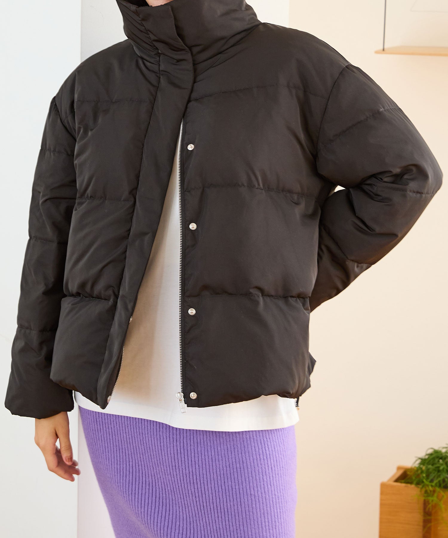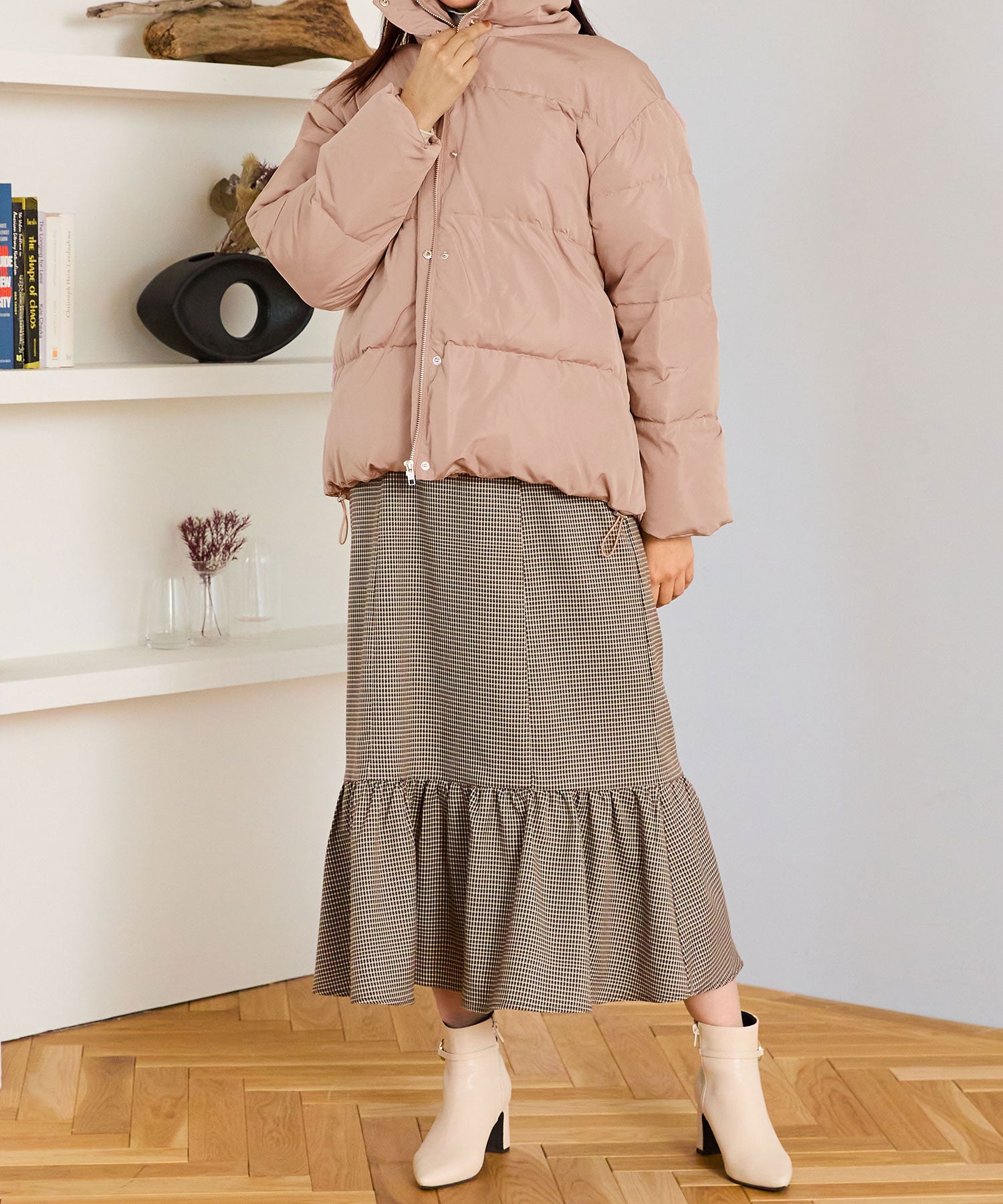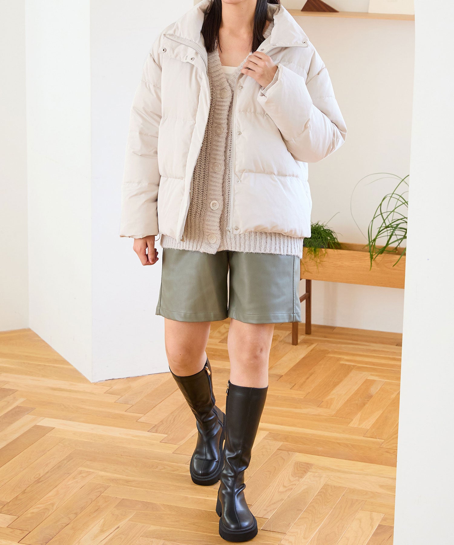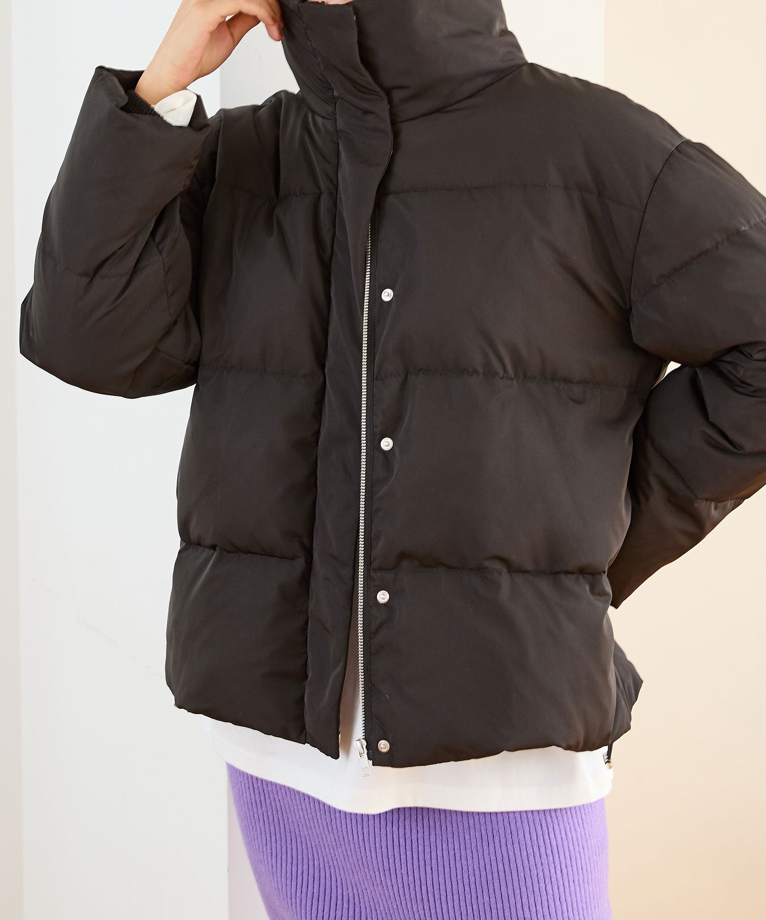 シンプルで幅広く合わせやすいダウンジャケットは、しっかり高さのあるスタンドネックで、首元や顔まわりまで防寒できる優秀アイテム。袖まわりや身幅はゆったりとした着心地で、中に厚手のニットやインナーを合わせられるサイズ感。ポケット裏地を起毛素材にしたのも隠れたこだわり。裾はぎゅっと絞れる2way仕様なので、その日の気分やスタイリングに合わせてシルエットを変えられる。