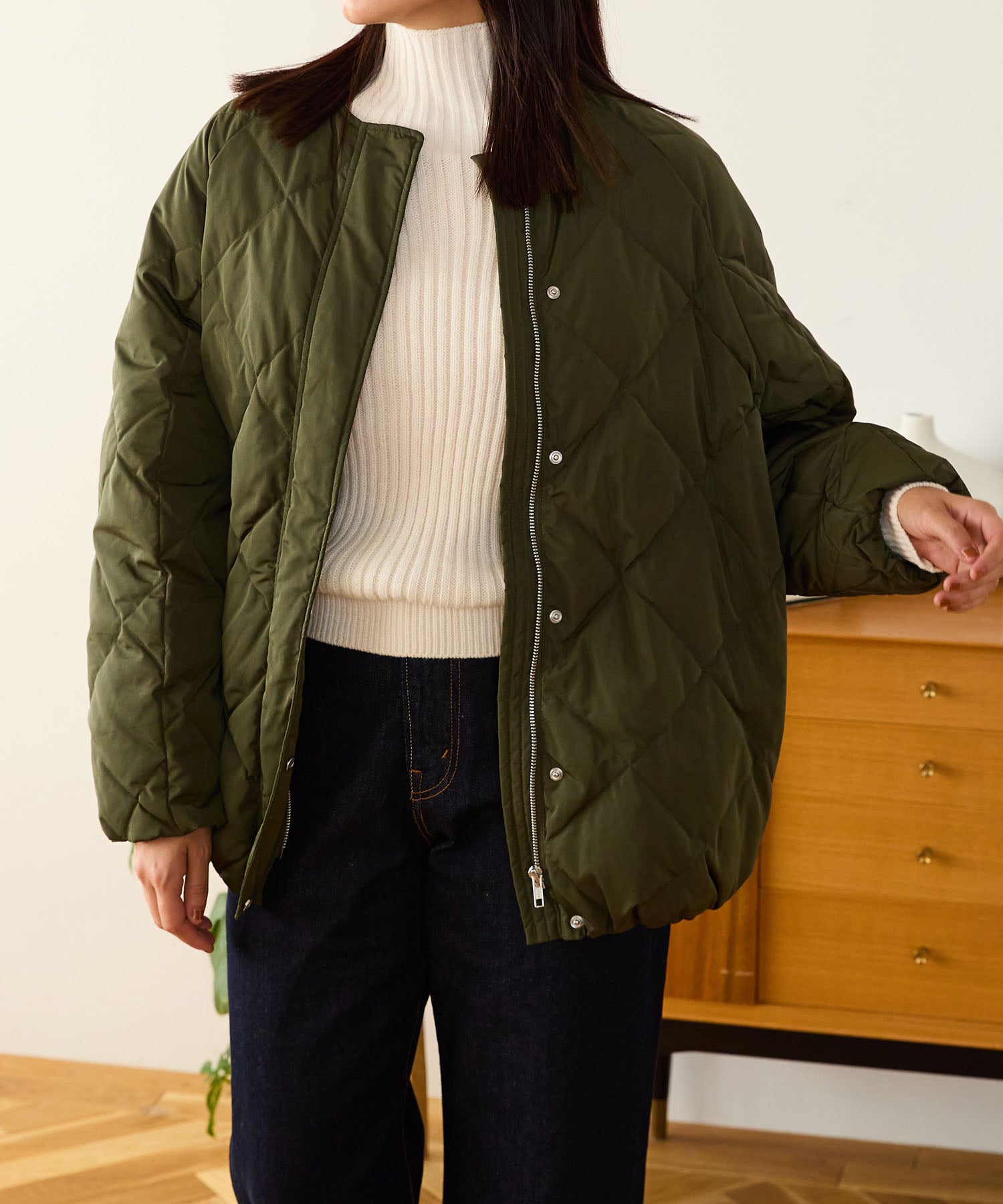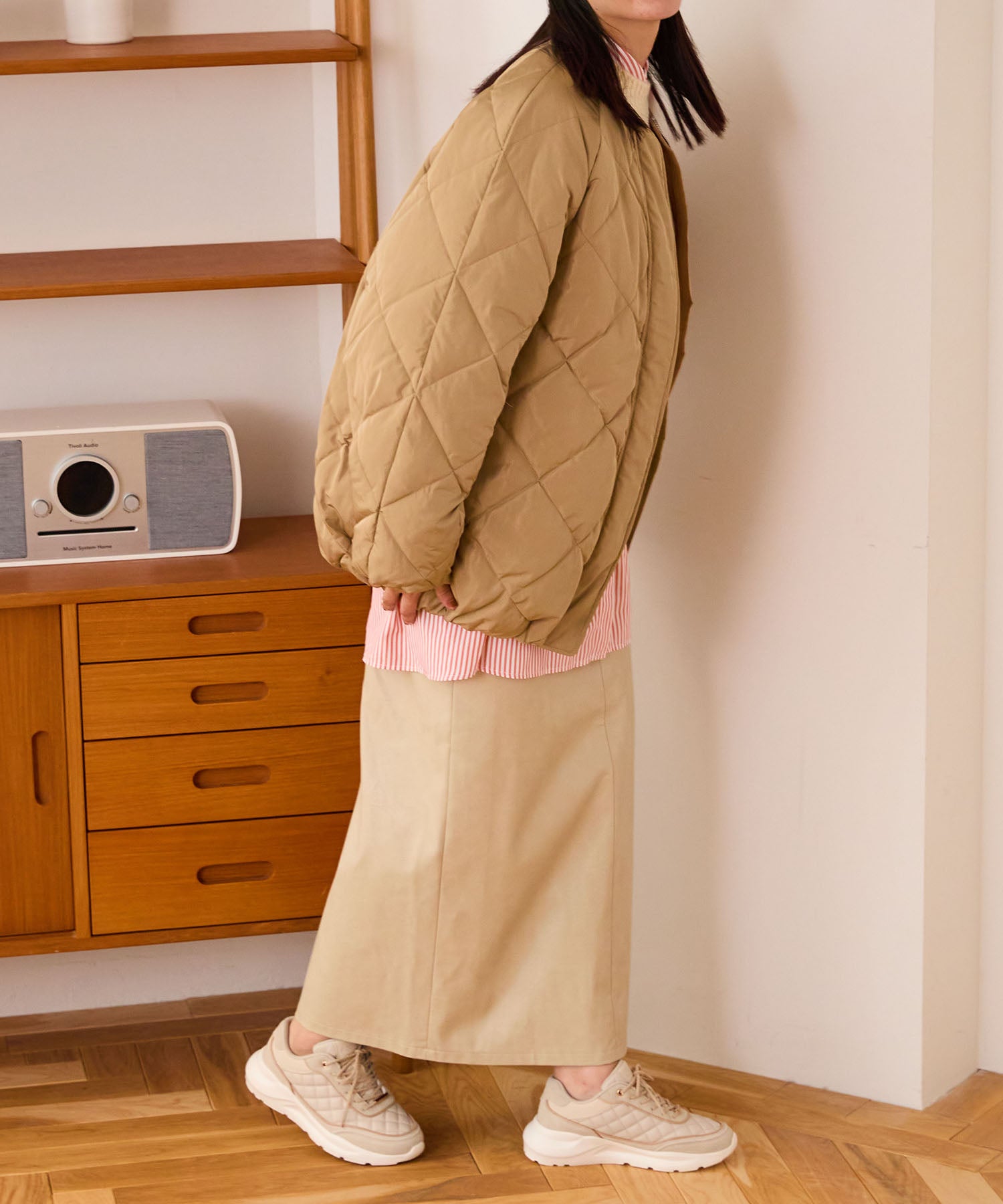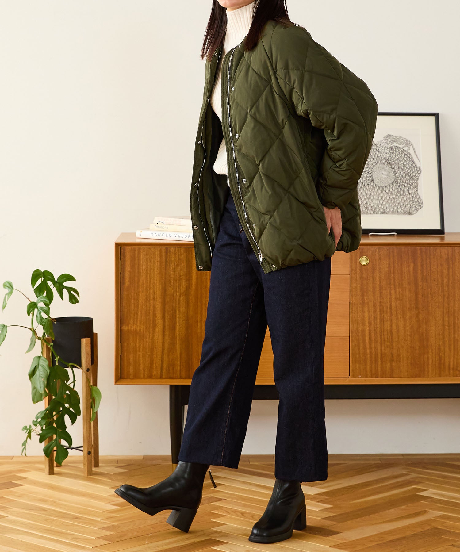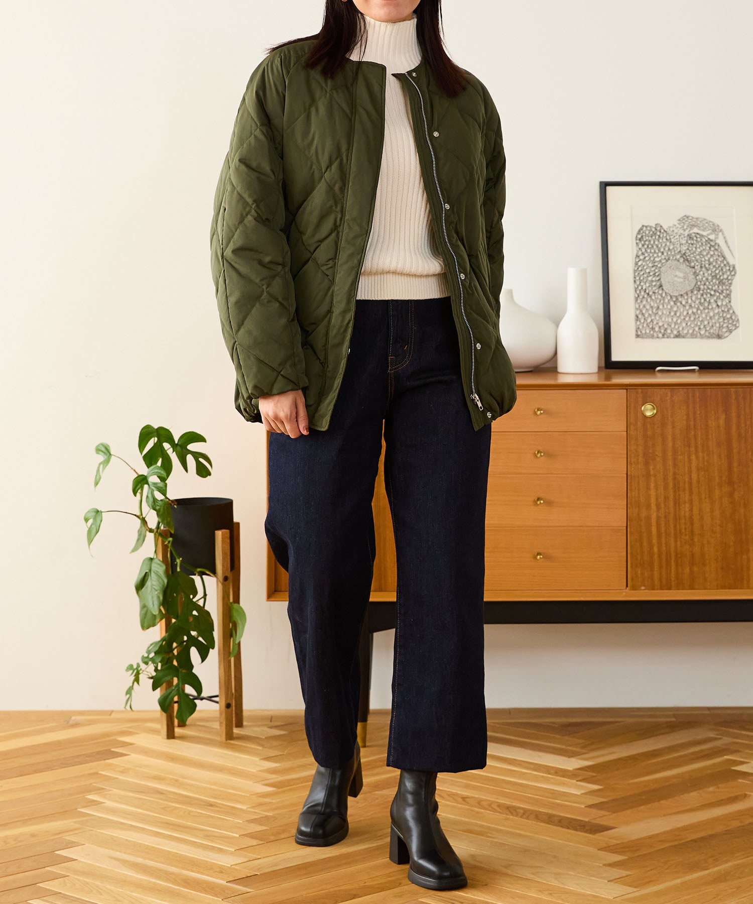 カジュアルにさっと羽織れるキルティングジャケットは、ノーカラーでカットソーやタートルネックとの相性も抜群。お尻が隠れるくらいの着丈で細身のパンツとも安心して合わせられるのが嬉しい。袖口や裾にギャザーを入れることで風を通しにくいような仕様に。程よいゆったり感はありつつも、女性らしいシルエットを叶えたアイテムは、この冬活躍すること間違いなし。