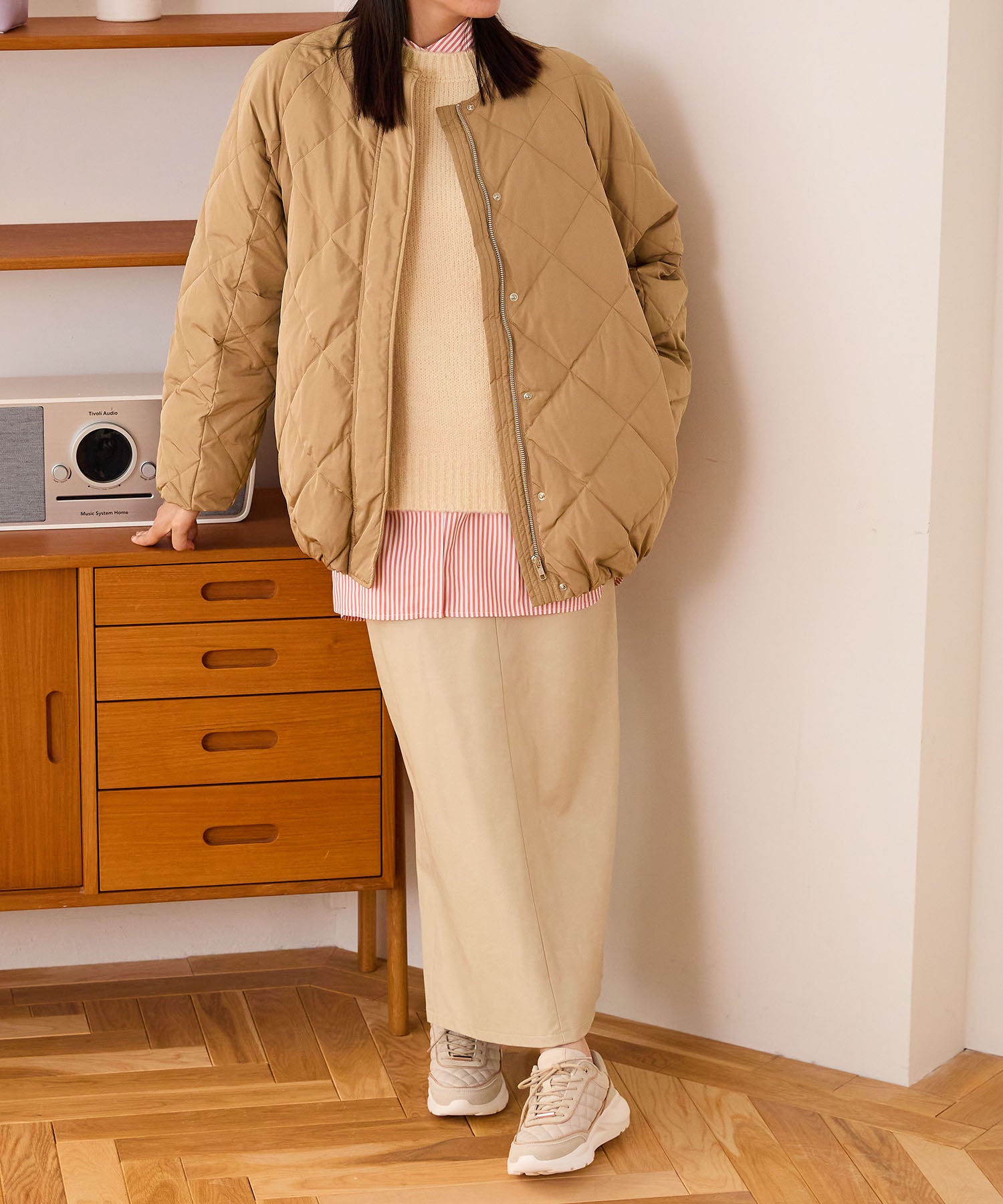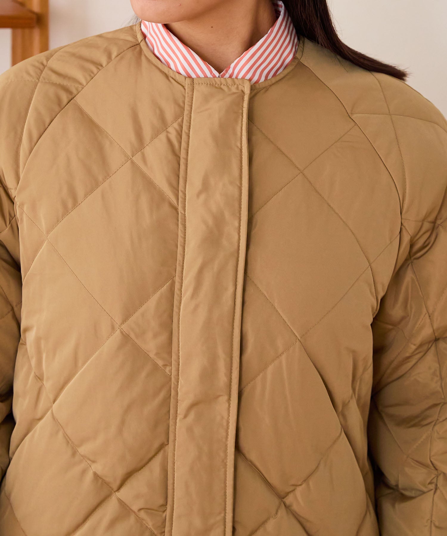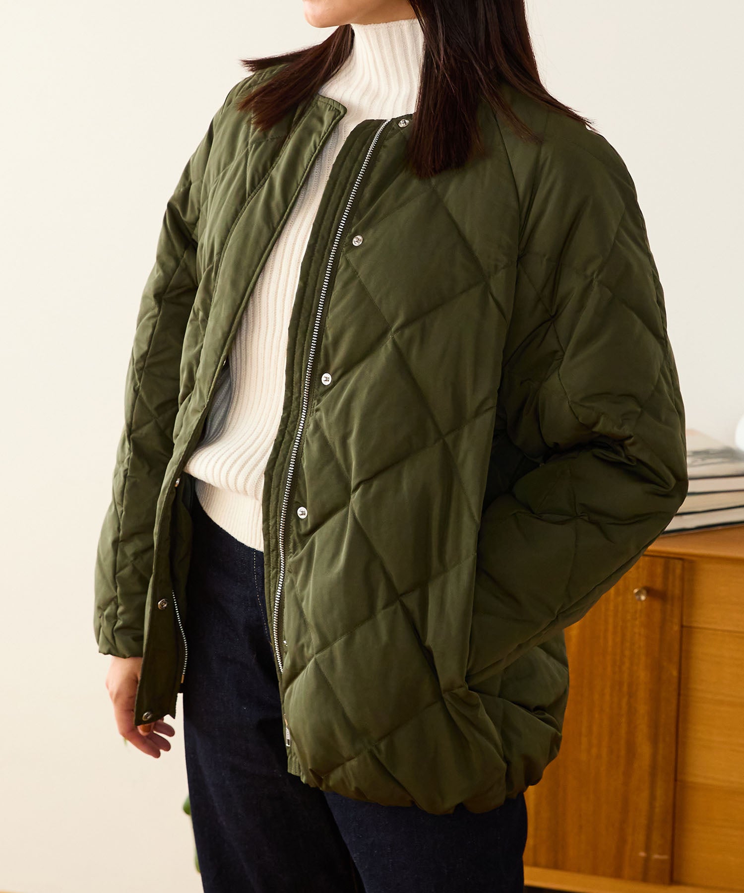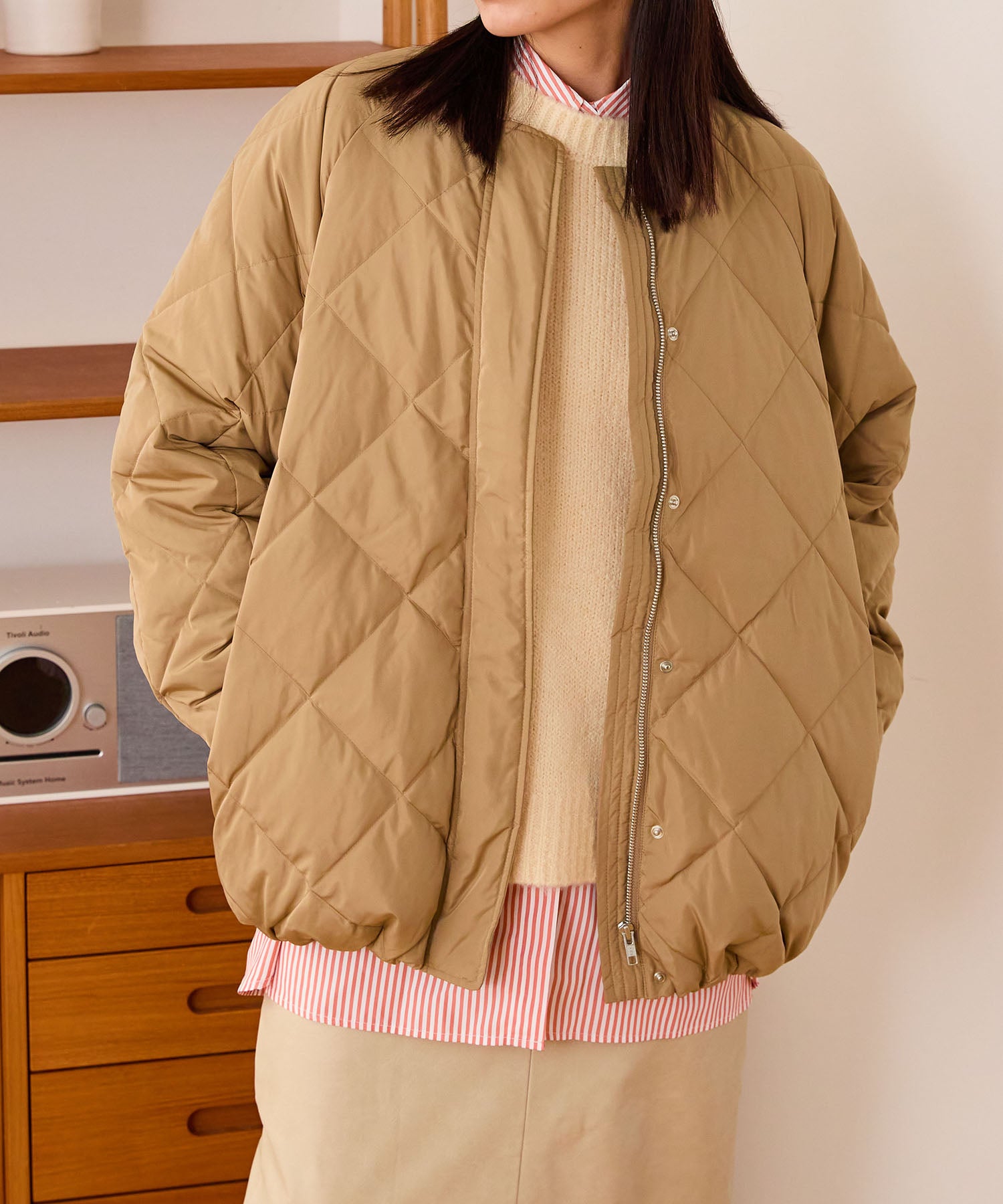 カジュアルにさっと羽織れるキルティングジャケットは、ノーカラーでカットソーやタートルネックとの相性も抜群。お尻が隠れるくらいの着丈で細身のパンツとも安心して合わせられるのが嬉しい。袖口や裾にギャザーを入れることで風を通しにくいような仕様に。程よいゆったり感はありつつも、女性らしいシルエットを叶えたアイテムは、この冬活躍すること間違いなし。
