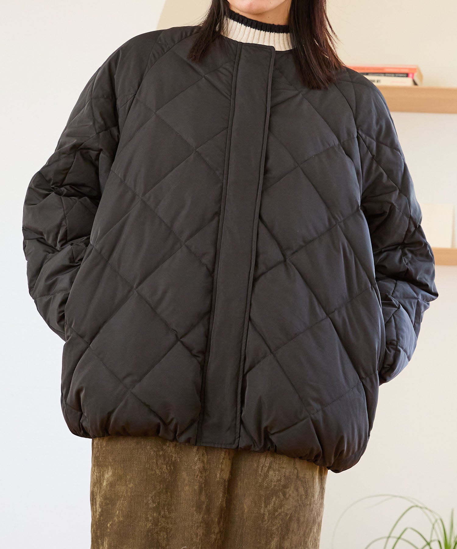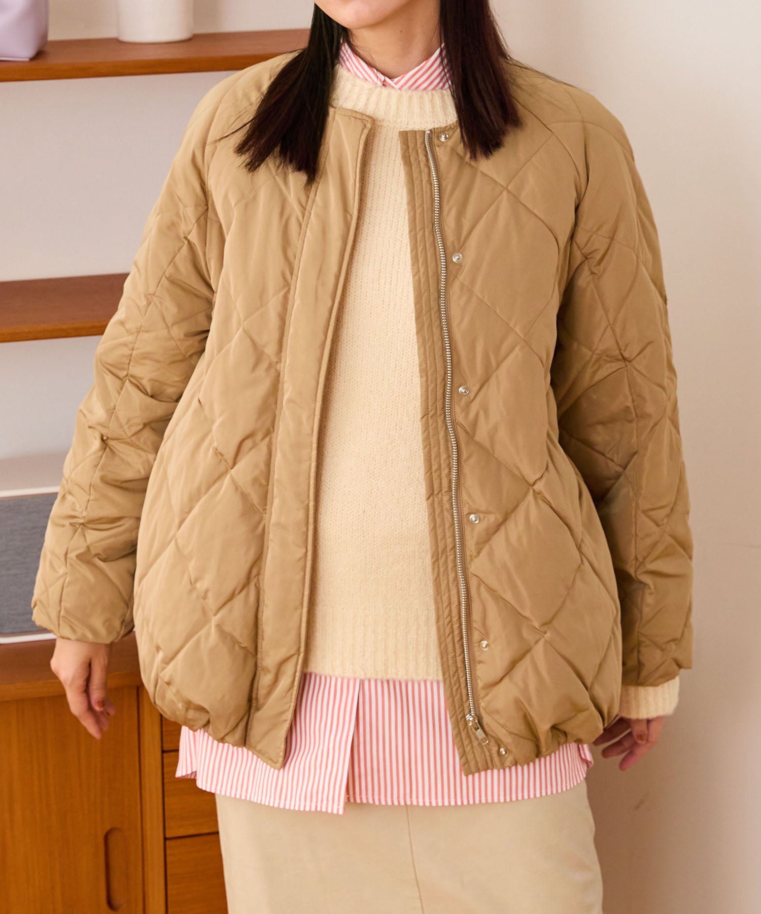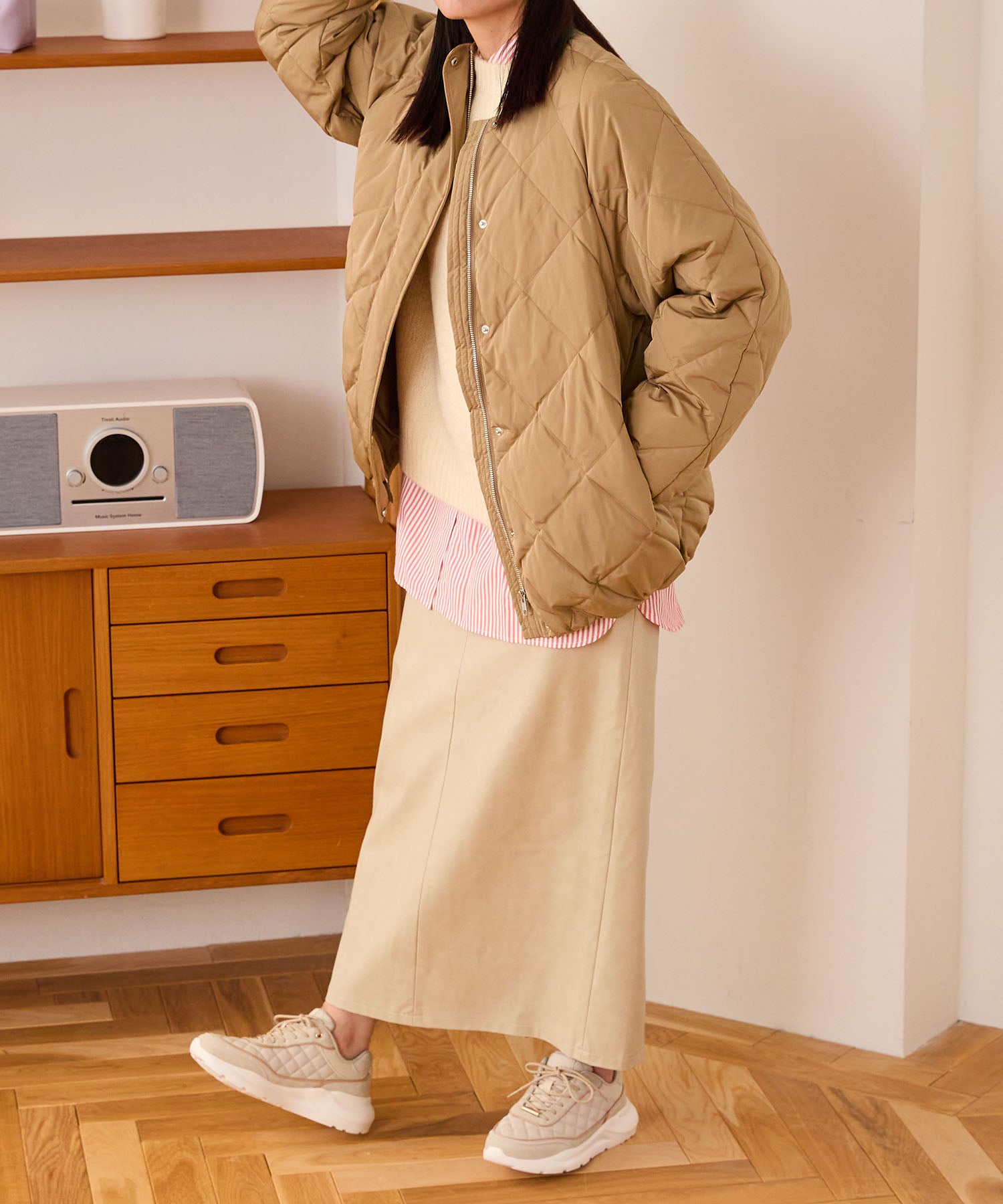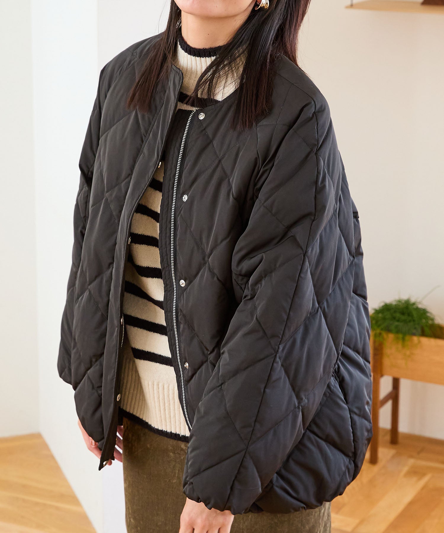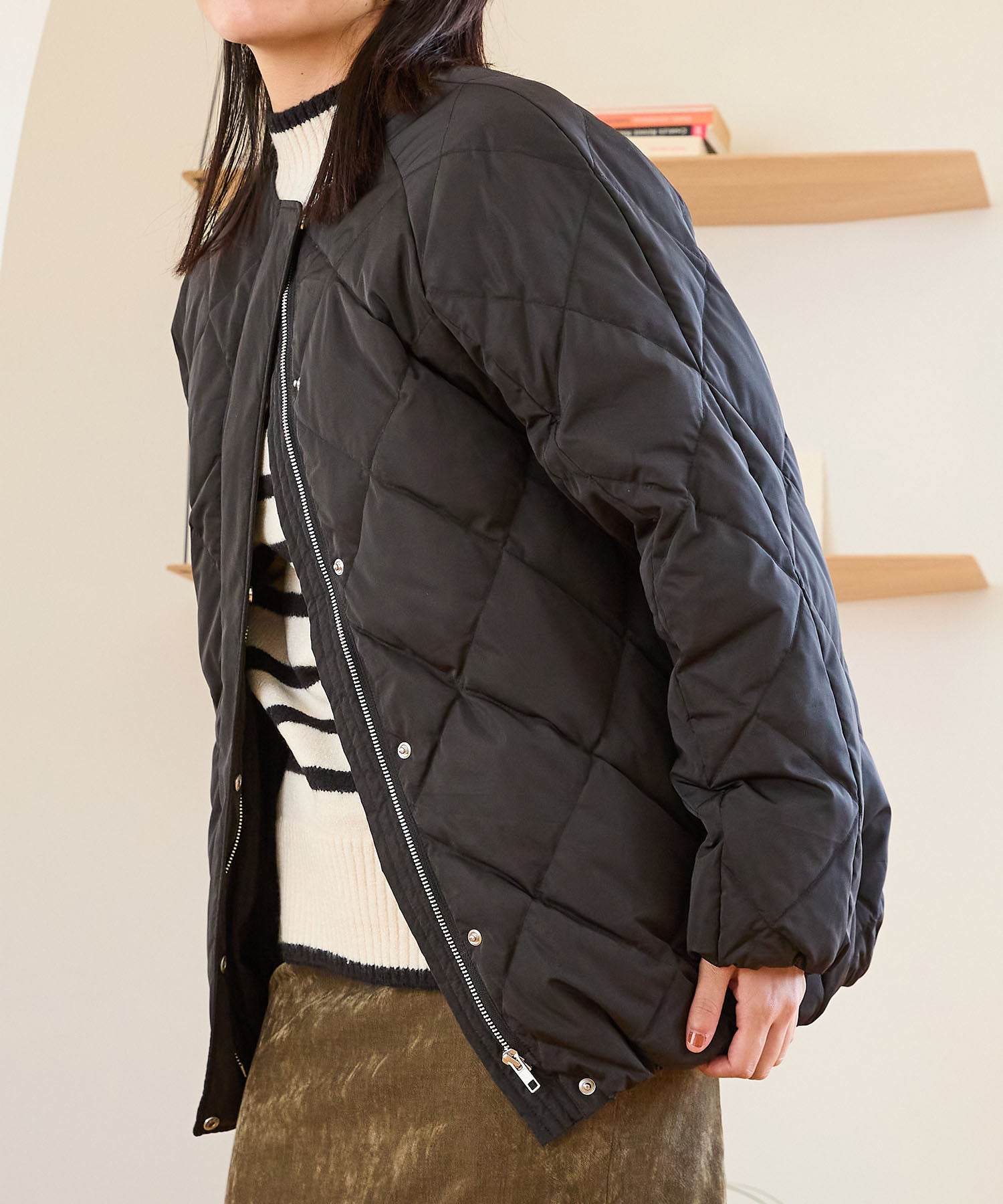 カジュアルにさっと羽織れるキルティングジャケットは、ノーカラーでカットソーやタートルネックとの相性も抜群。お尻が隠れるくらいの着丈で細身のパンツとも安心して合わせられるのが嬉しい。袖口や裾にギャザーを入れることで風を通しにくいような仕様に。程よいゆったり感はありつつも、女性らしいシルエットを叶えたアイテムは、この冬活躍すること間違いなし。