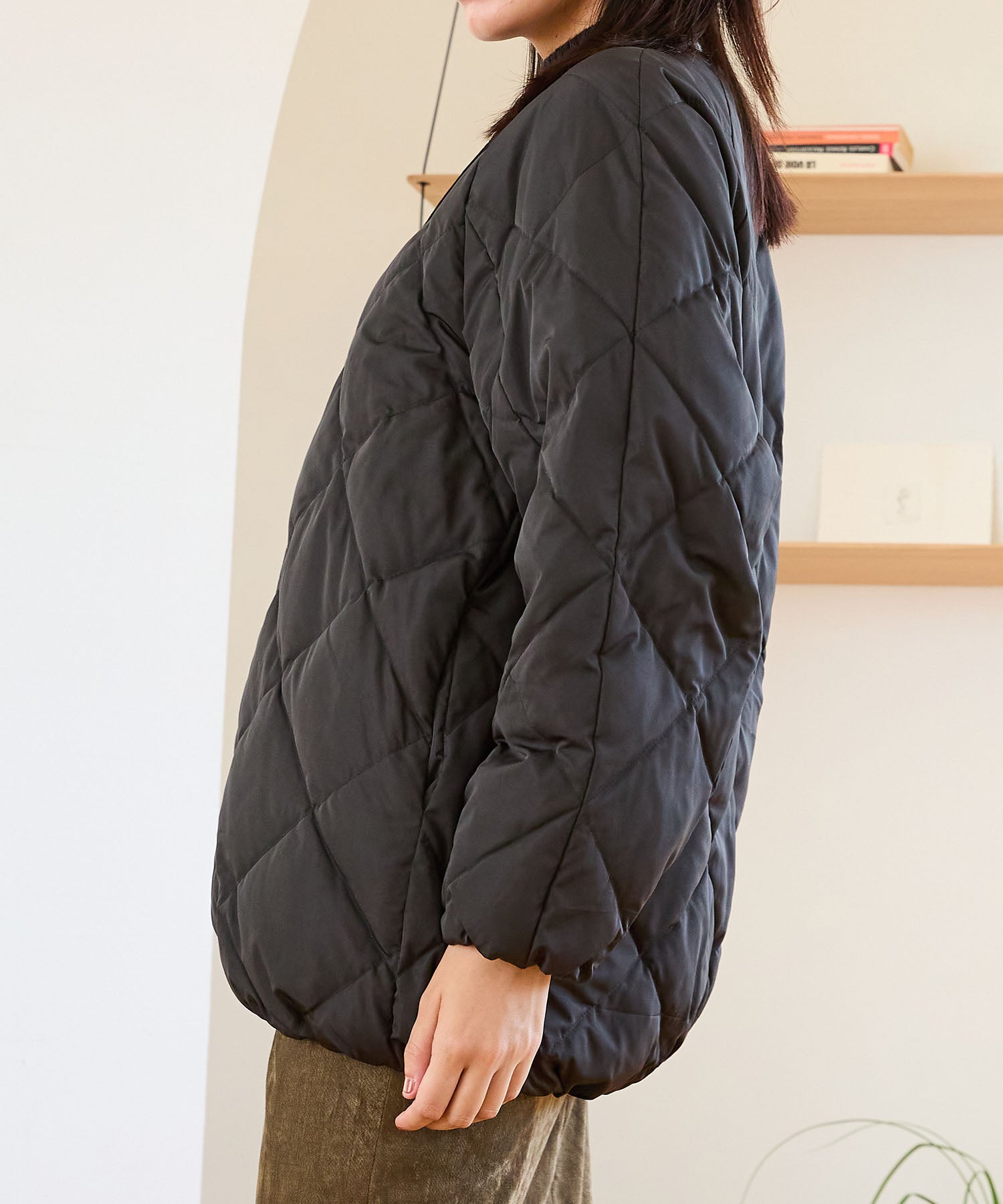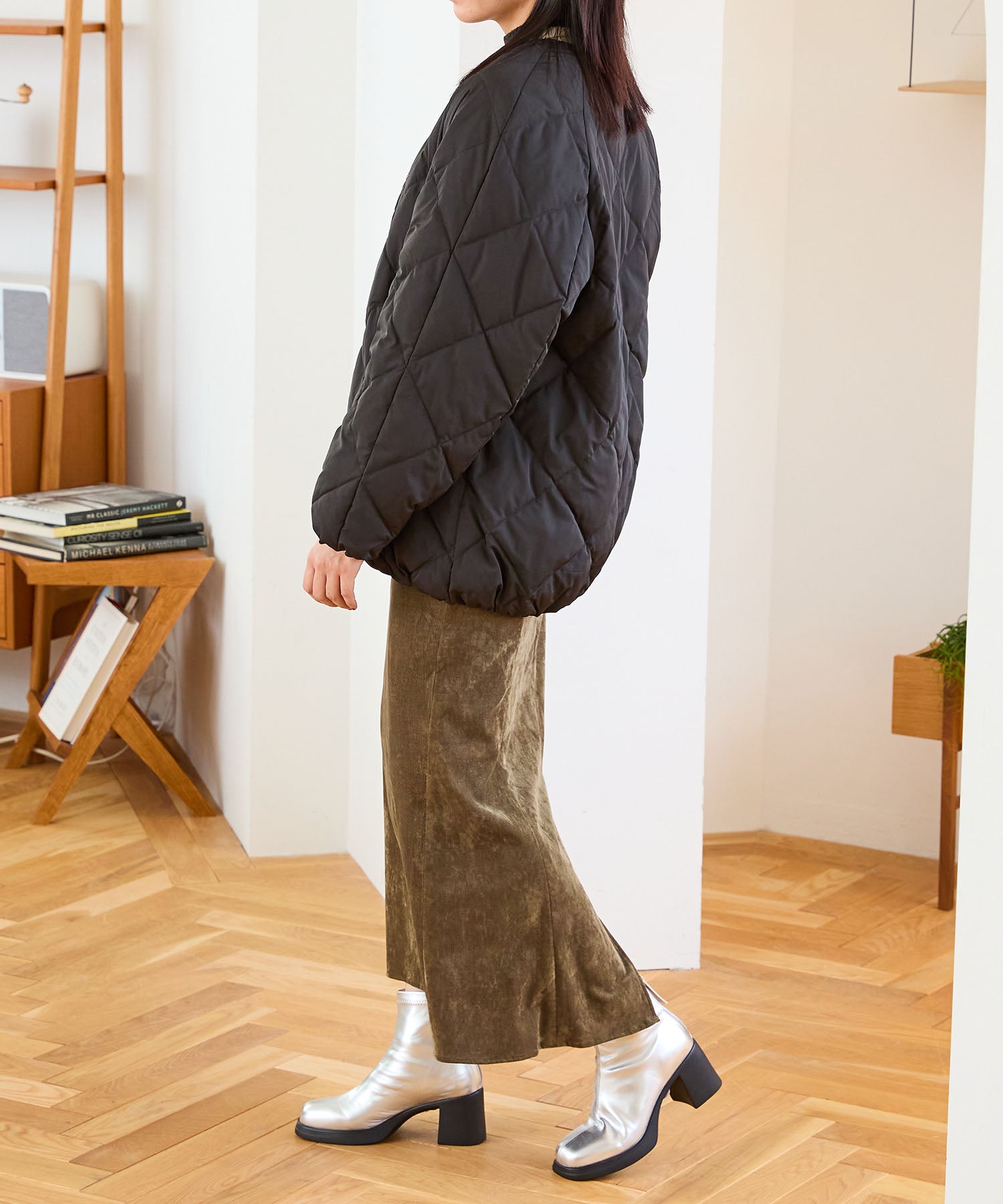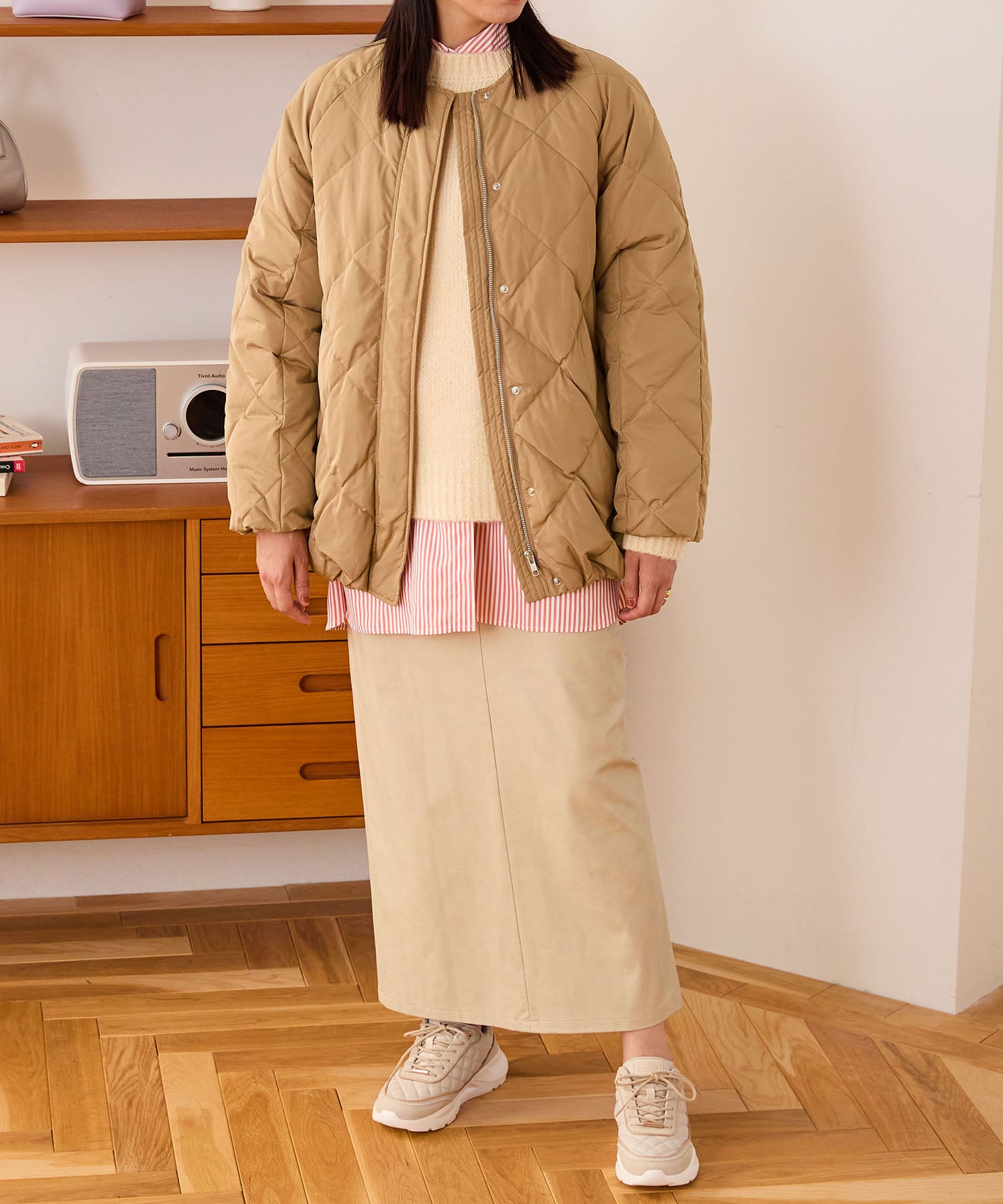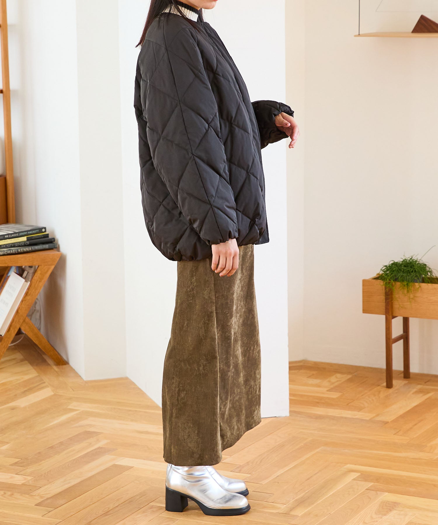 カジュアルにさっと羽織れるキルティングジャケットは、ノーカラーでカットソーやタートルネックとの相性も抜群。お尻が隠れるくらいの着丈で細身のパンツとも安心して合わせられるのが嬉しい。袖口や裾にギャザーを入れることで風を通しにくいような仕様に。程よいゆったり感はありつつも、女性らしいシルエットを叶えたアイテムは、この冬活躍すること間違いなし。