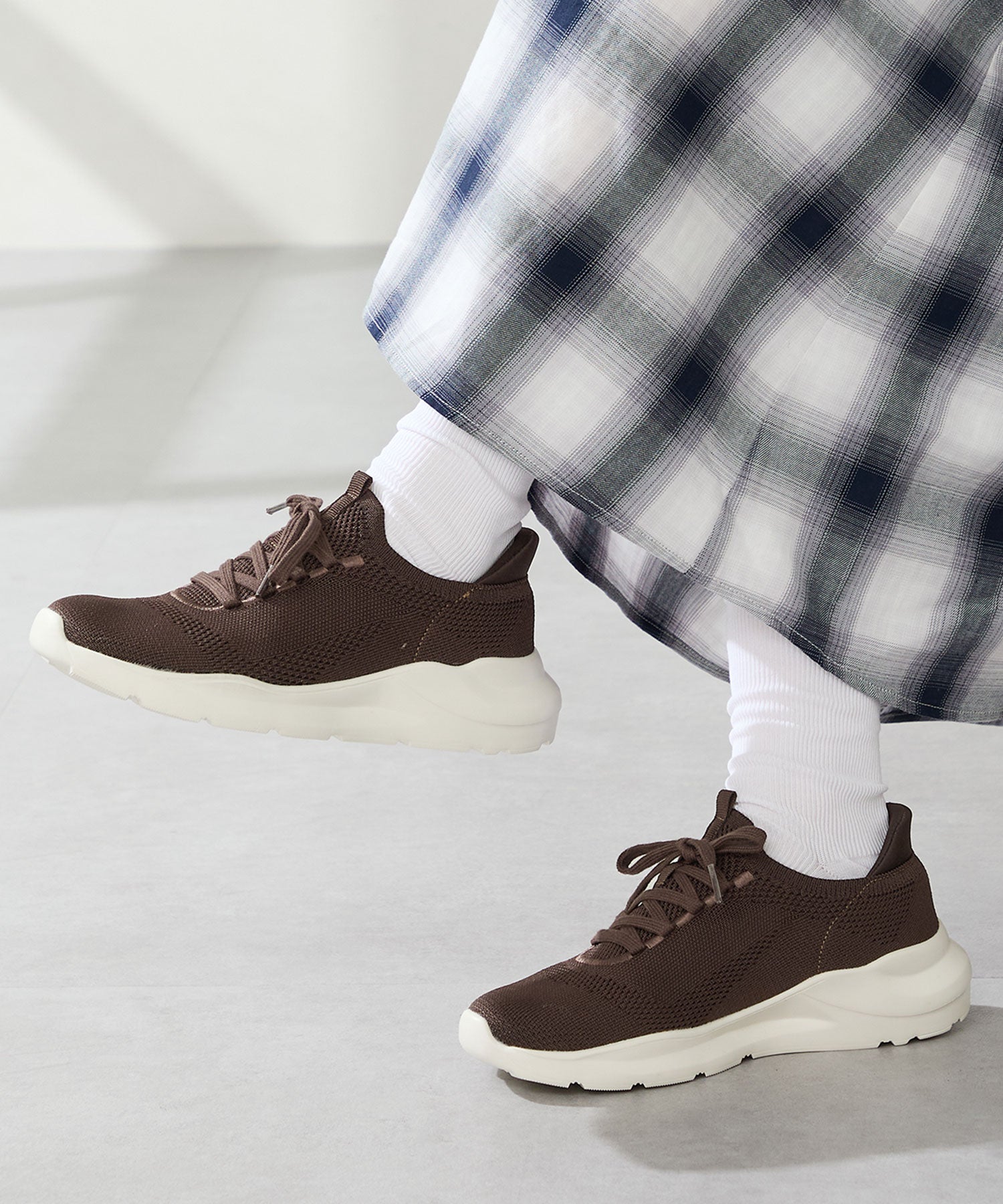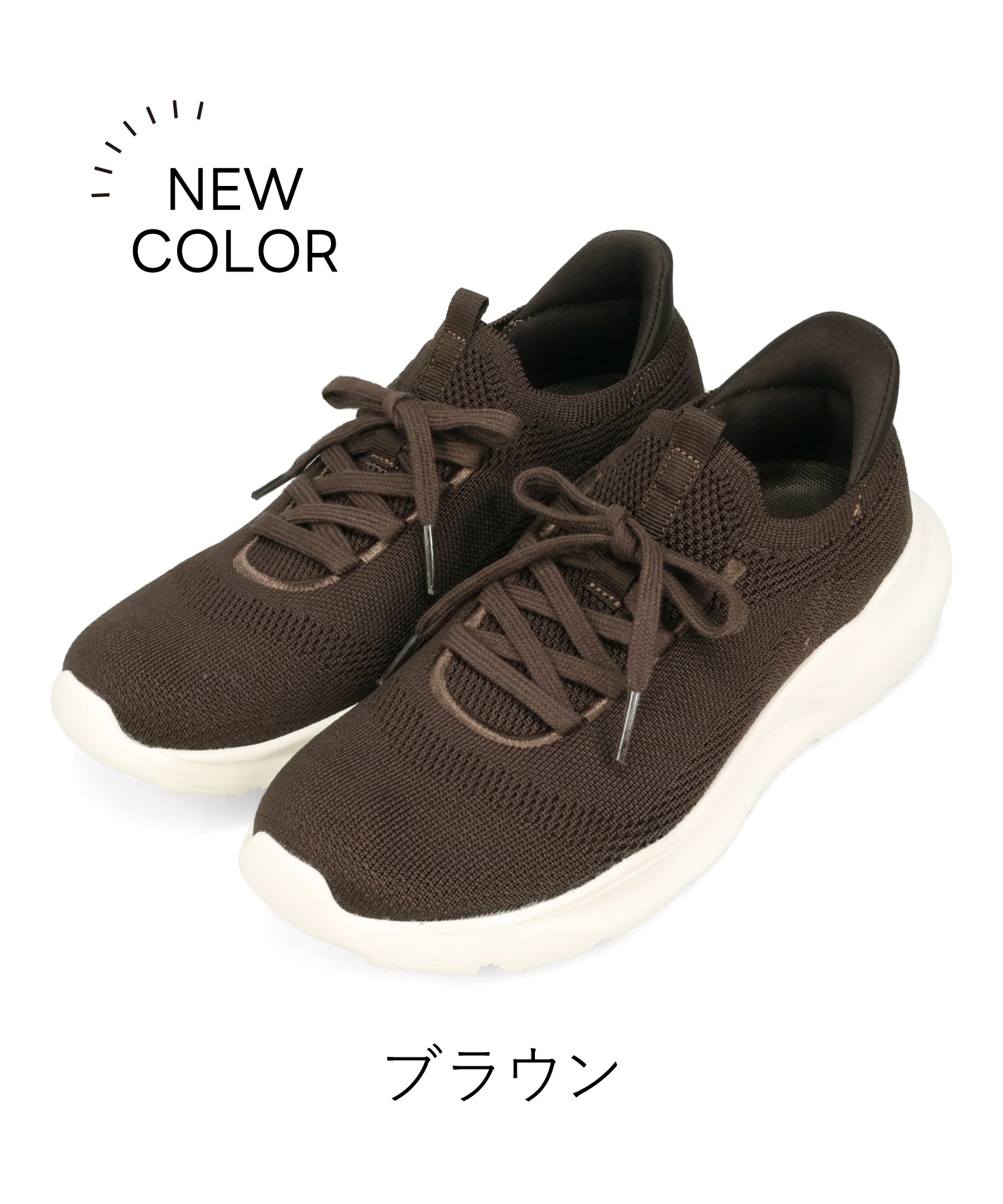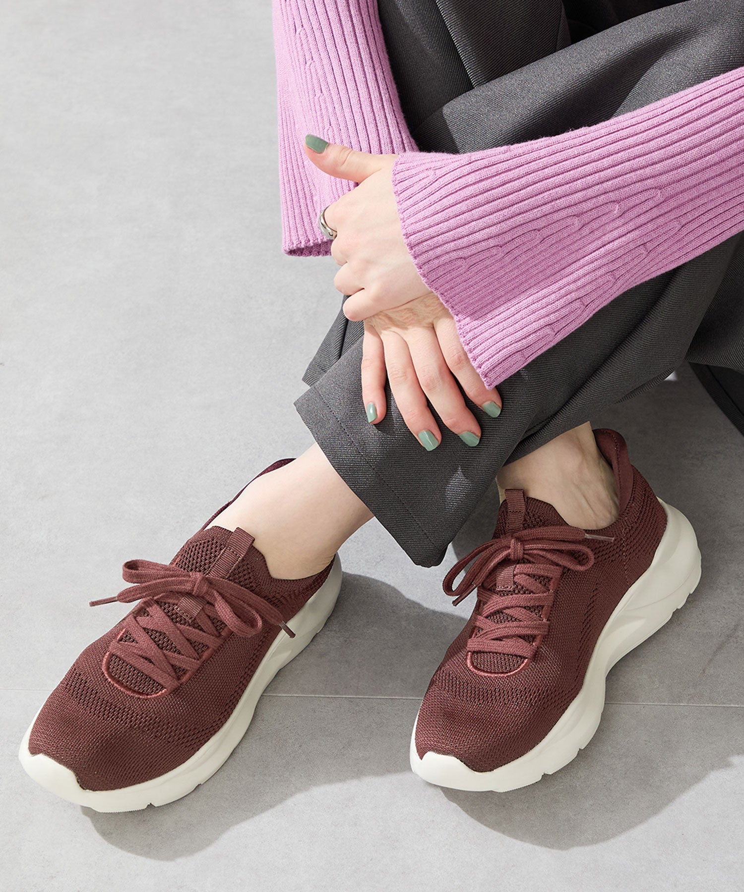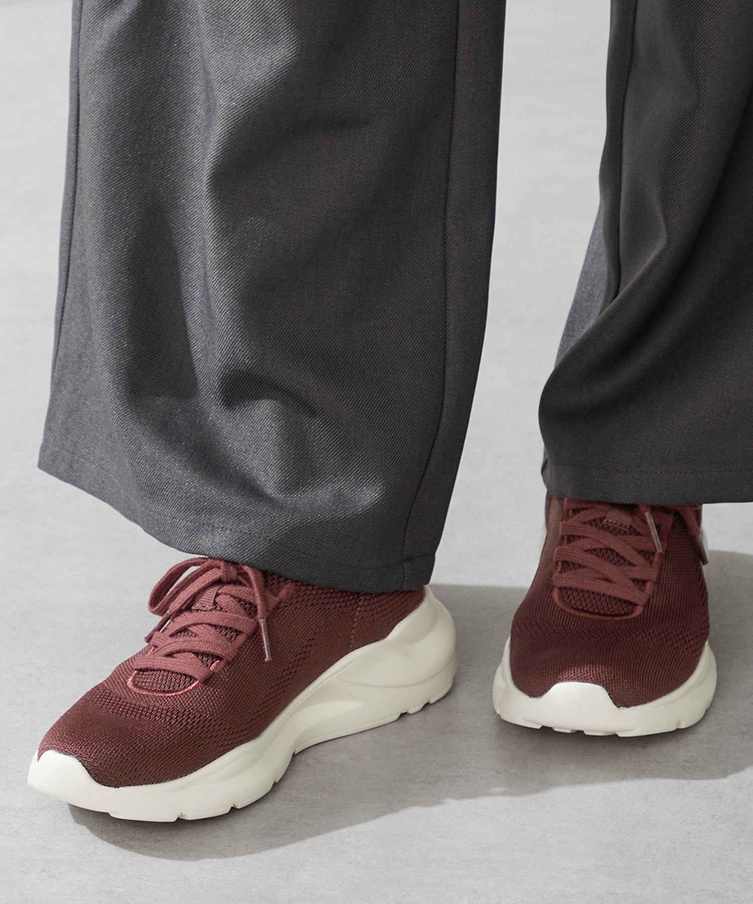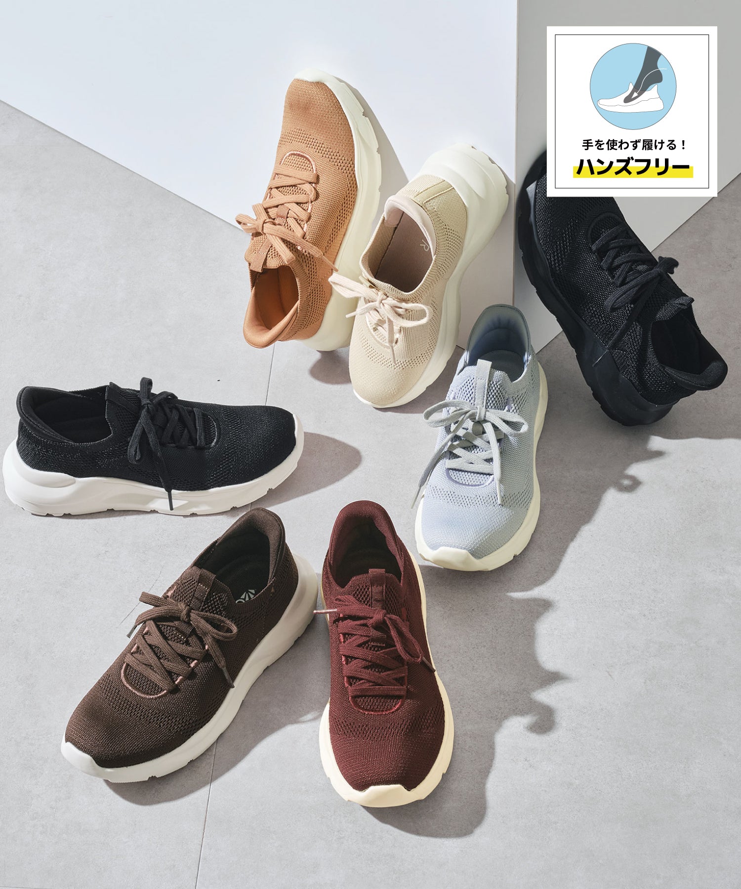 フィット感のあるニット素材と、さっと履けるハンズフリー仕様で軽さと快適さを追求したスニーカーが登場。足当たりの柔らかいニットは伸縮性があるので馴染みやすく、オリジナルの編み目の模様は凹凸感のあるものにすることでメリハリのある印象に。ニットなので通気性が良く、中敷は厚みのあるクッションを全体に入れているので沢山歩くシーンでも活躍する1足。更にレースアップ部分は紐で調節が可能で自身の足に合わせて変えられるのも嬉しいポイント。履き口がよく伸びるうえに、踵にはオリジナル設計の芯を入れることで手を使わずに立ったまま一瞬で履ける仕様に。フィット感にとことんこだわり、今までにない感動の履き心地を実現したスニーカー。ソールまで単色でまとめたブラック/ブラックと、深みのある色合いが魅力のブラウンとワインを加えた選べる7カラー展開。