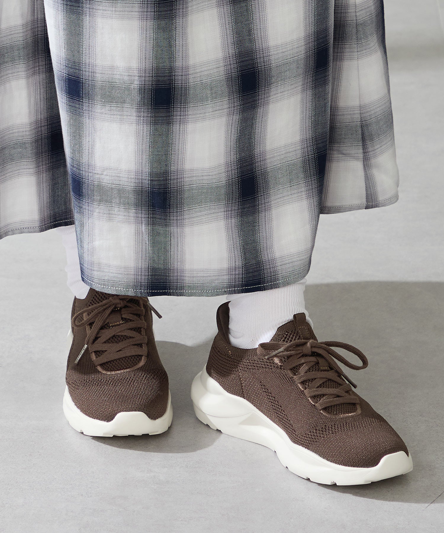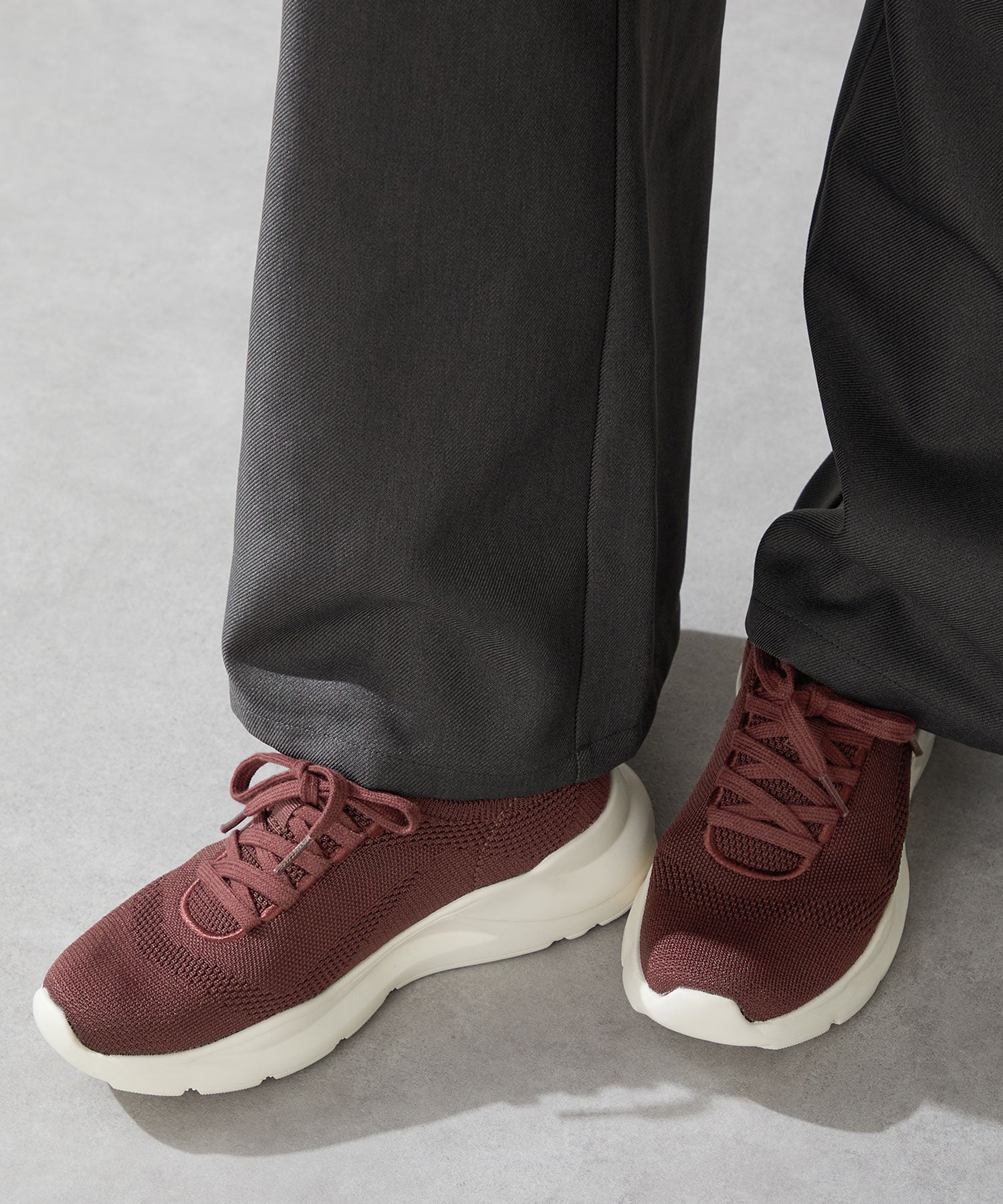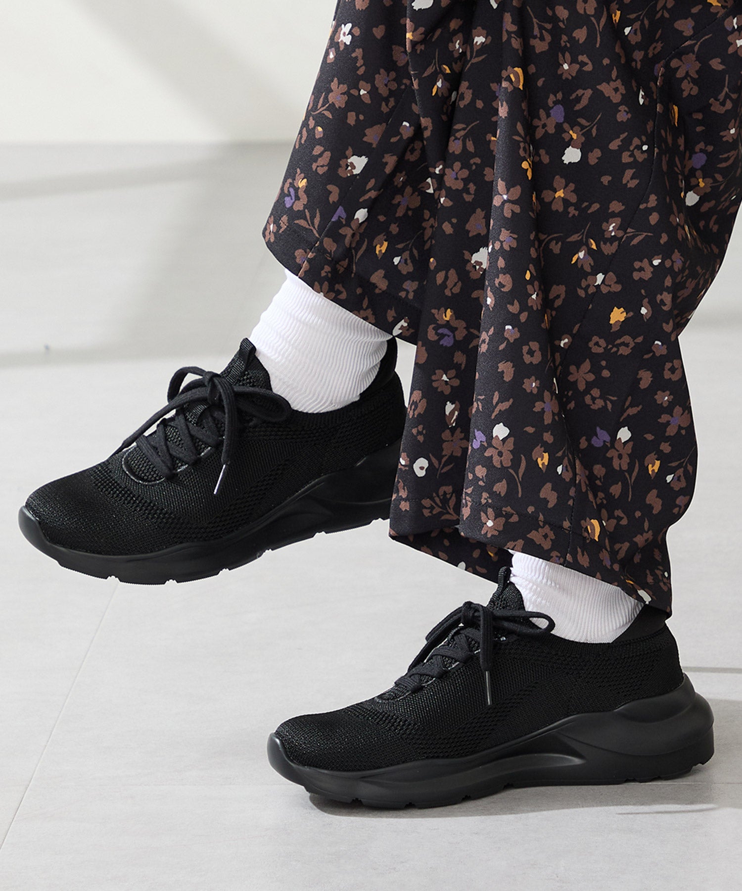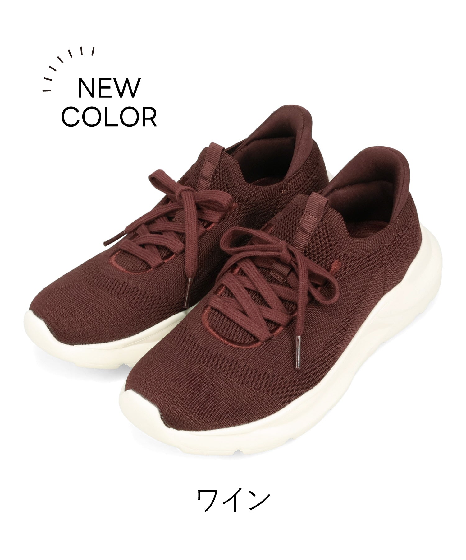 フィット感のあるニット素材と、さっと履けるハンズフリー仕様で軽さと快適さを追求したスニーカーが登場。足当たりの柔らかいニットは伸縮性があるので馴染みやすく、オリジナルの編み目の模様は凹凸感のあるものにすることでメリハリのある印象に。ニットなので通気性が良く、中敷は厚みのあるクッションを全体に入れているので沢山歩くシーンでも活躍する1足。更にレースアップ部分は紐で調節が可能で自身の足に合わせて変えられるのも嬉しいポイント。履き口がよく伸びるうえに、踵にはオリジナル設計の芯を入れることで手を使わずに立ったまま一瞬で履ける仕様に。フィット感にとことんこだわり、今までにない感動の履き心地を実現したスニーカー。ソールまで単色でまとめたブラック/ブラックと、深みのある色合いが魅力のブラウンとワインを加えた選べる7カラー展開。