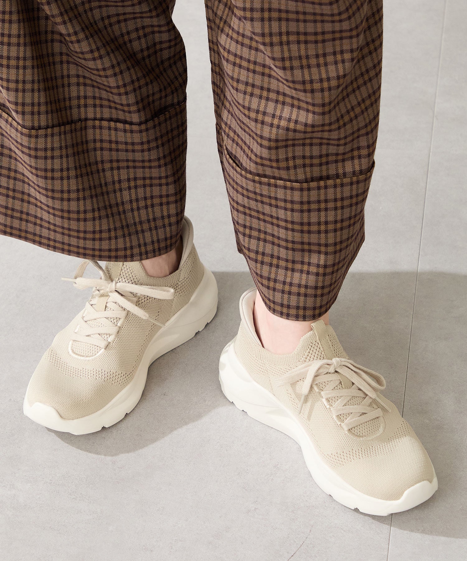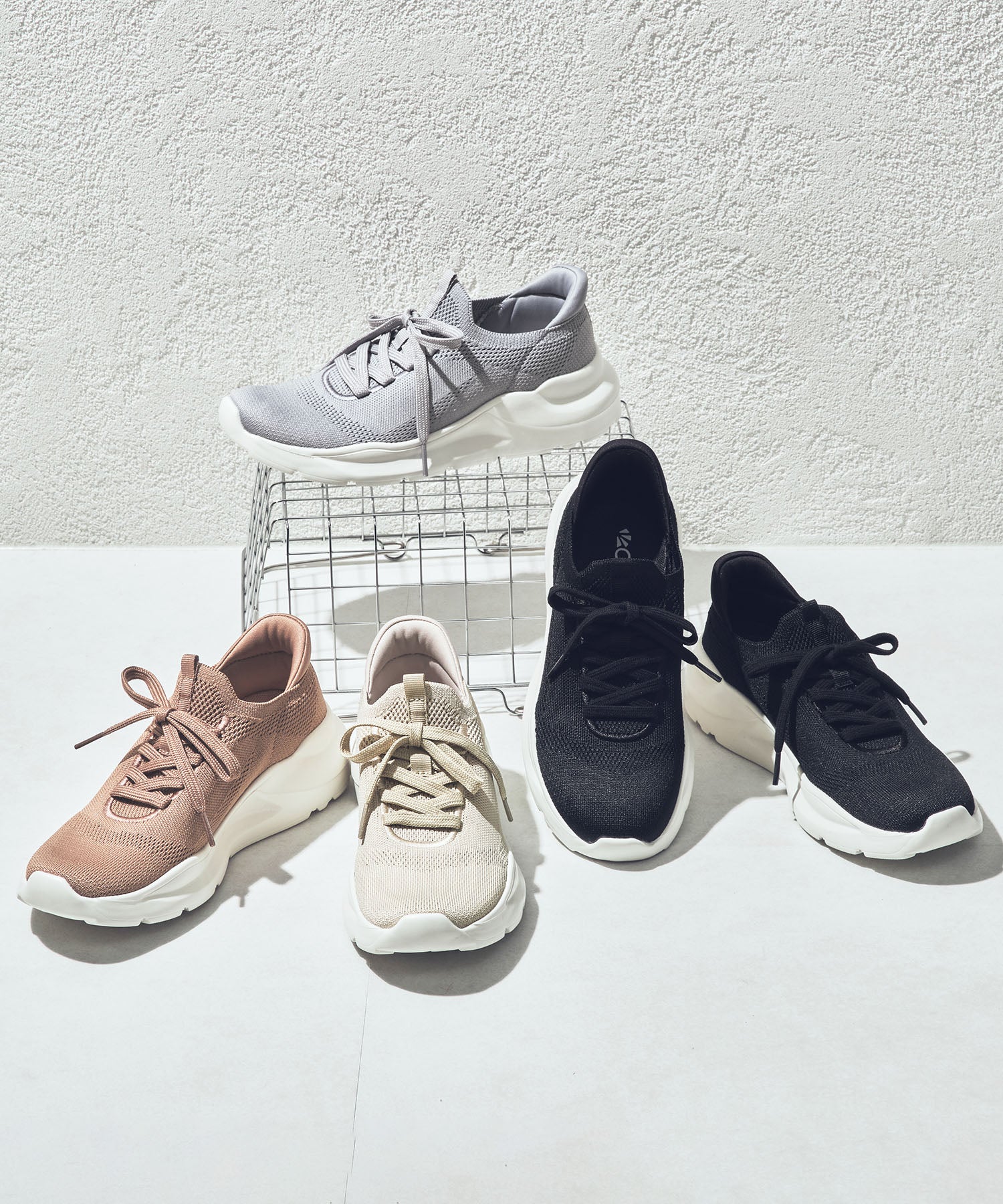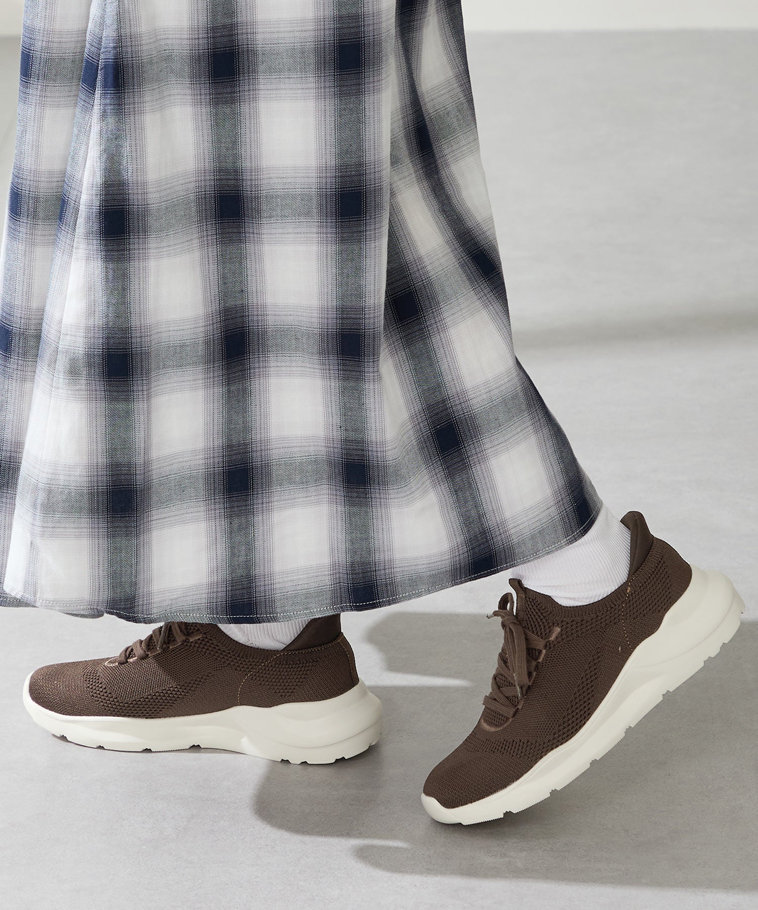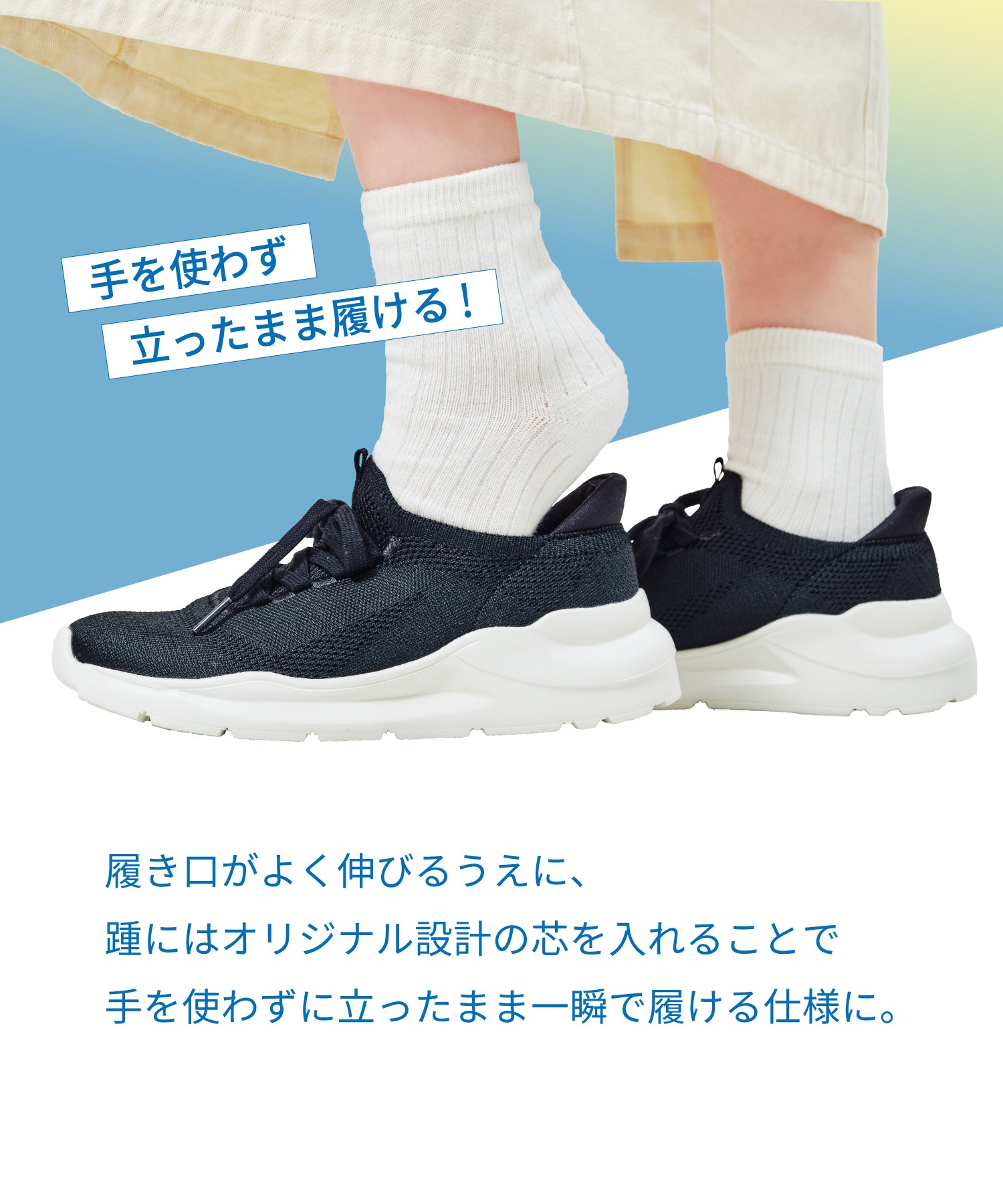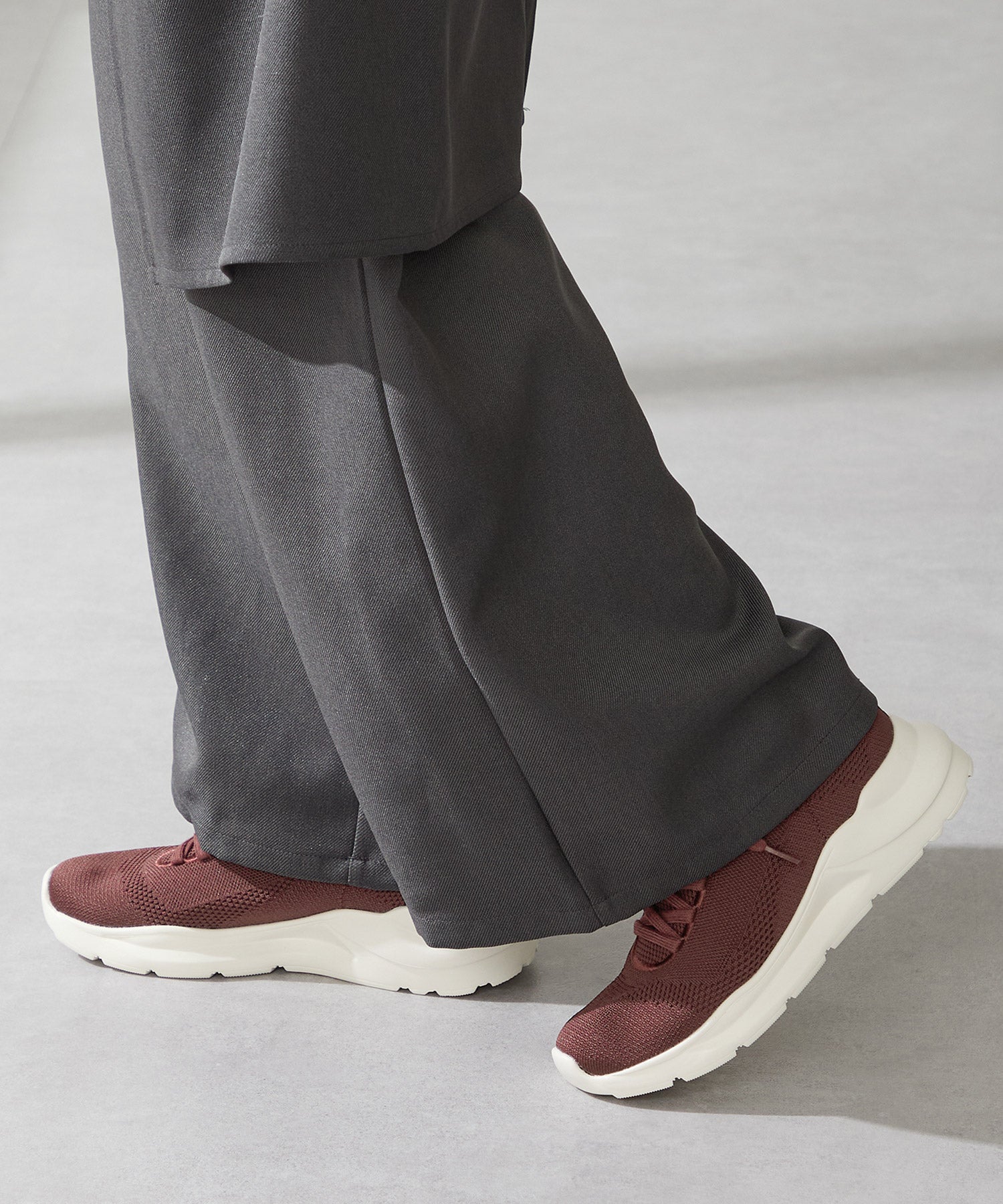 フィット感のあるニット素材と、さっと履けるハンズフリー仕様で軽さと快適さを追求したスニーカーが登場。足当たりの柔らかいニットは伸縮性があるので馴染みやすく、オリジナルの編み目の模様は凹凸感のあるものにすることでメリハリのある印象に。ニットなので通気性が良く、中敷は厚みのあるクッションを全体に入れているので沢山歩くシーンでも活躍する1足。更にレースアップ部分は紐で調節が可能で自身の足に合わせて変えられるのも嬉しいポイント。履き口がよく伸びるうえに、踵にはオリジナル設計の芯を入れることで手を使わずに立ったまま一瞬で履ける仕様に。フィット感にとことんこだわり、今までにない感動の履き心地を実現したスニーカー。ソールまで単色でまとめたブラック/ブラックと、深みのある色合いが魅力のブラウンとワインを加えた選べる7カラー展開。