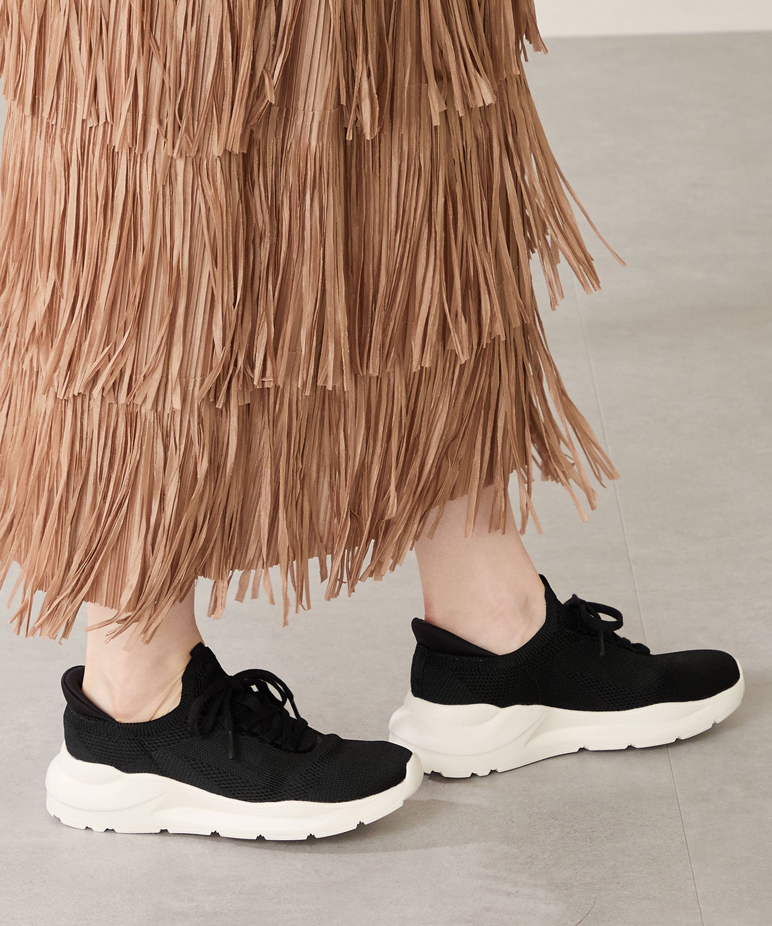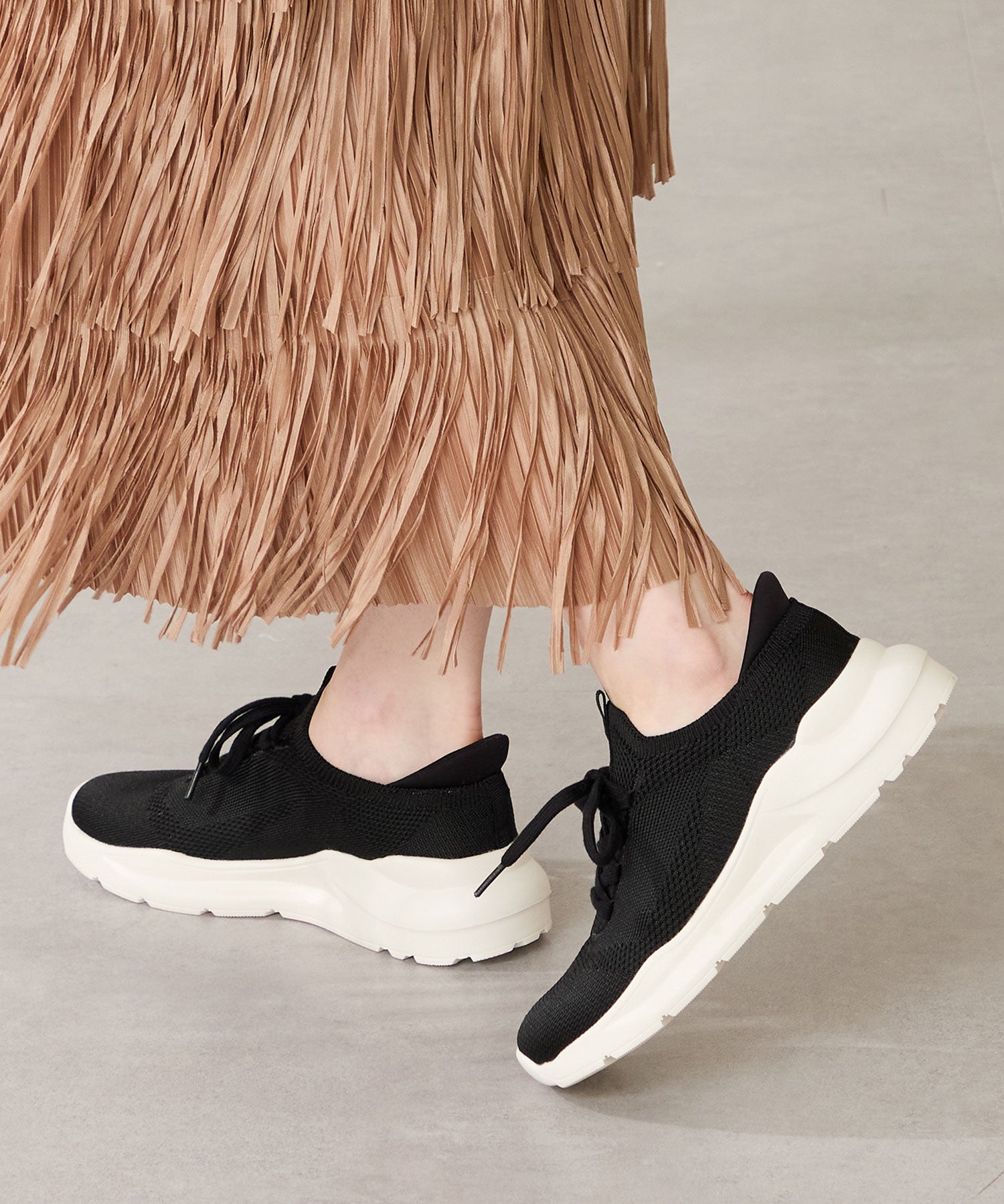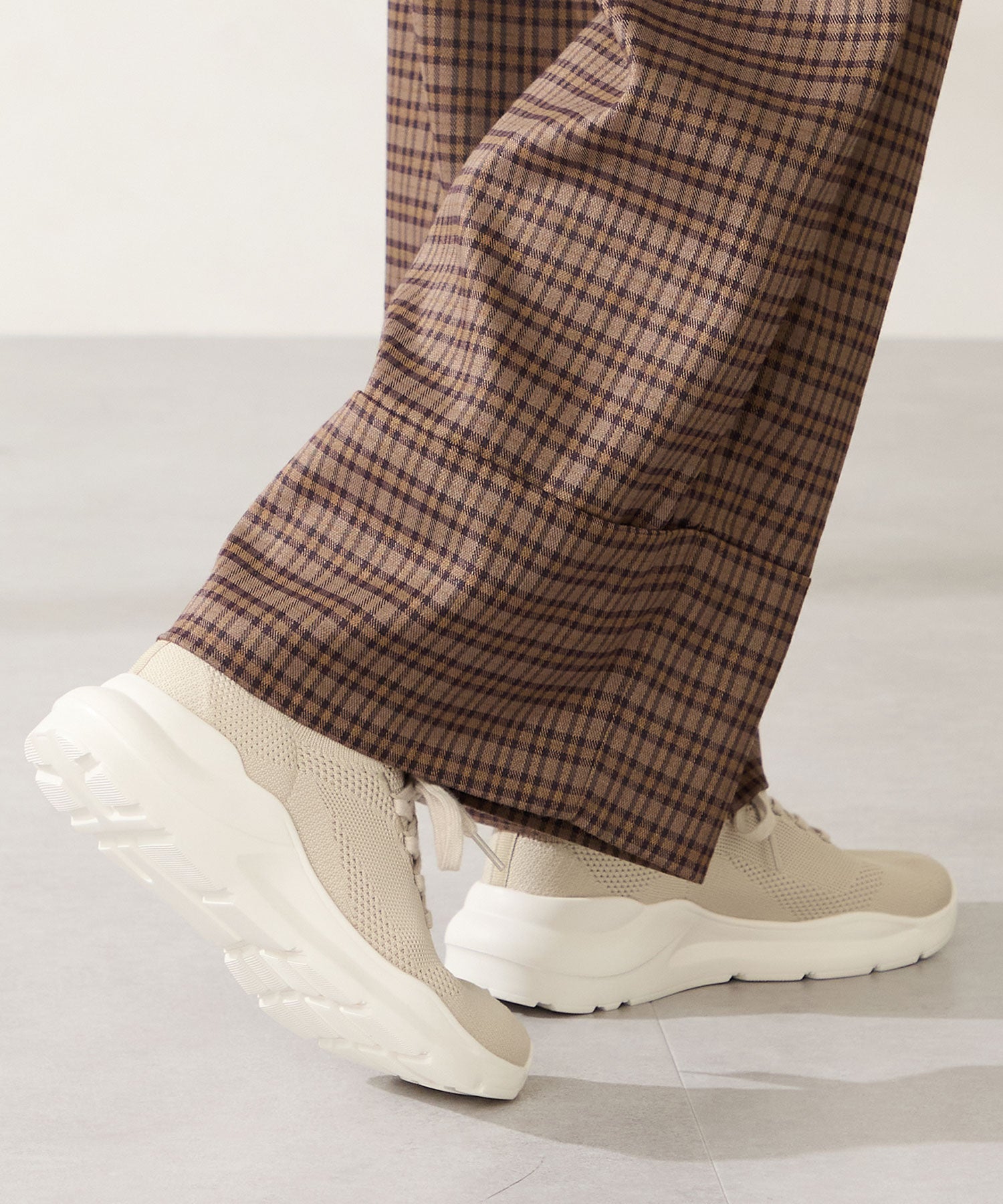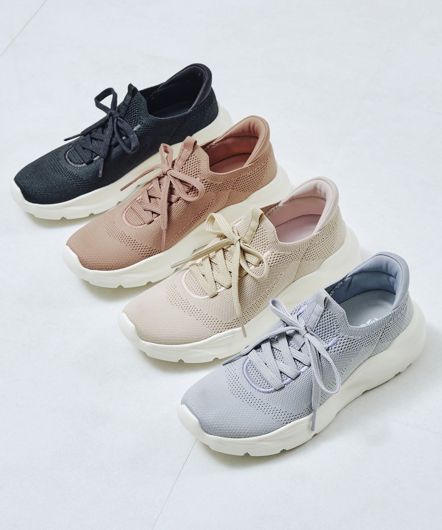 フィット感のあるニット素材と、さっと履けるハンズフリー仕様で軽さと快適さを追求したスニーカーが登場。足当たりの柔らかいニットは伸縮性があるので馴染みやすく、オリジナルの編み目の模様は凹凸感のあるものにすることでメリハリのある印象に。ニットなので通気性が良く、中敷は厚みのあるクッションを全体に入れているので沢山歩くシーンでも活躍する1足。更にレースアップ部分は紐で調節が可能で自身の足に合わせて変えられるのも嬉しいポイント。履き口がよく伸びるうえに、踵にはオリジナル設計の芯を入れることで手を使わずに立ったまま一瞬で履ける仕様に。フィット感にとことんこだわり、今までにない感動の履き心地を実現したスニーカー。ソールまで単色でまとめたブラック/ブラックと、深みのある色合いが魅力のブラウンとワインを加えた選べる7カラー展開。