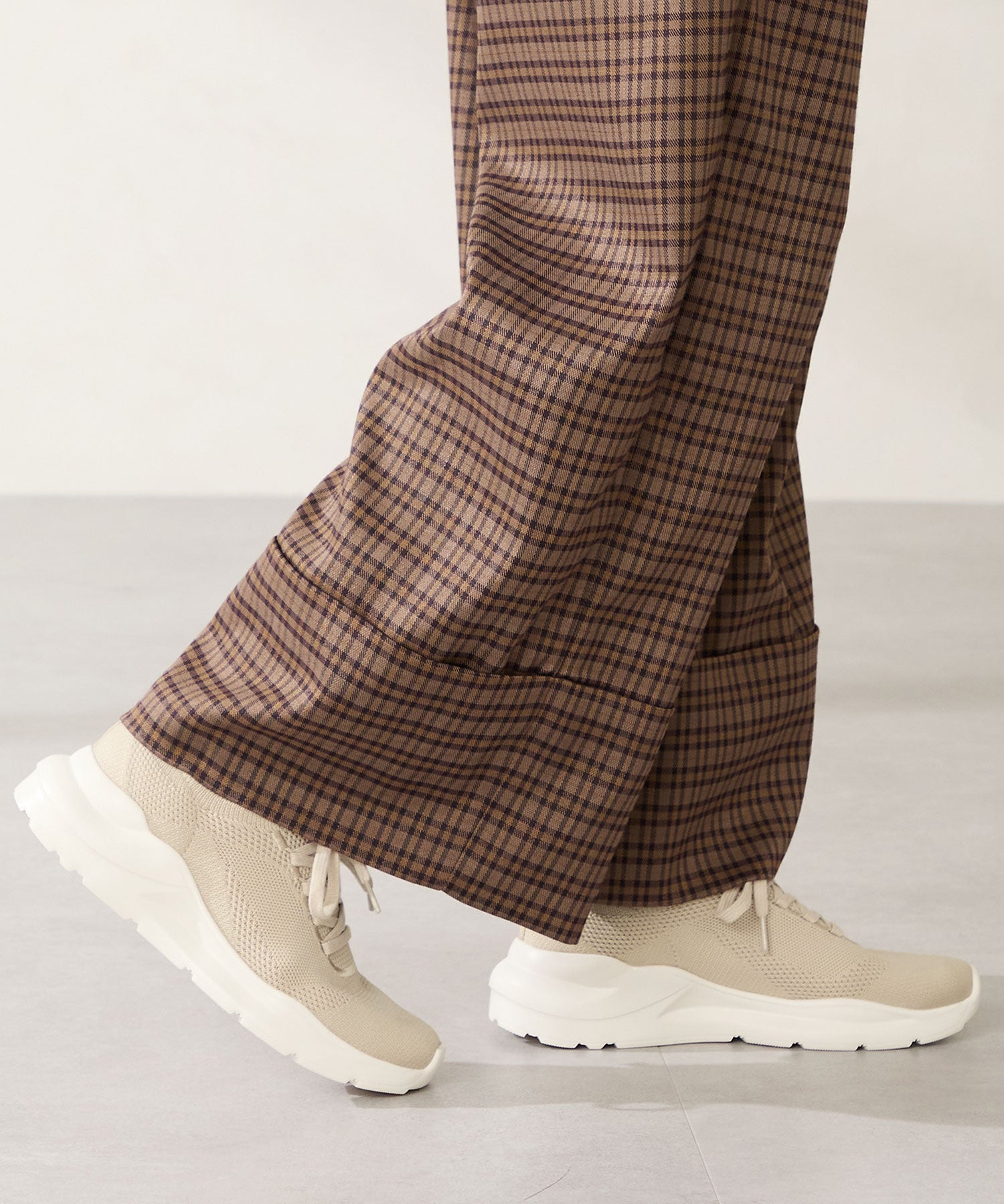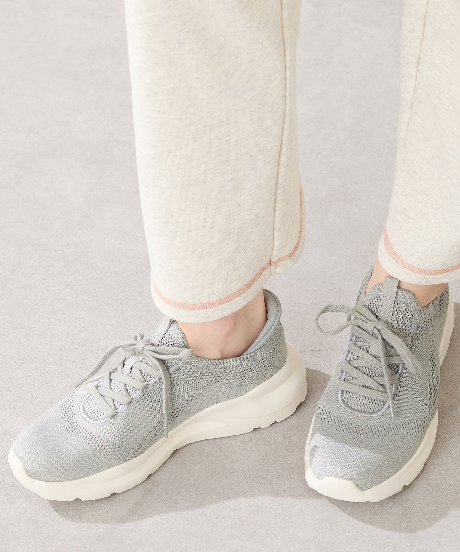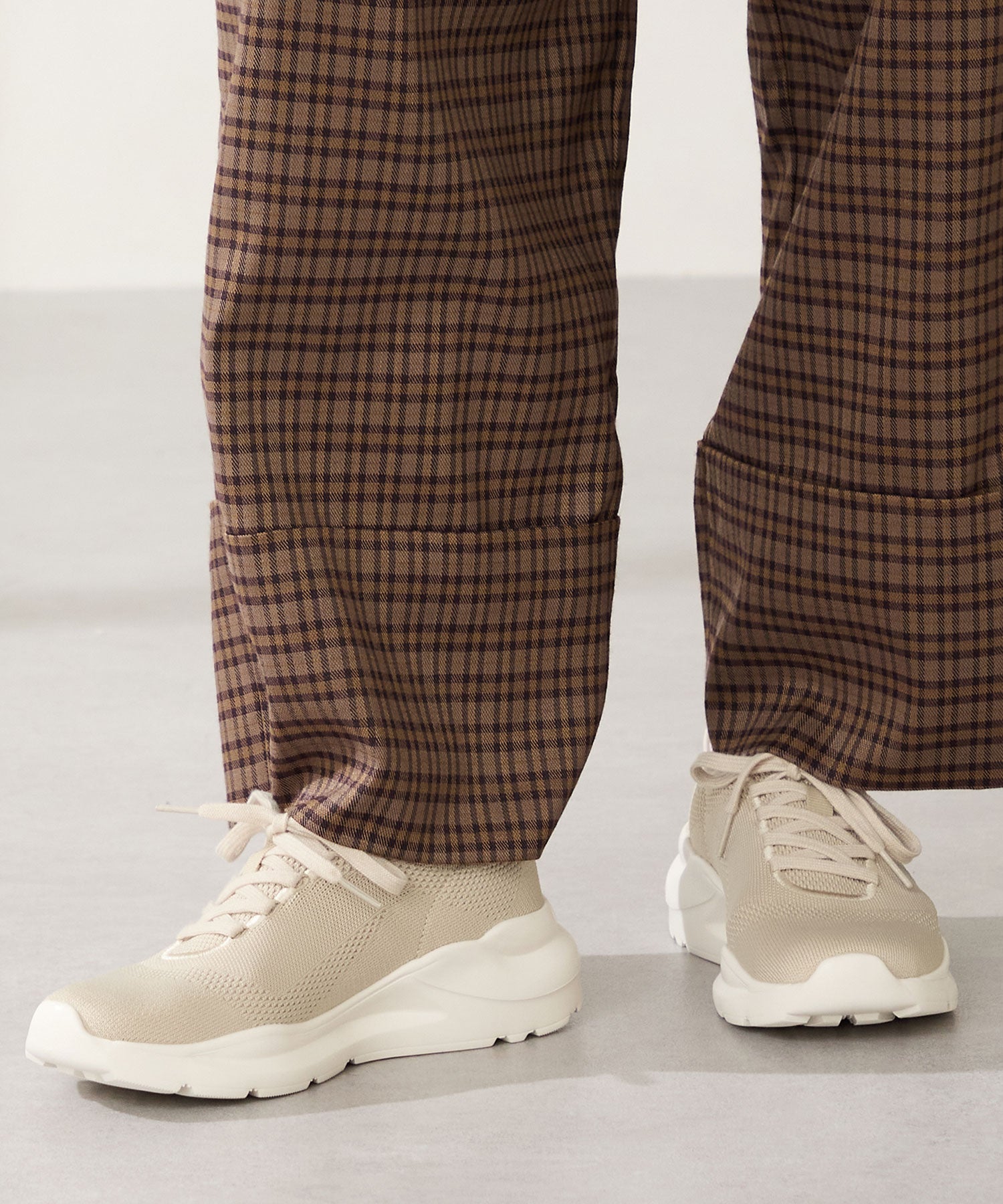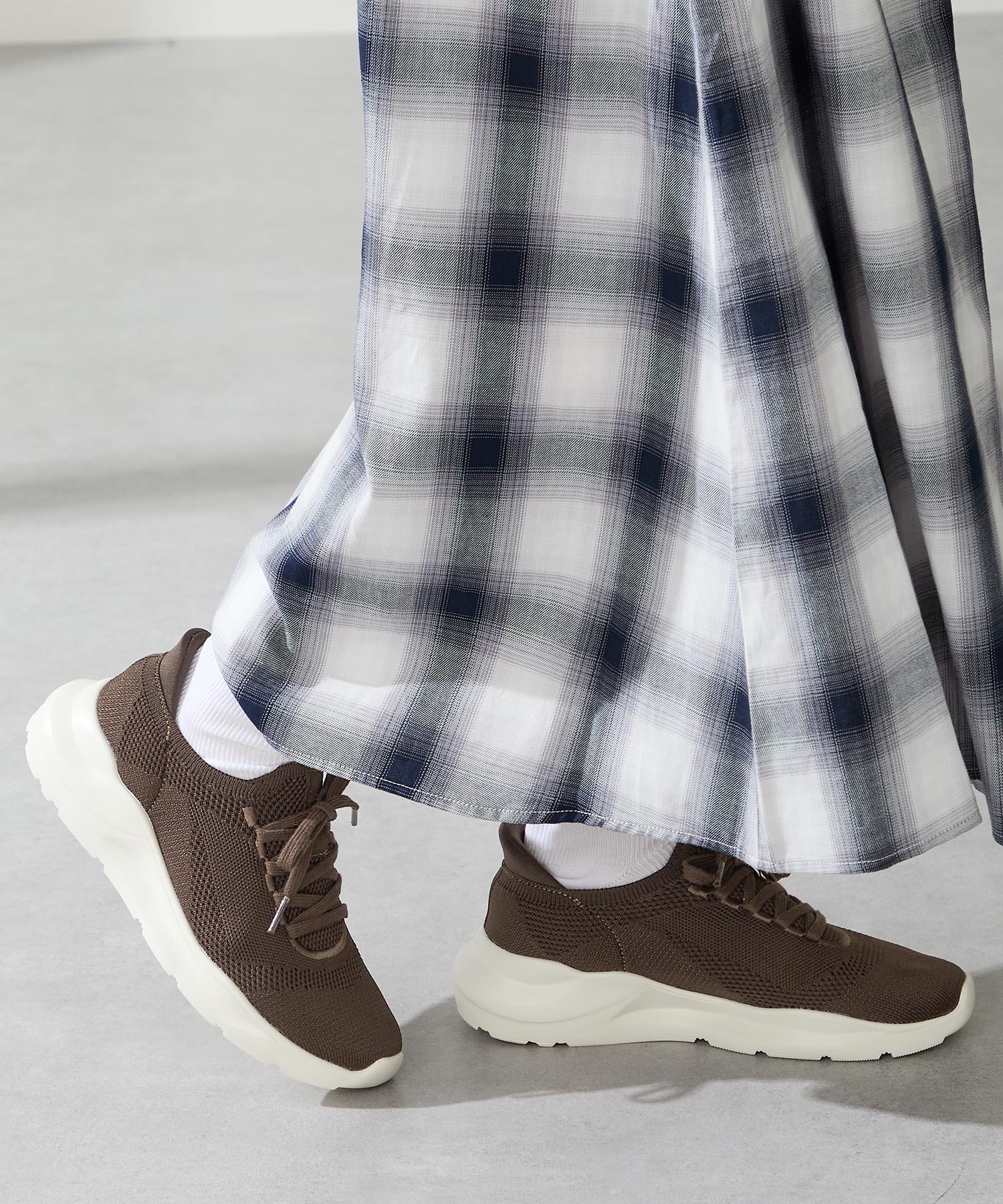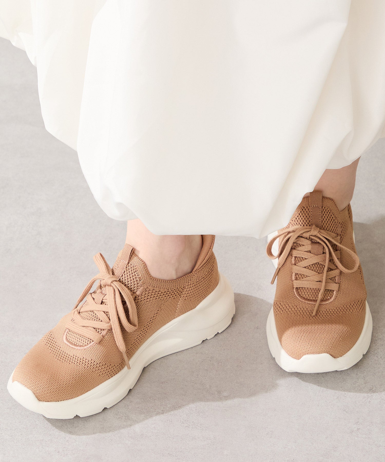 フィット感のあるニット素材と、さっと履けるハンズフリー仕様で軽さと快適さを追求したスニーカーが登場。足当たりの柔らかいニットは伸縮性があるので馴染みやすく、オリジナルの編み目の模様は凹凸感のあるものにすることでメリハリのある印象に。ニットなので通気性が良く、中敷は厚みのあるクッションを全体に入れているので沢山歩くシーンでも活躍する1足。更にレースアップ部分は紐で調節が可能で自身の足に合わせて変えられるのも嬉しいポイント。履き口がよく伸びるうえに、踵にはオリジナル設計の芯を入れることで手を使わずに立ったまま一瞬で履ける仕様に。フィット感にとことんこだわり、今までにない感動の履き心地を実現したスニーカー。ソールまで単色でまとめたブラック/ブラックと、深みのある色合いが魅力のブラウンとワインを加えた選べる7カラー展開。