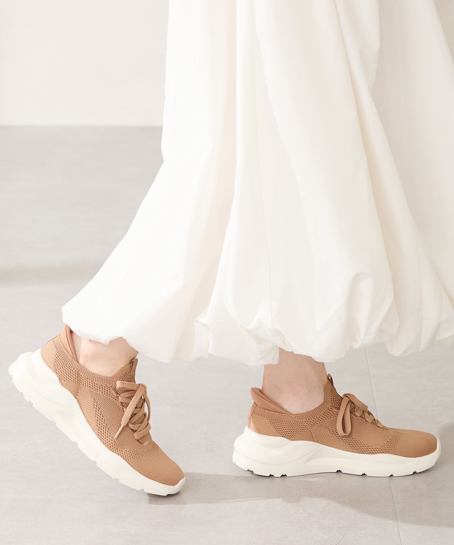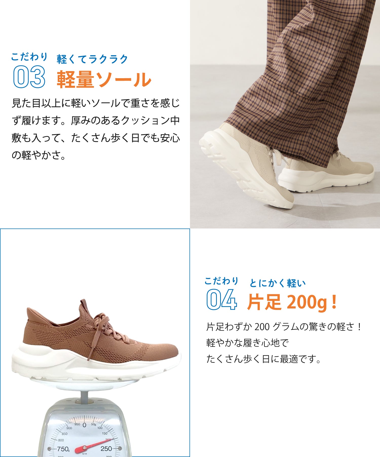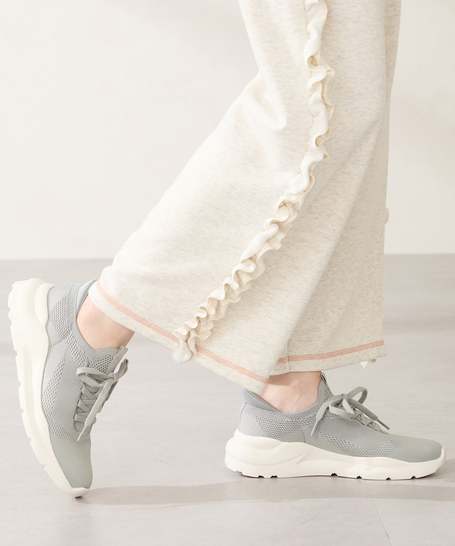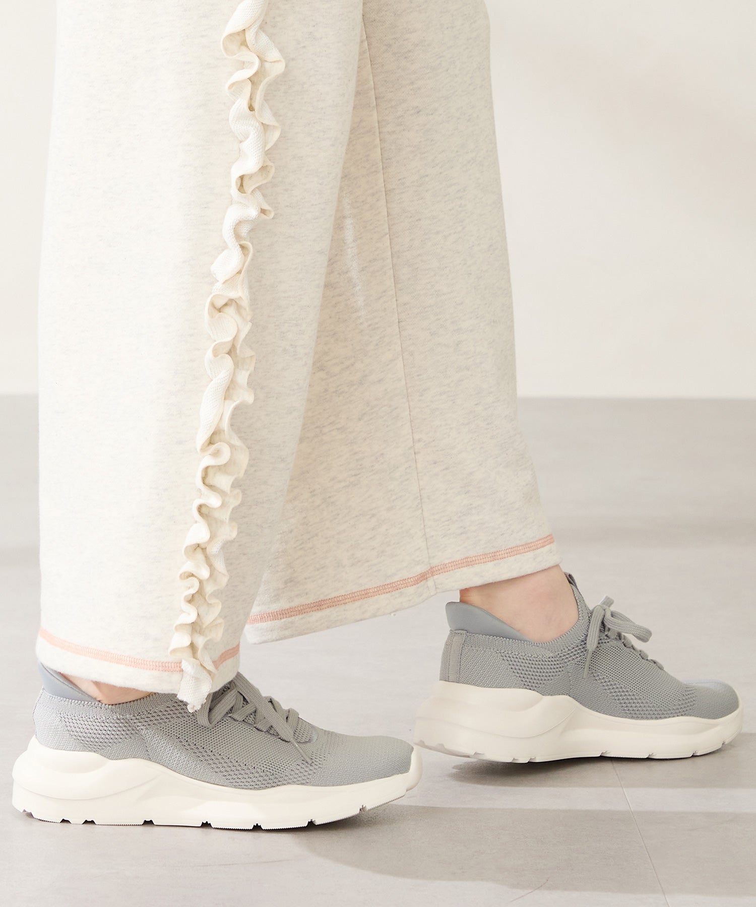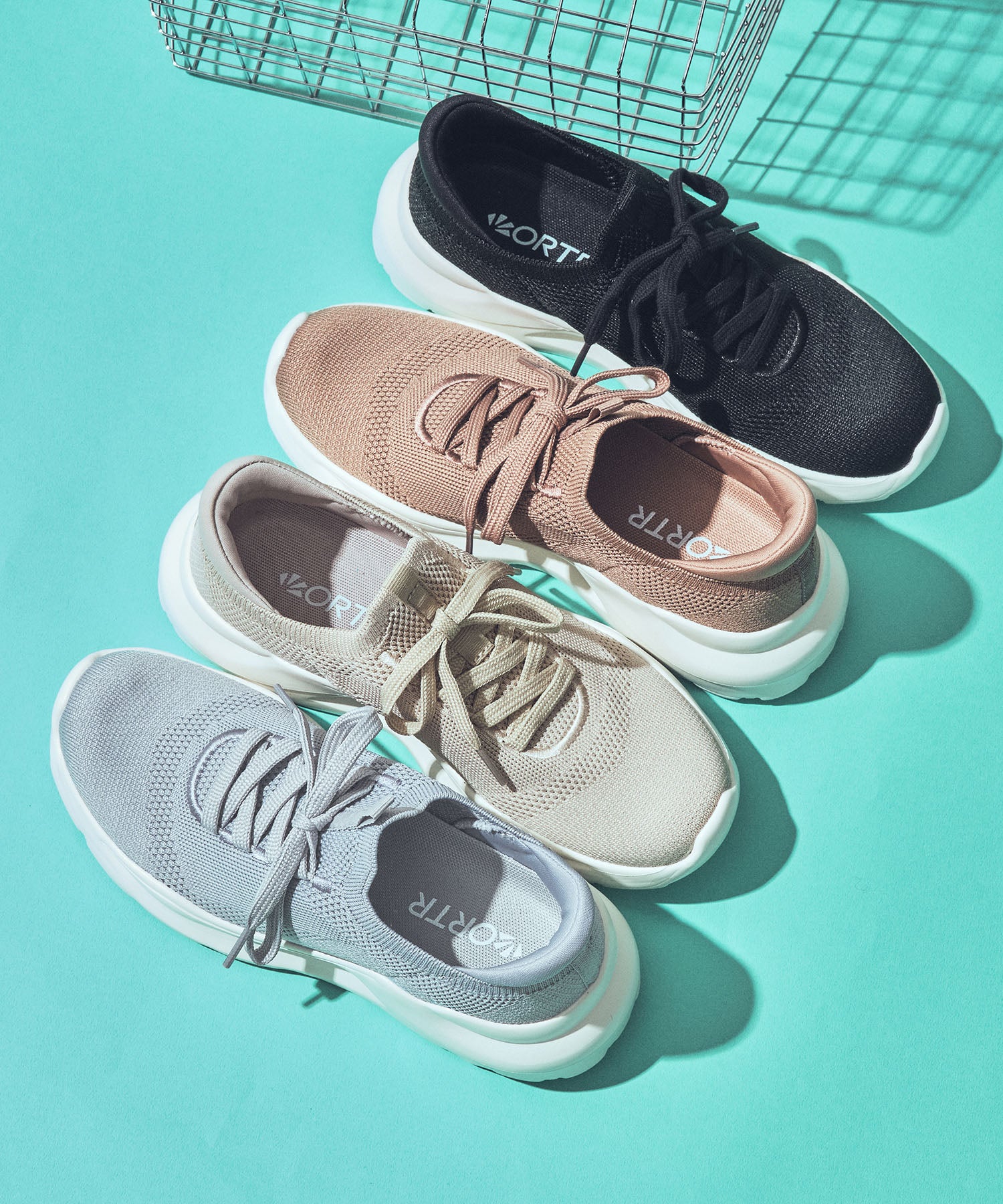 フィット感のあるニット素材と、さっと履けるハンズフリー仕様で軽さと快適さを追求したスニーカーが登場。足当たりの柔らかいニットは伸縮性があるので馴染みやすく、オリジナルの編み目の模様は凹凸感のあるものにすることでメリハリのある印象に。ニットなので通気性が良く、中敷は厚みのあるクッションを全体に入れているので沢山歩くシーンでも活躍する1足。更にレースアップ部分は紐で調節が可能で自身の足に合わせて変えられるのも嬉しいポイント。履き口がよく伸びるうえに、踵にはオリジナル設計の芯を入れることで手を使わずに立ったまま一瞬で履ける仕様に。フィット感にとことんこだわり、今までにない感動の履き心地を実現したスニーカー。ソールまで単色でまとめたブラック/ブラックと、深みのある色合いが魅力のブラウンとワインを加えた選べる7カラー展開。