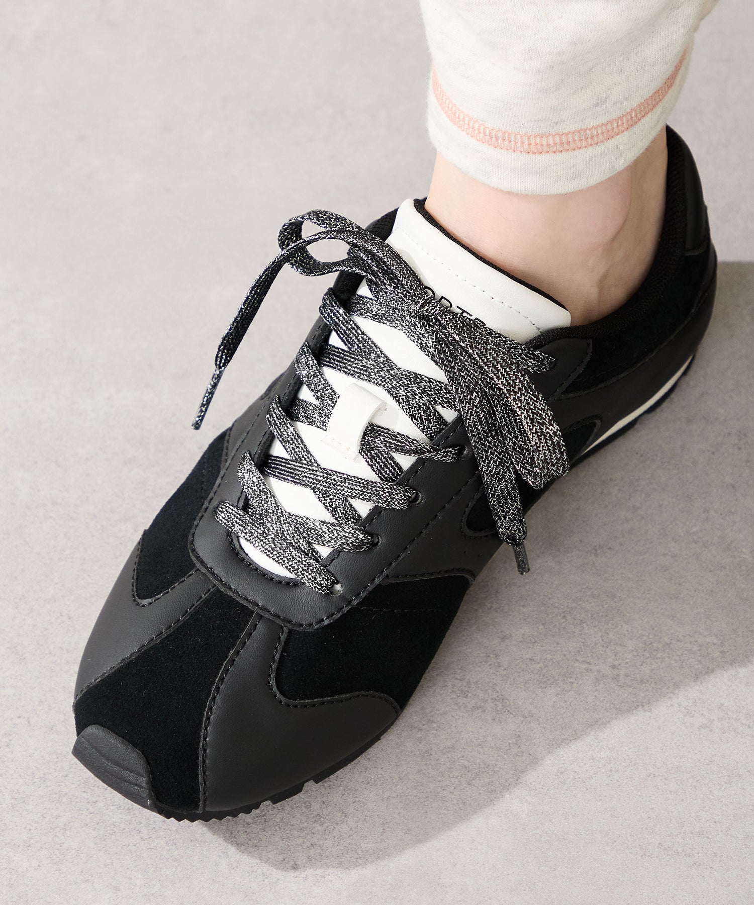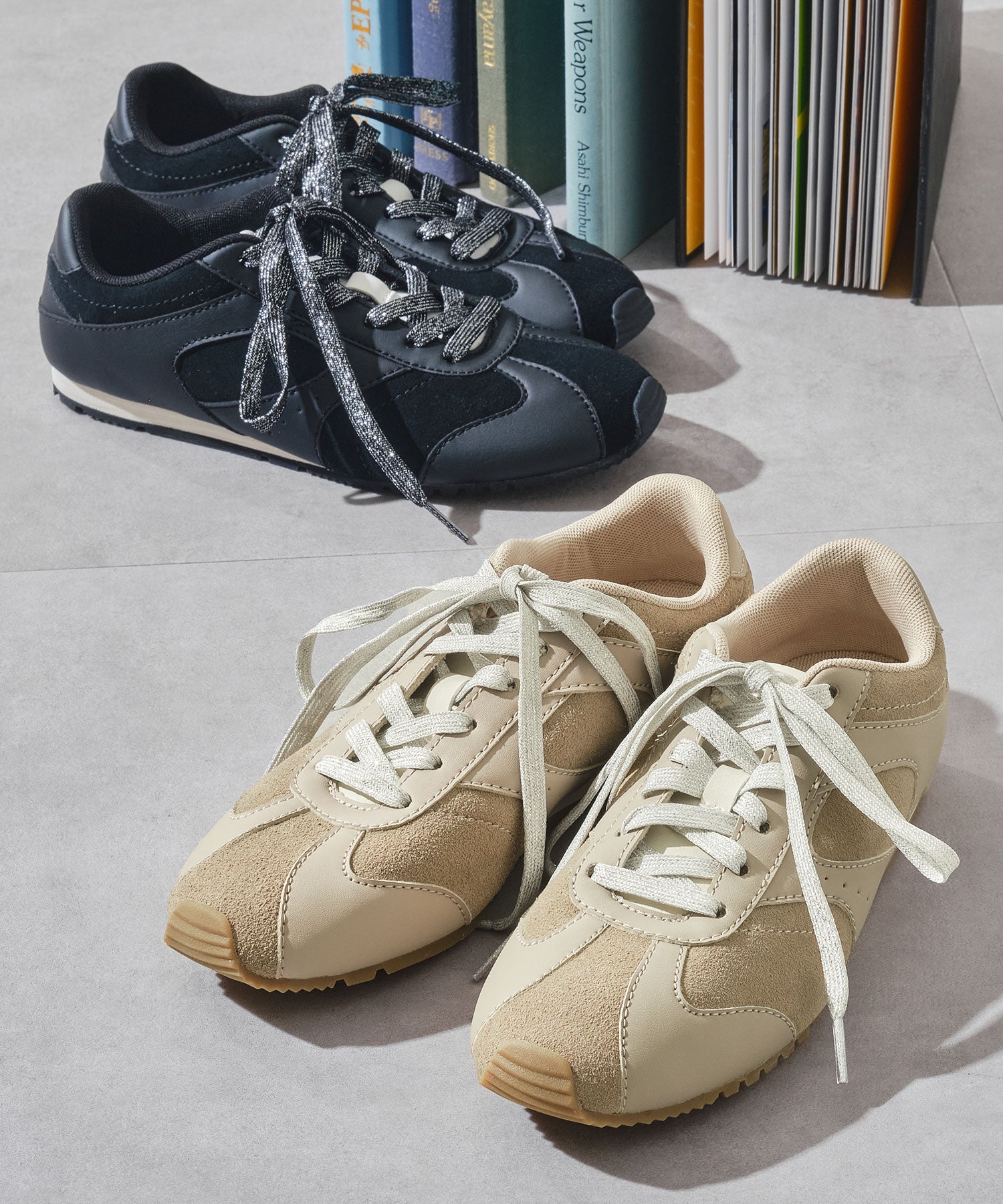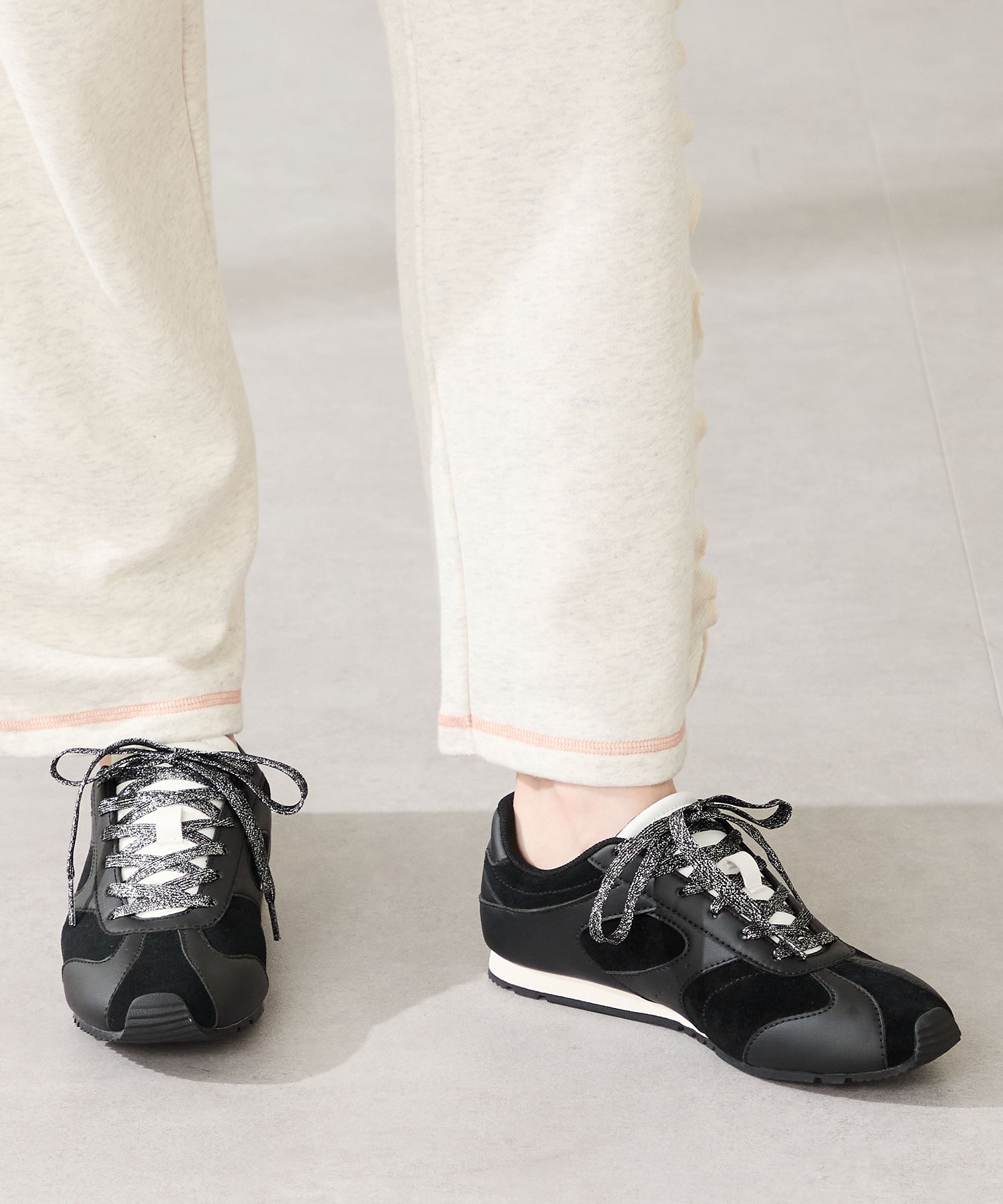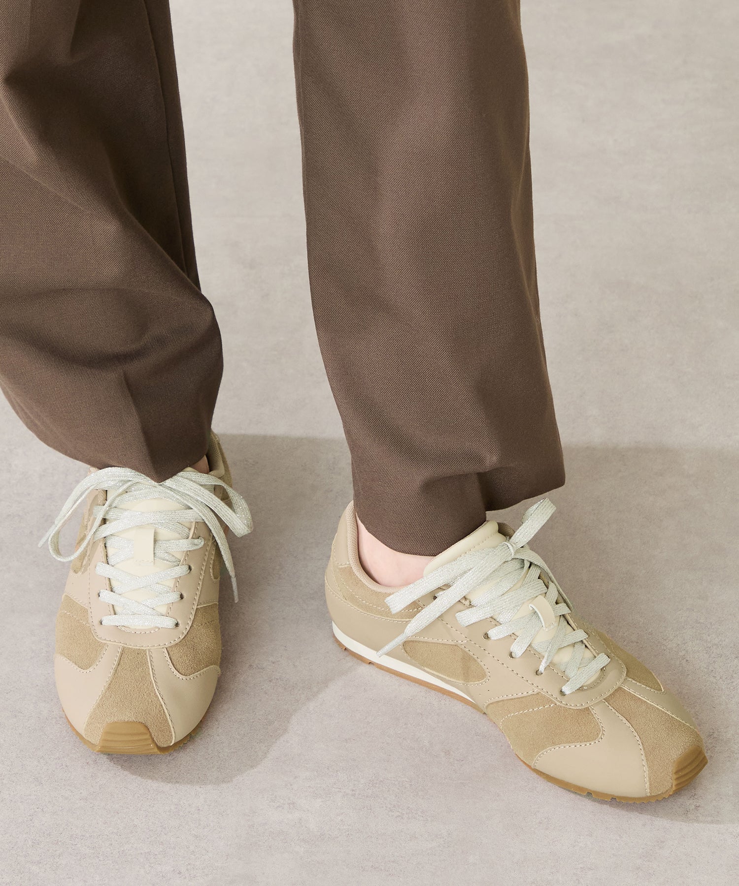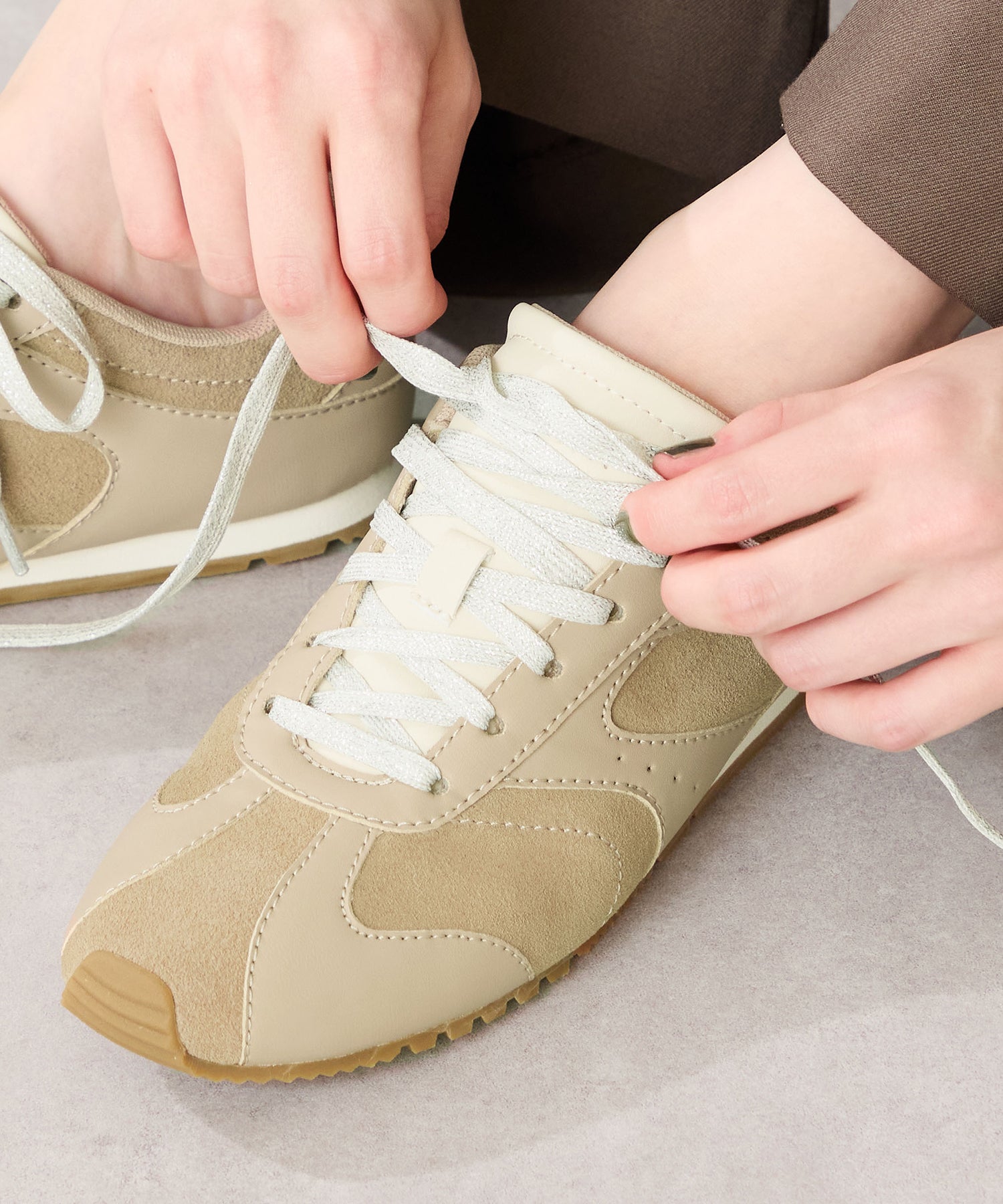 トレンドをおさえたデザインのフラットスニーカーは、履くだけで足元がおしゃれ見えする注目アイテム。付属のラメ紐と付け替えができる2way仕様なので、気分やその日のコーディネートに合わせてアレンジできるのが魅力的。軽やかな履き心地で長時間歩いても疲れにくく、デイリー使いにもぴったり。長めの丈感のパンツとの相性はもちろん、ミニ丈のボトムス合わせも◎。