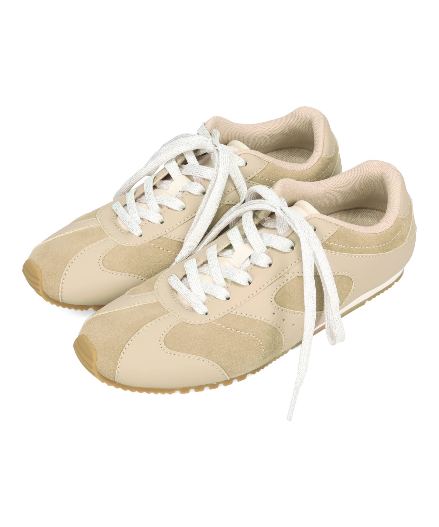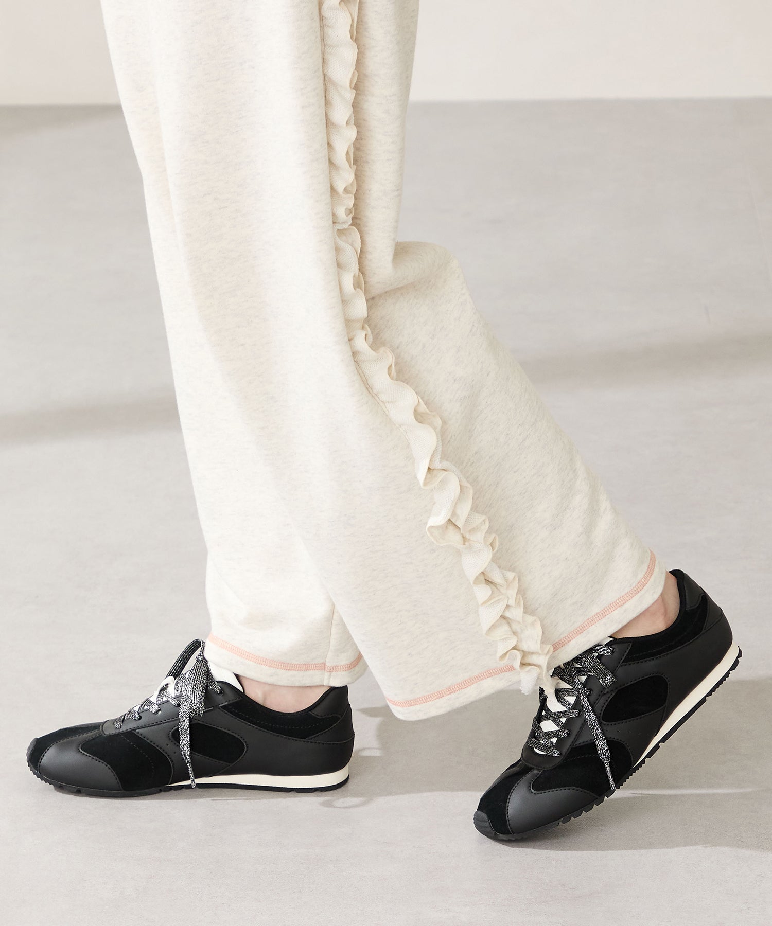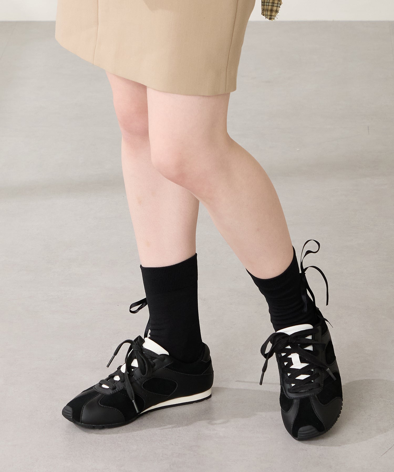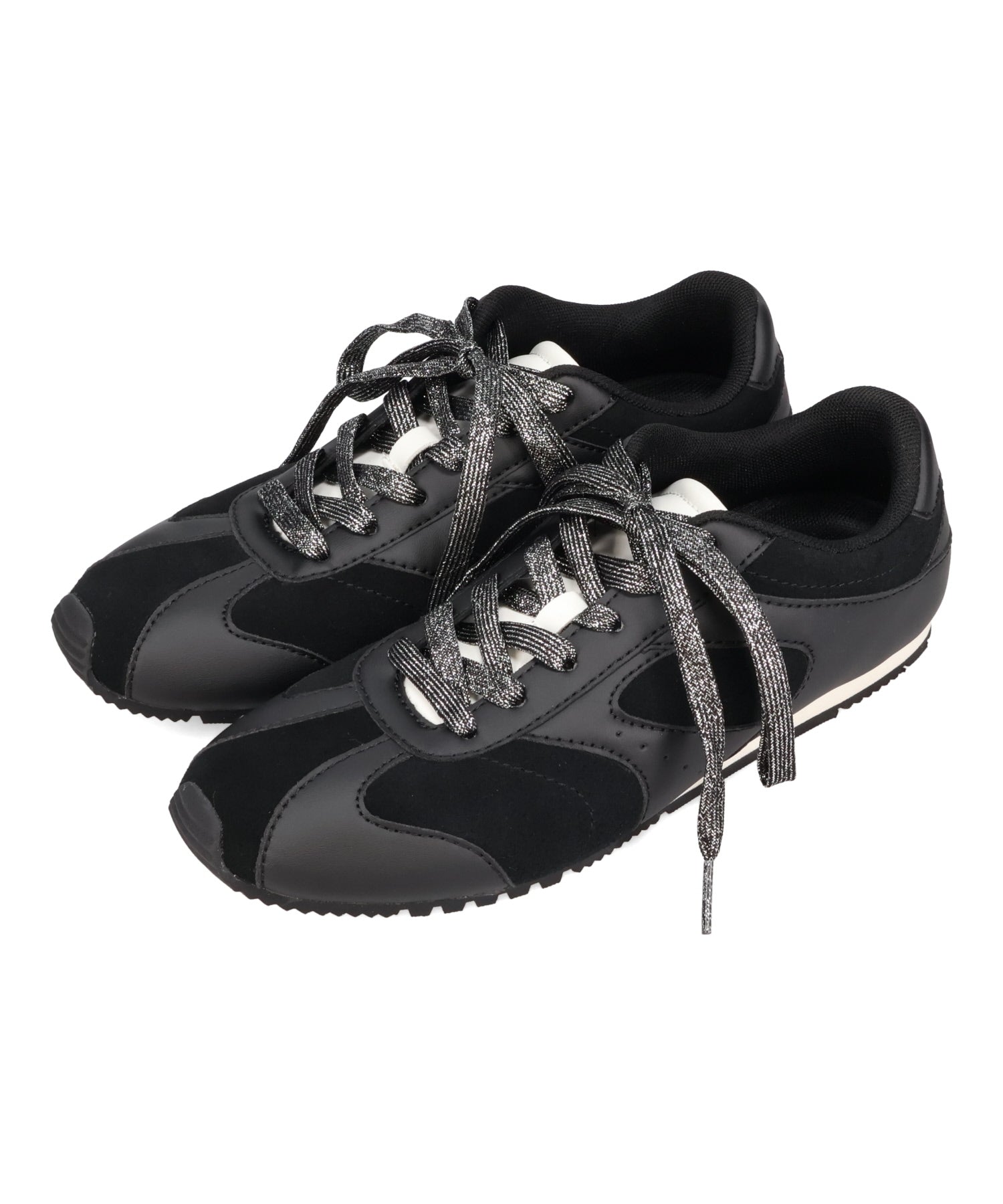 トレンドをおさえたデザインのフラットスニーカーは、履くだけで足元がおしゃれ見えする注目アイテム。付属のラメ紐と付け替えができる2way仕様なので、気分やその日のコーディネートに合わせてアレンジできるのが魅力的。軽やかな履き心地で長時間歩いても疲れにくく、デイリー使いにもぴったり。長めの丈感のパンツとの相性はもちろん、ミニ丈のボトムス合わせも◎。