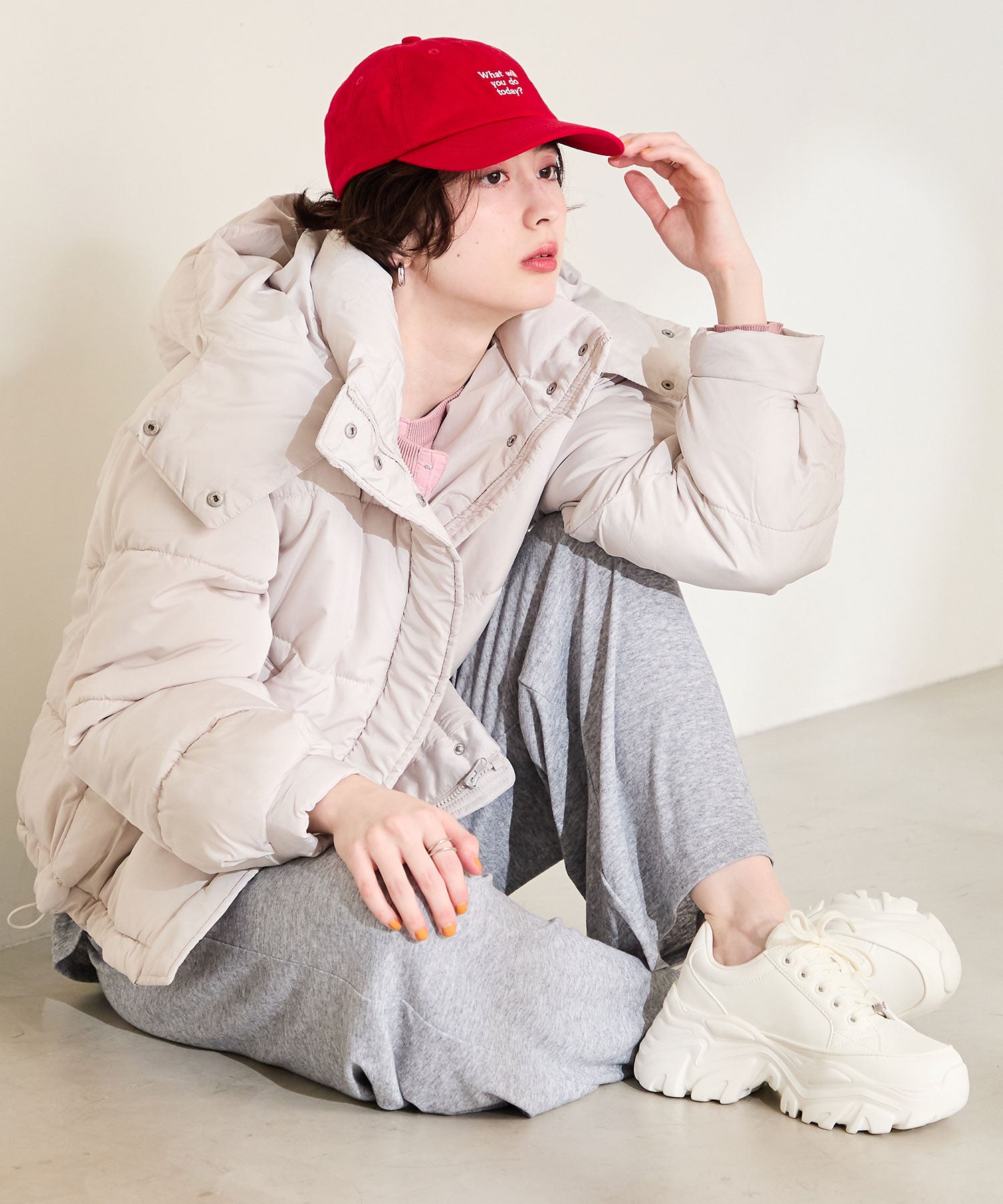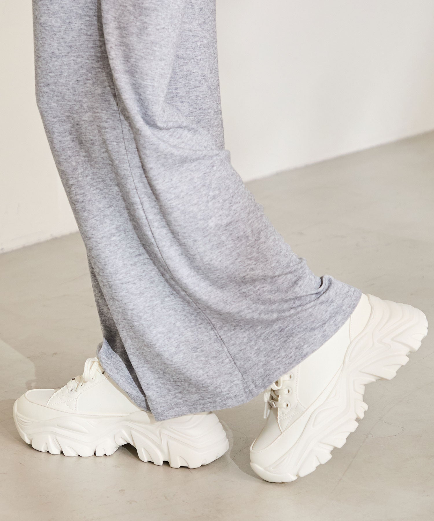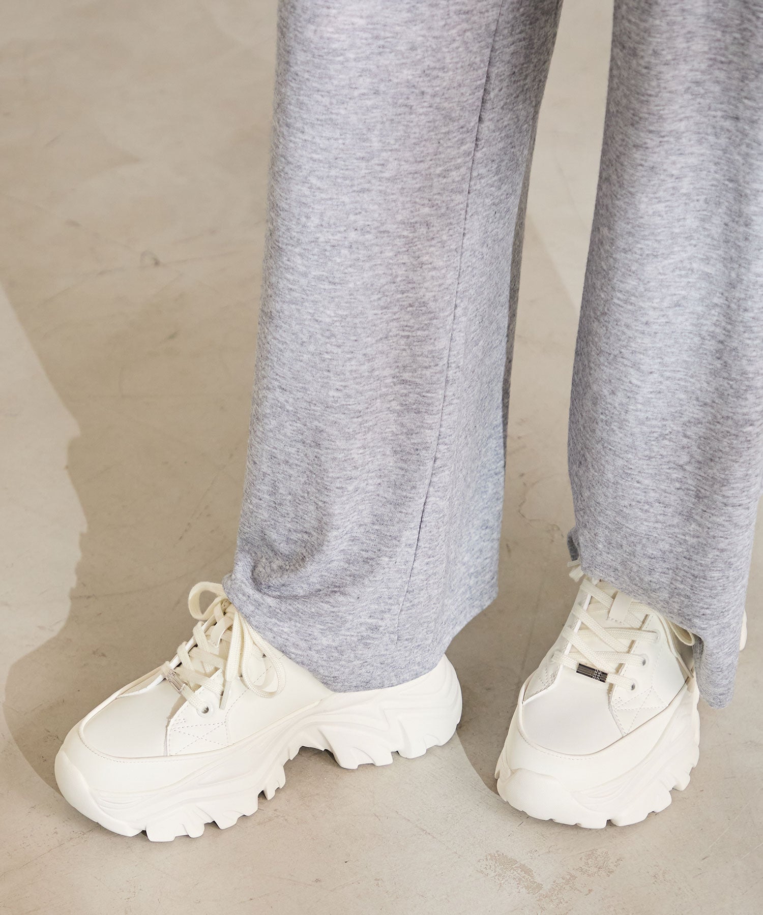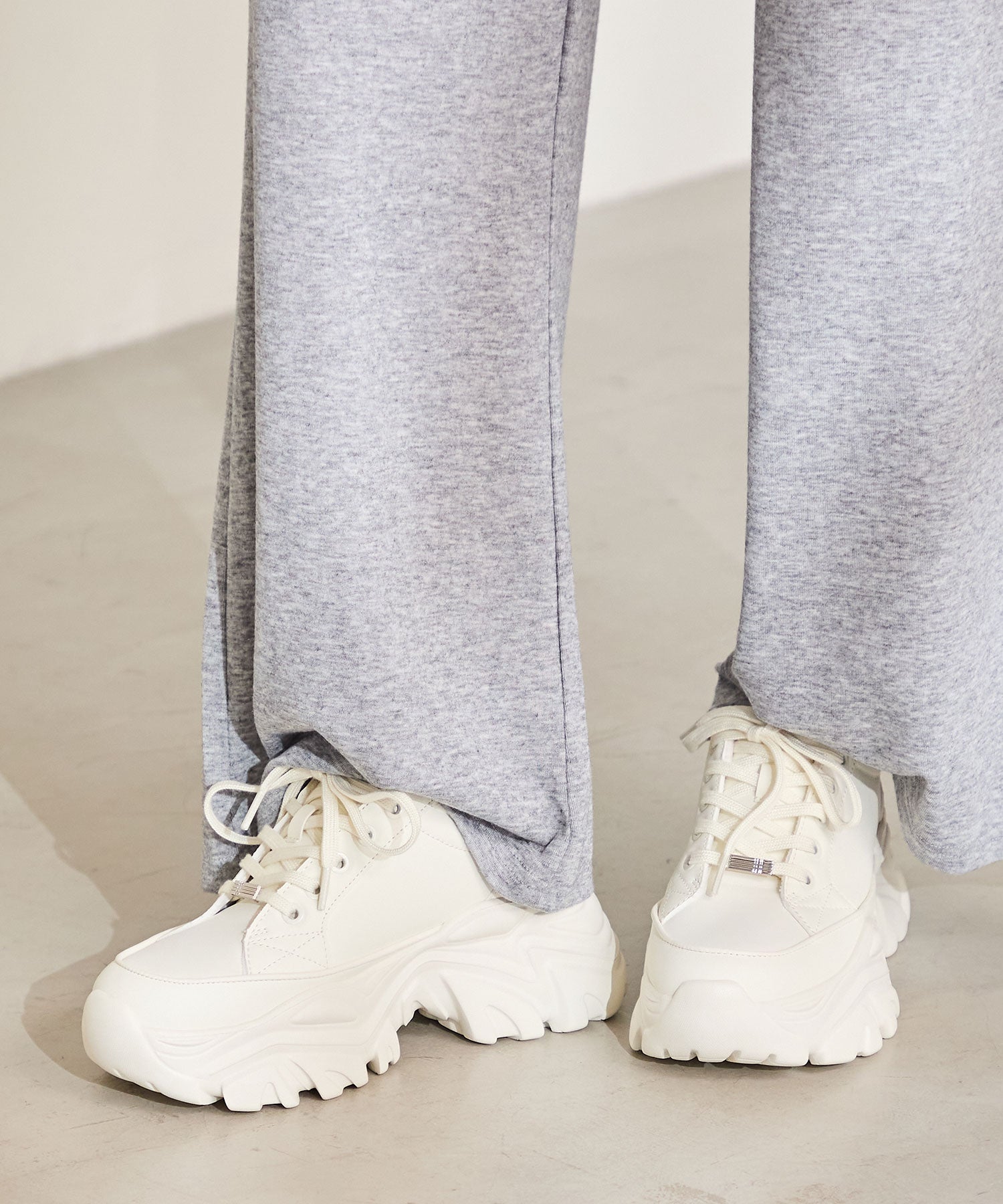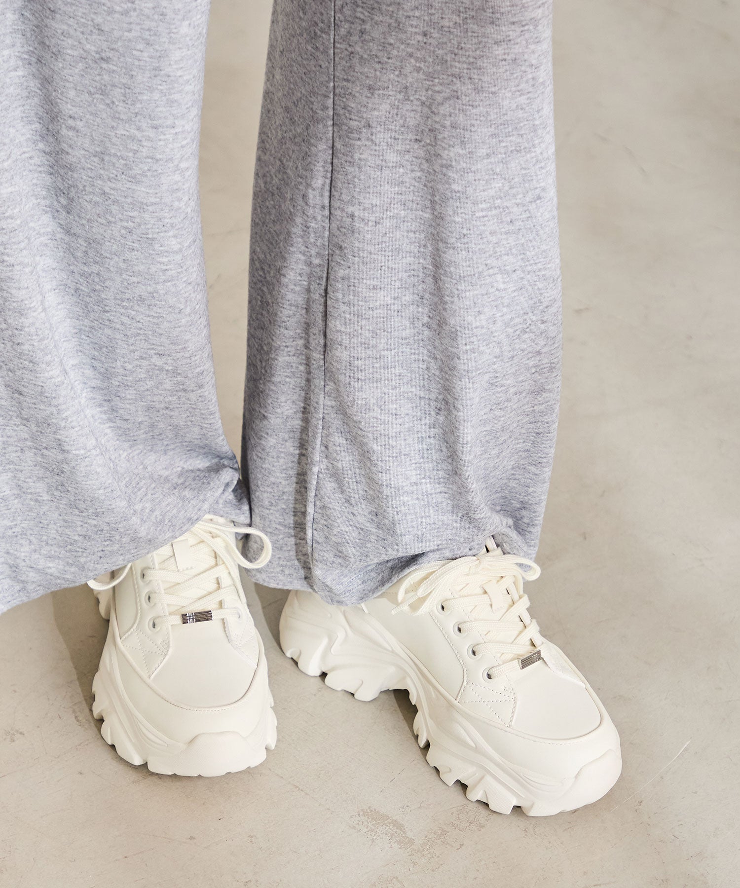 とことんボリュームのあるソールがスタイルアップを叶えてくれるスニーカーは、オリジナルの金具パーツでアクセントを効かせた1足。インパクトのあるソールも見た目以上に軽く、全色ホワイトに統一することで重たく見えないのもポイント。切替パーツが少なくすっきりとしたデザインに、シボのある素材をアッパー全体に使用することで高級感のある仕上がりに。