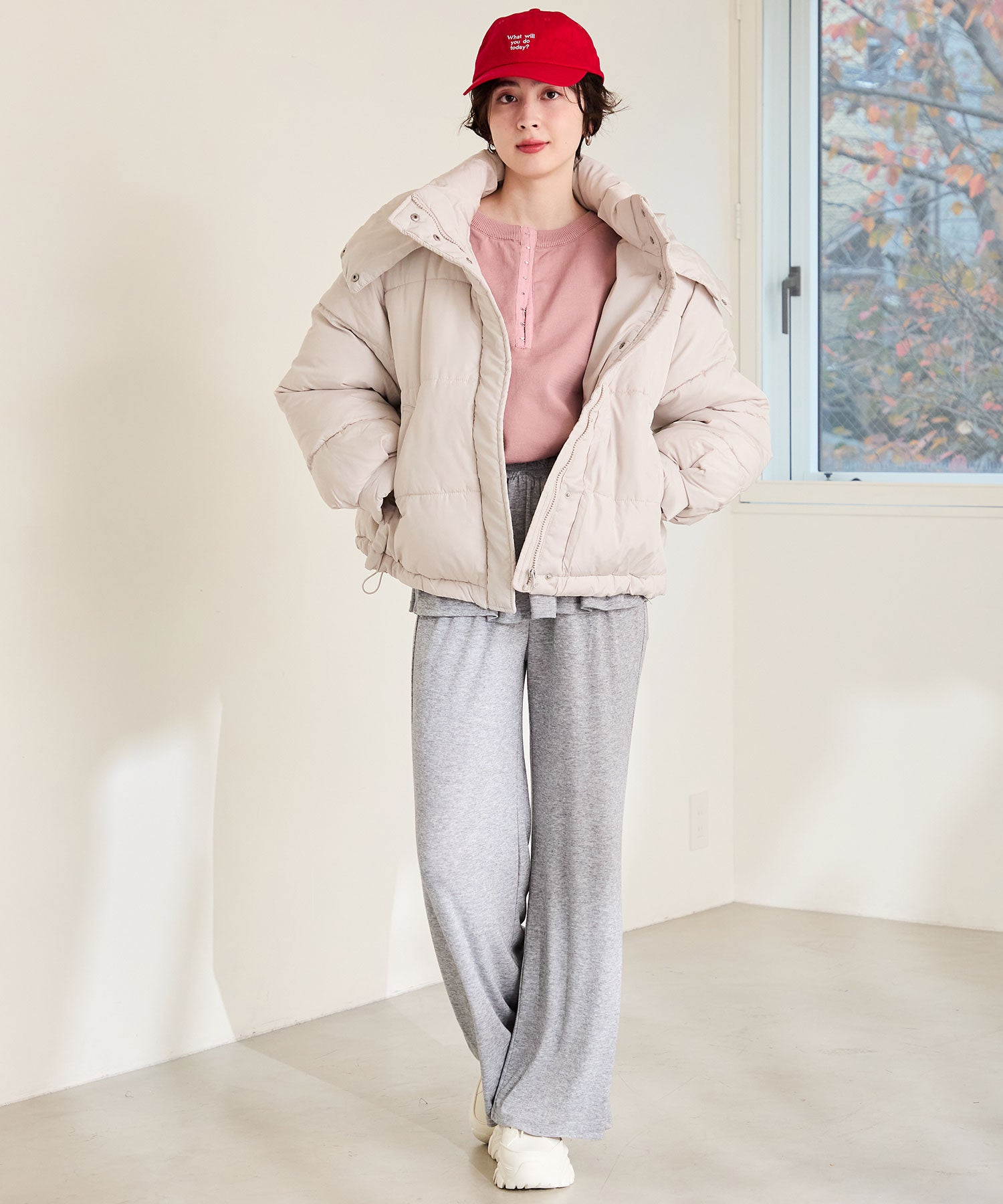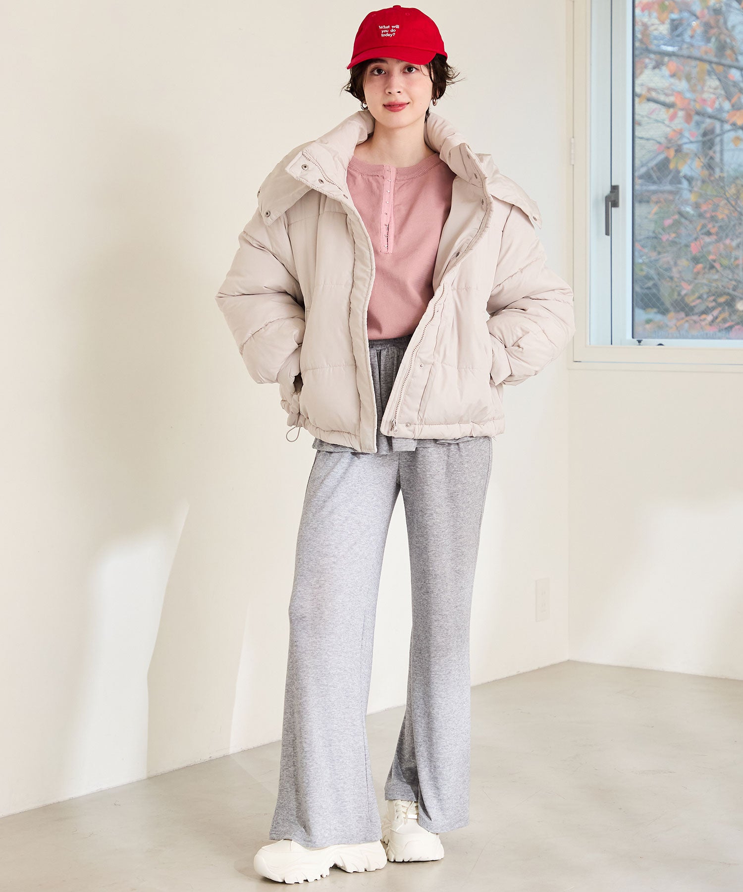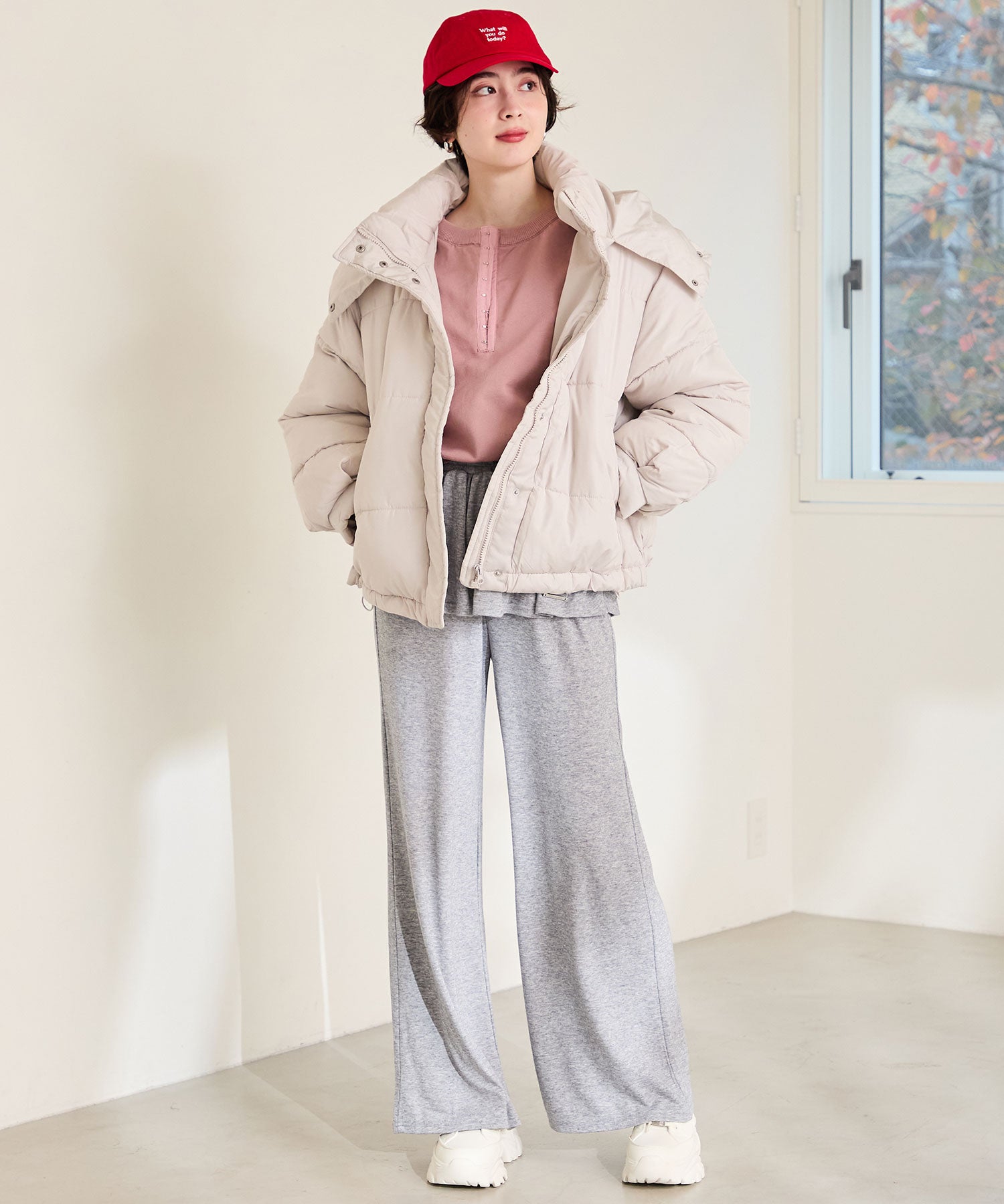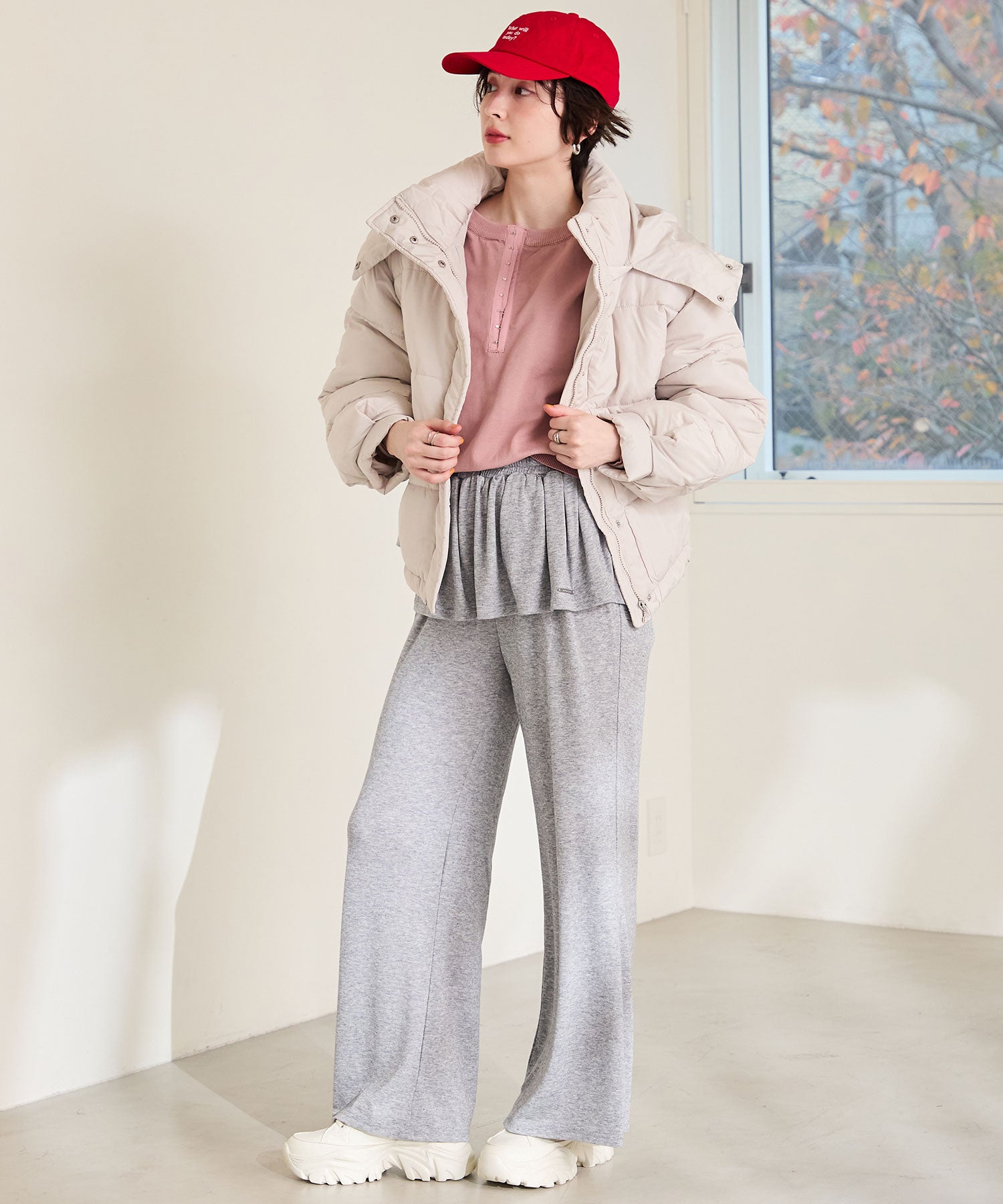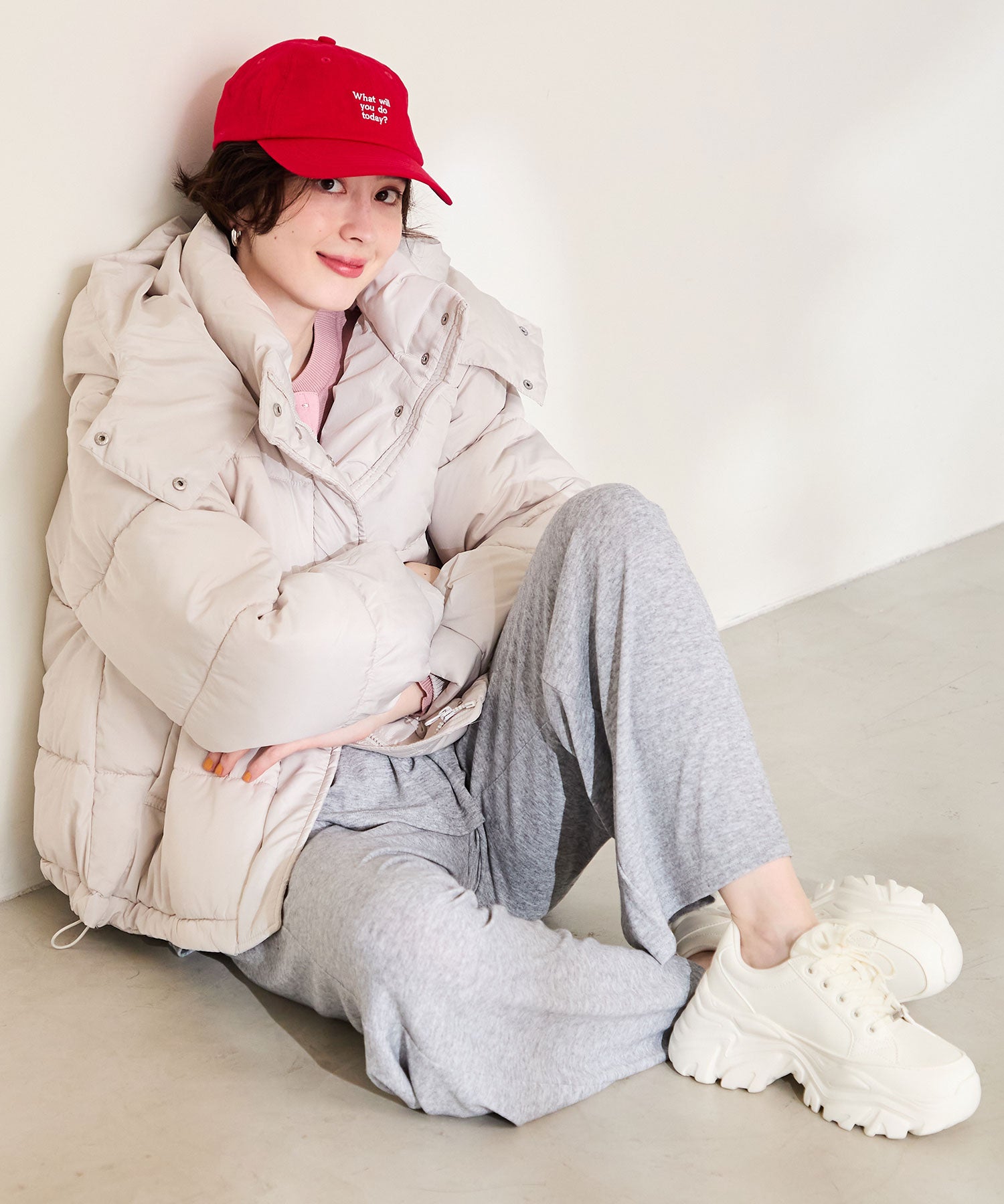 とことんボリュームのあるソールがスタイルアップを叶えてくれるスニーカーは、オリジナルの金具パーツでアクセントを効かせた1足。インパクトのあるソールも見た目以上に軽く、全色ホワイトに統一することで重たく見えないのもポイント。切替パーツが少なくすっきりとしたデザインに、シボのある素材をアッパー全体に使用することで高級感のある仕上がりに。