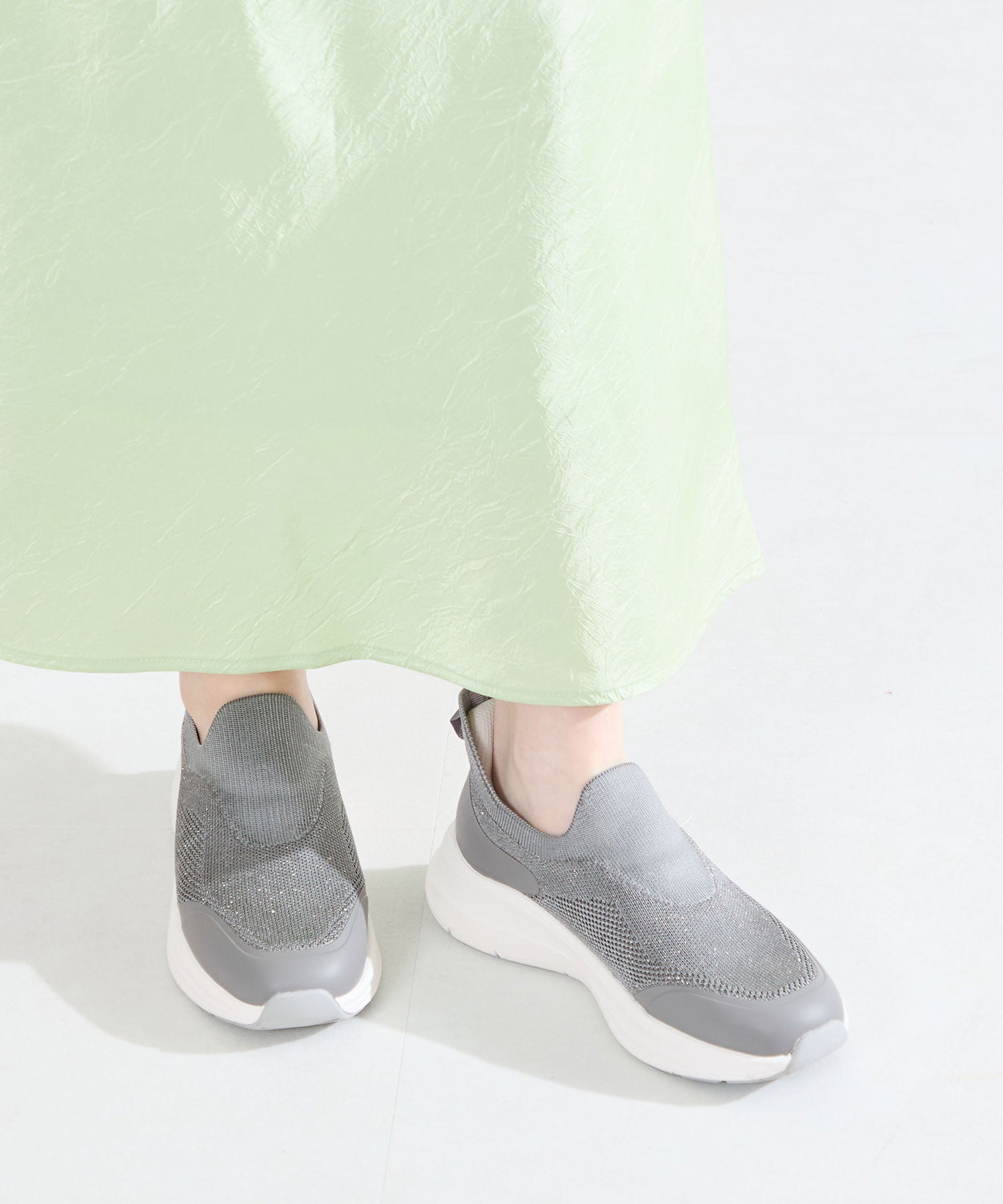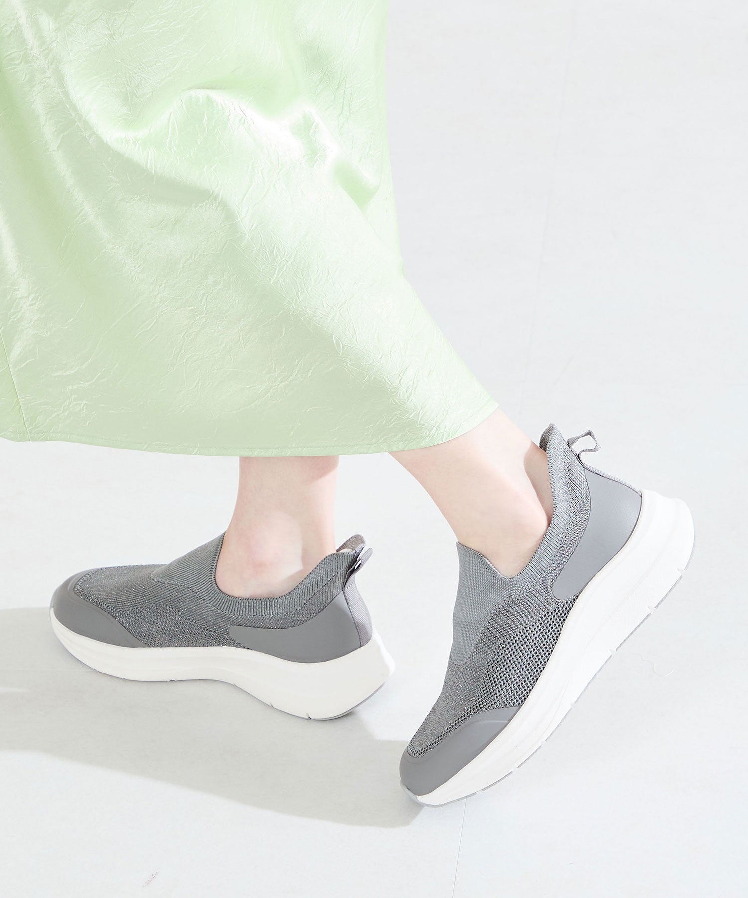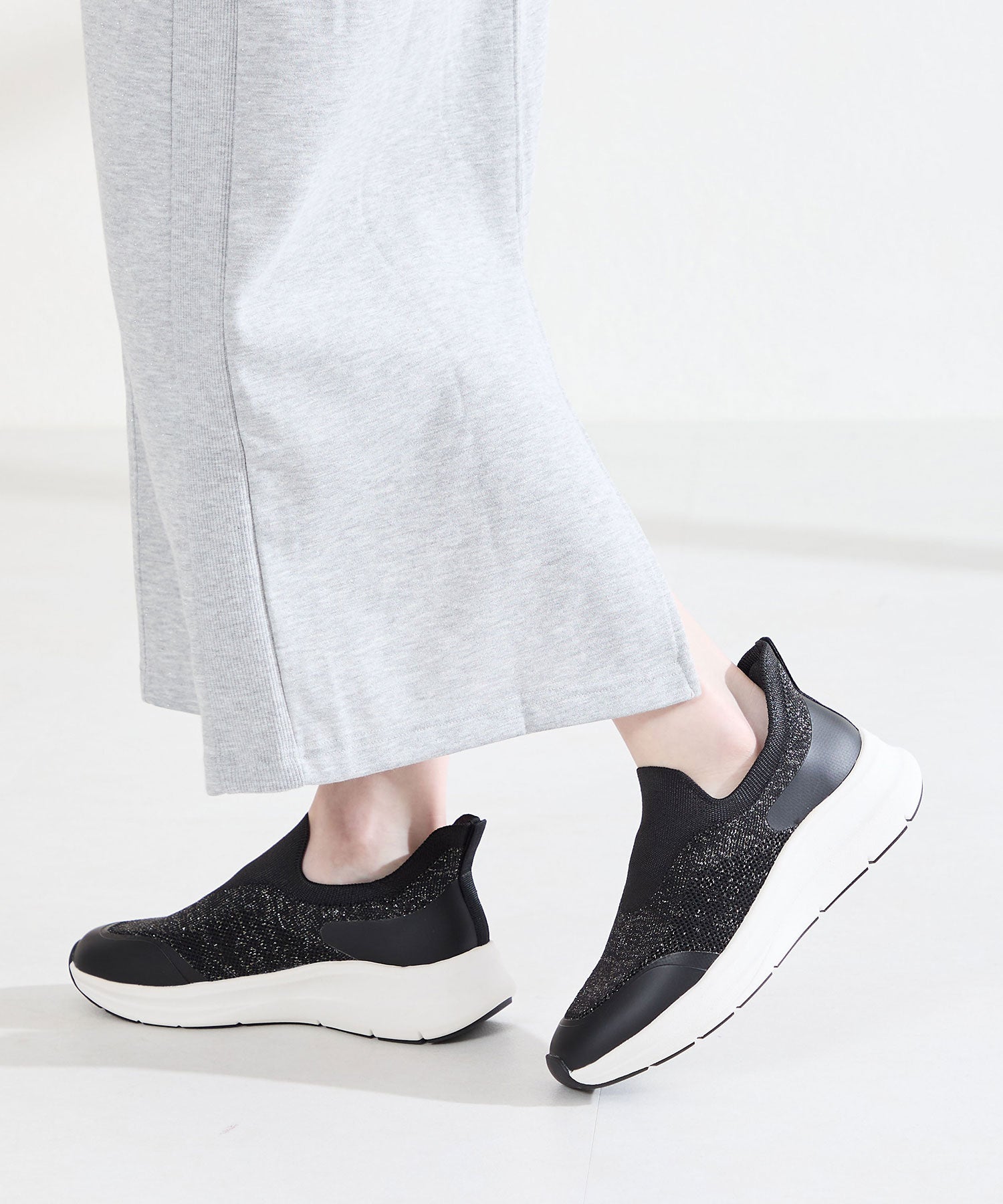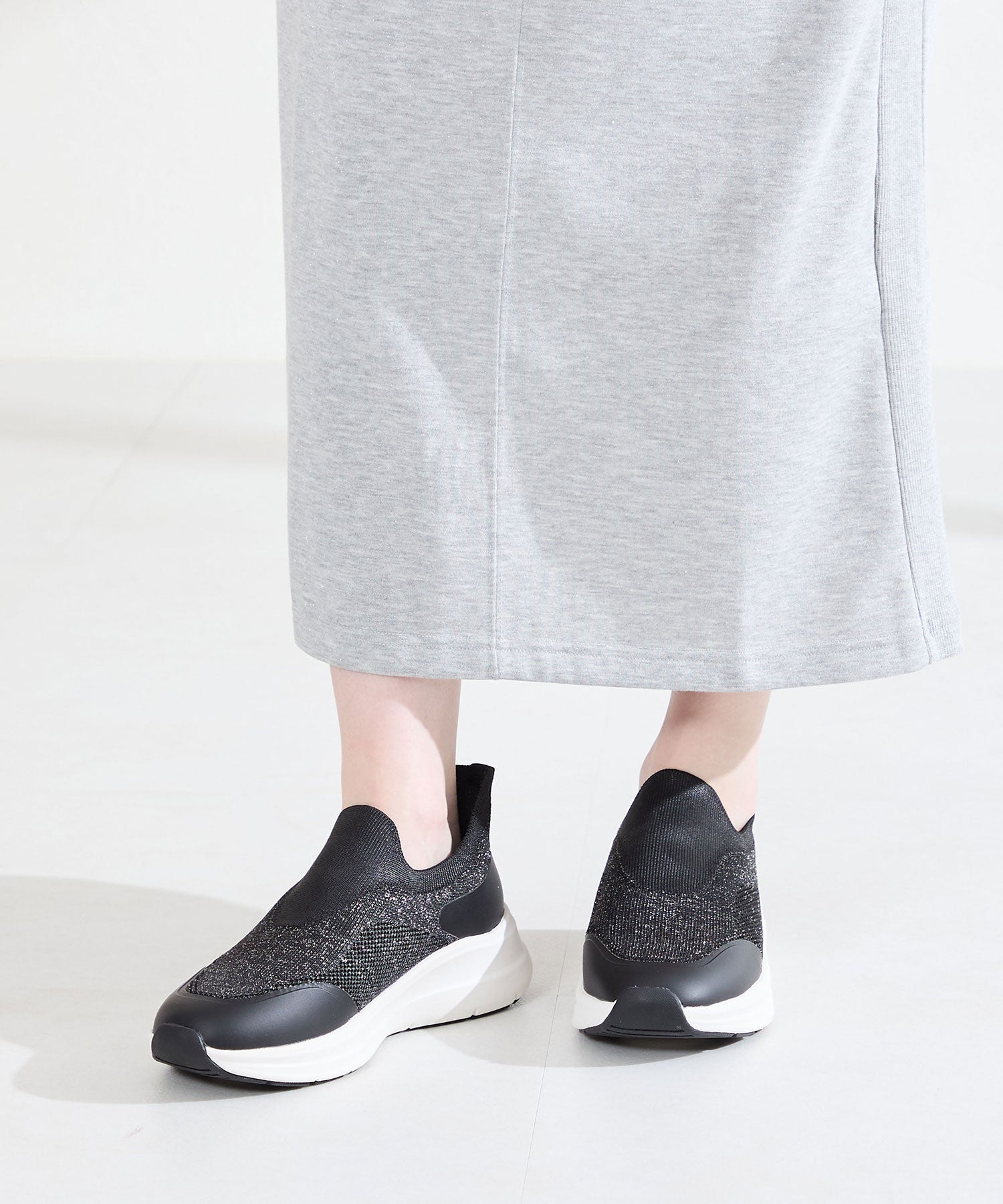 瞬間フィットシリーズから防水タイプのニットスニーカーが登場。防水シート入りで水の侵入を防ぎ、靴底にはグリップ性に優れたラバーを施し、雨の日でも安心な歩行をサポート。適度にハリのあるニット素材を使用しているのでニットならではの軽さが魅力的。さらにクッション入りの踵と伸縮する履き口が足にフィットするので、履いた瞬間から快適な履き心地を実現。さっと履けるハンズフリー仕様で、仕事で脱ぎ履きの多い方にもおすすめ。ブラックとグレーにはラメ織りのニット素材を使用しており、シンプルなデザインながらもさりげない輝きが足元に軽やかさを与えてくれます。