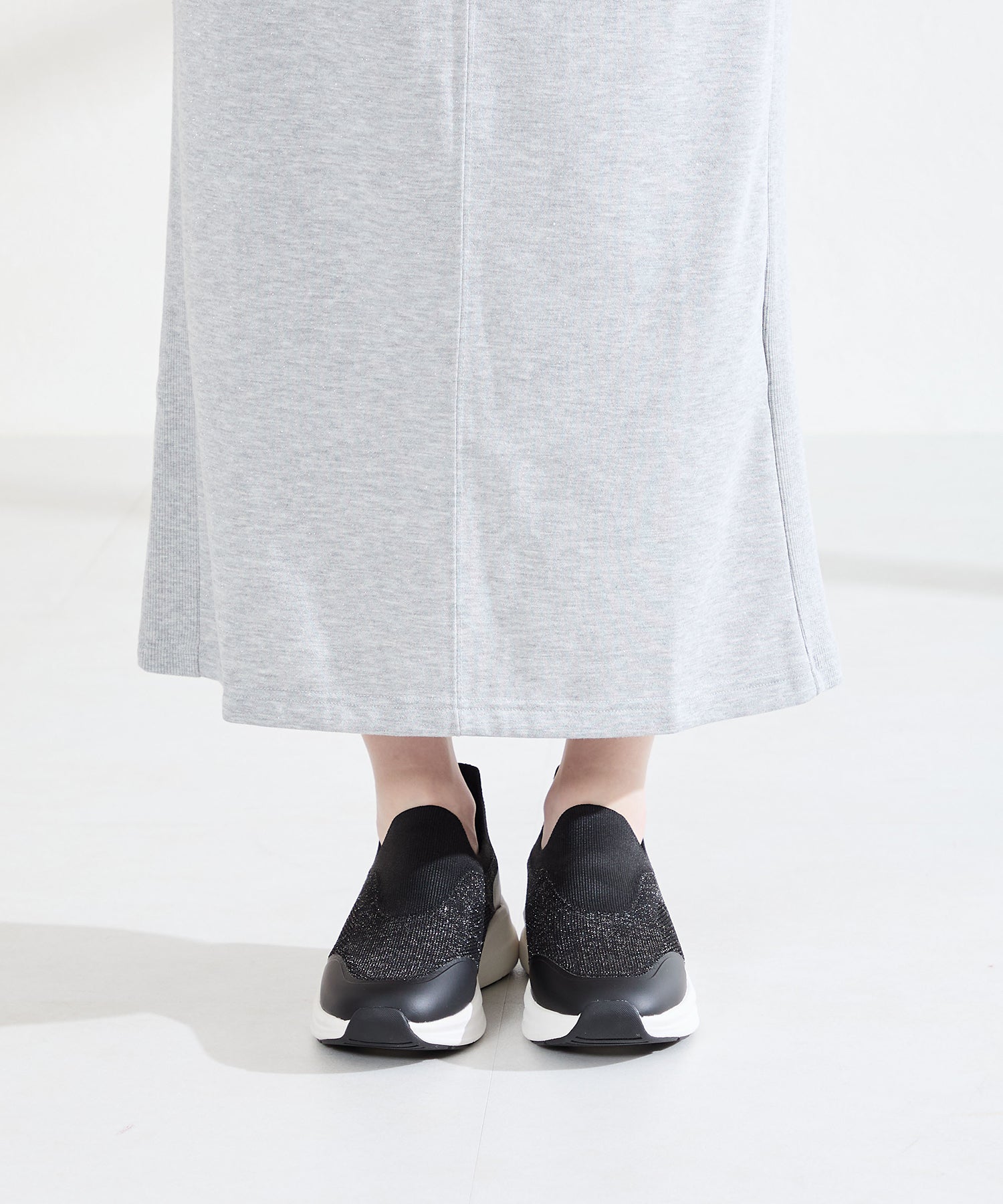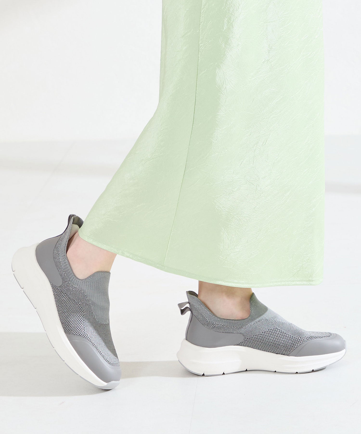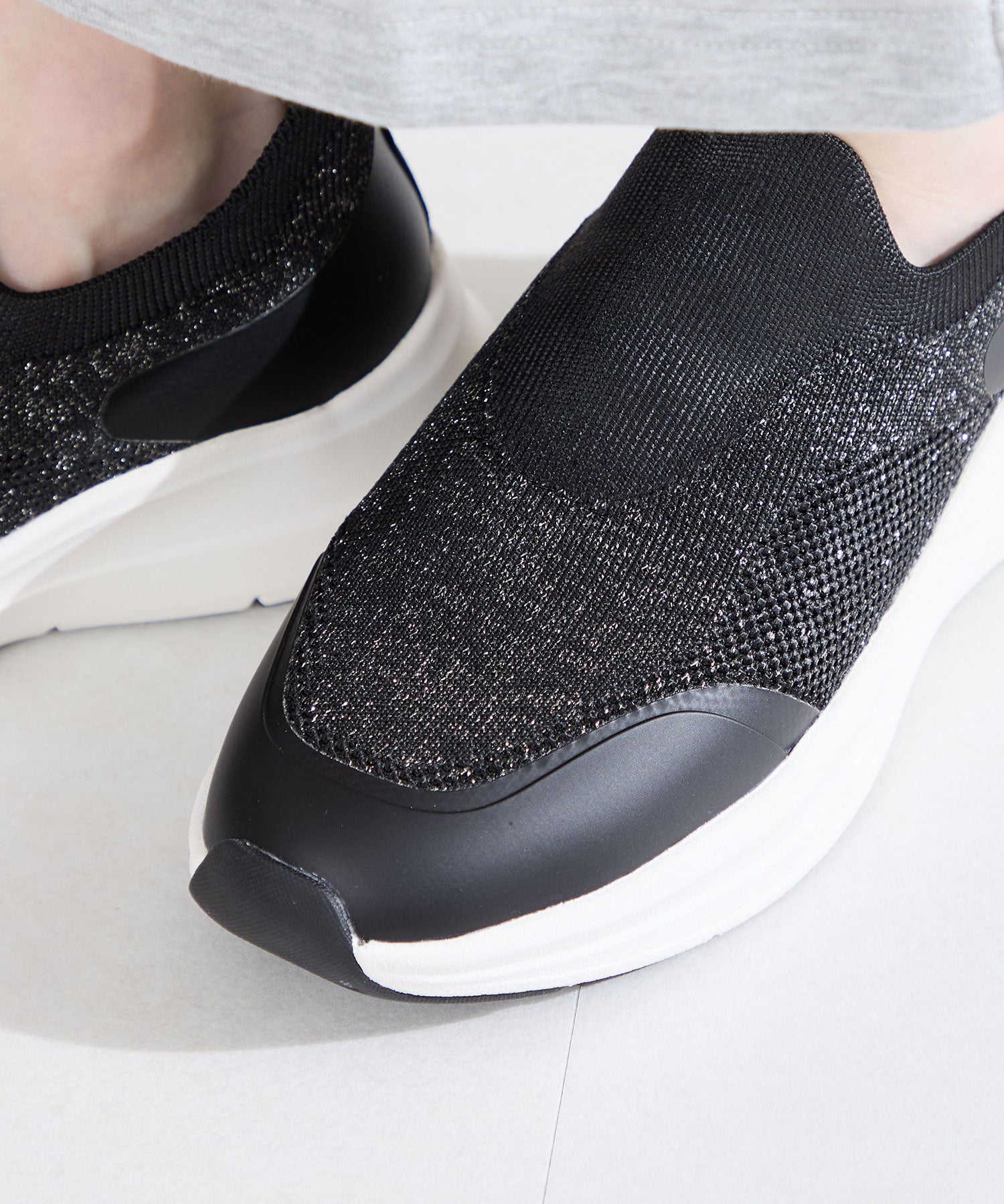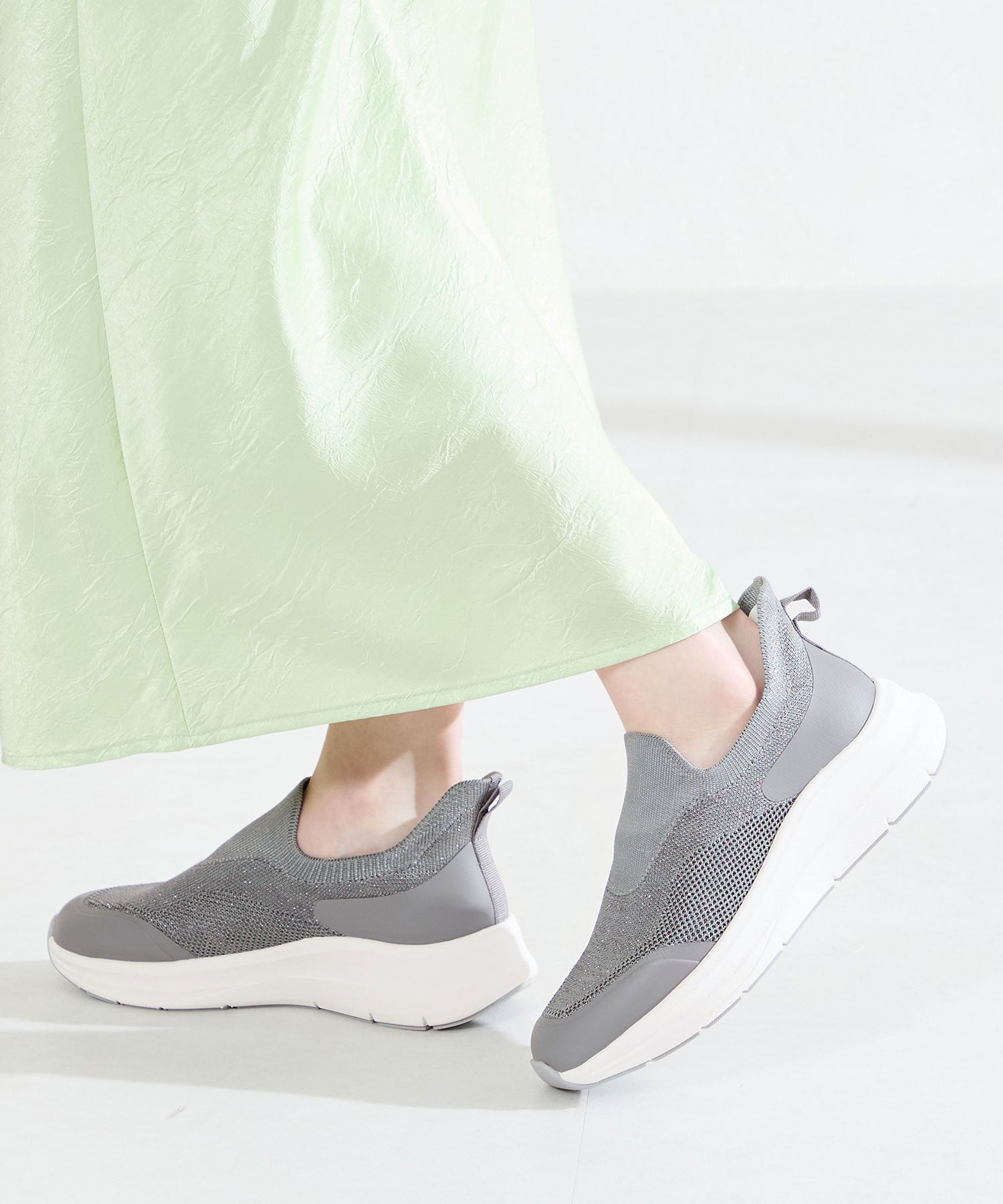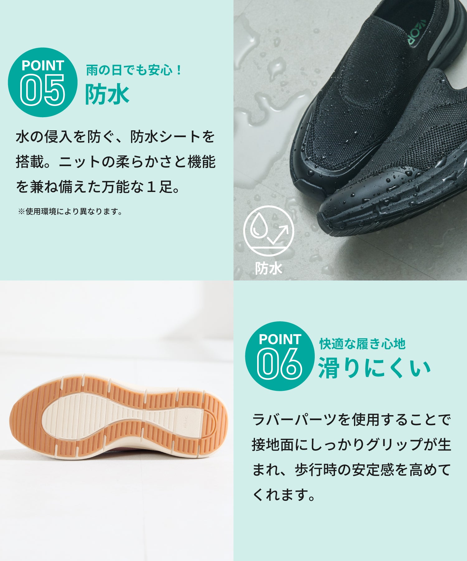 瞬間フィットシリーズから防水タイプのニットスニーカーが登場。防水シート入りで水の侵入を防ぎ、靴底にはグリップ性に優れたラバーを施し、雨の日でも安心な歩行をサポート。適度にハリのあるニット素材を使用しているのでニットならではの軽さが魅力的。さらにクッション入りの踵と伸縮する履き口が足にフィットするので、履いた瞬間から快適な履き心地を実現。さっと履けるハンズフリー仕様で、仕事で脱ぎ履きの多い方にもおすすめ。ブラックとグレーにはラメ織りのニット素材を使用しており、シンプルなデザインながらもさりげない輝きが足元に軽やかさを与えてくれます。