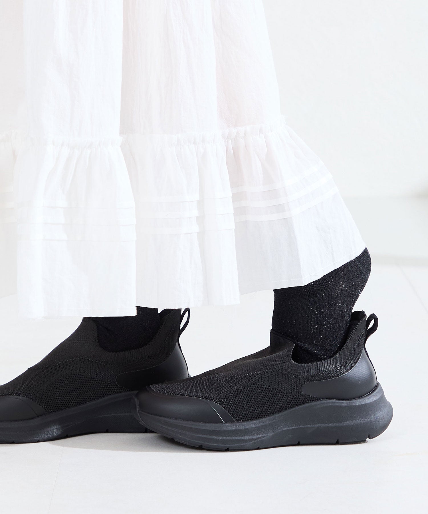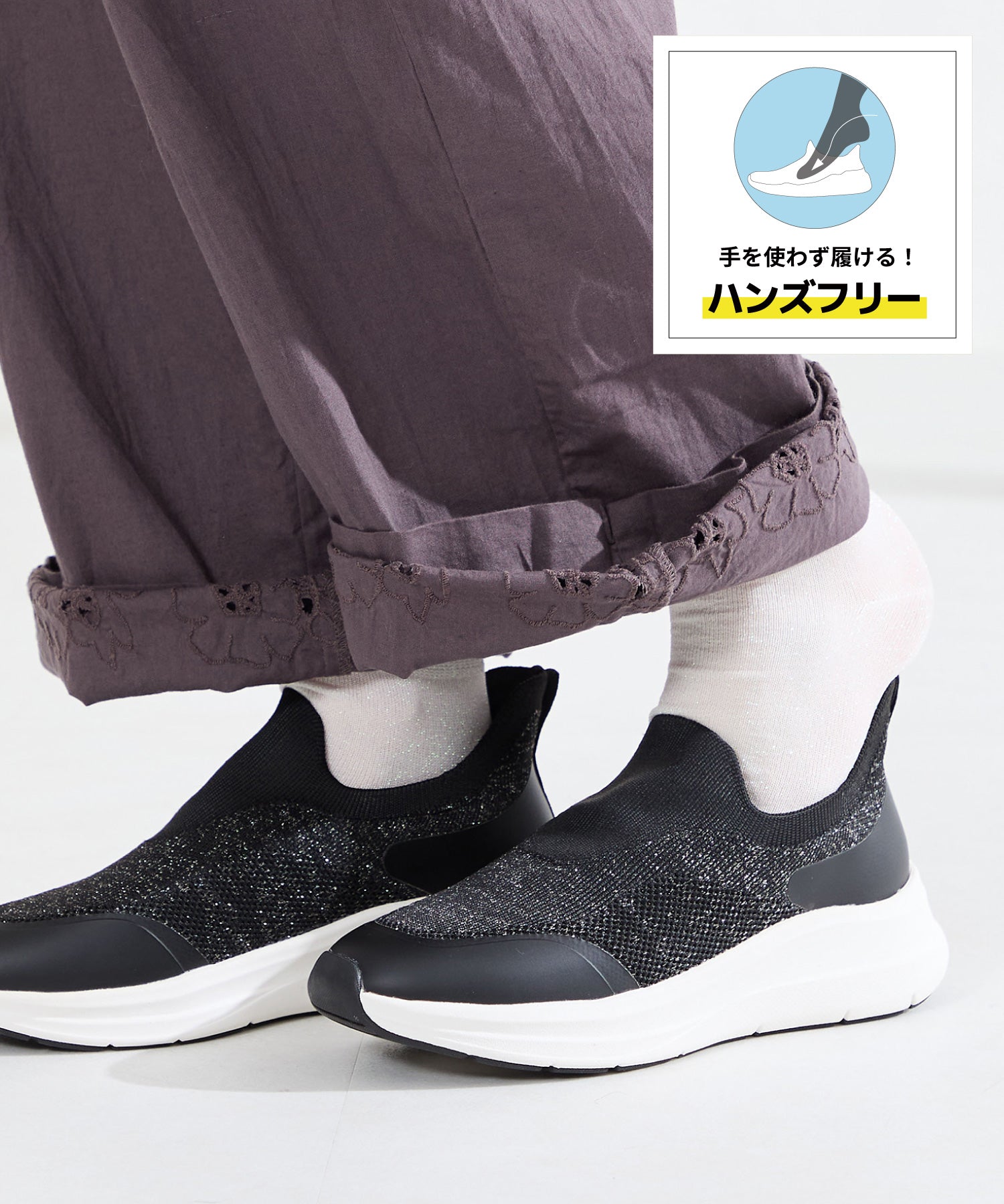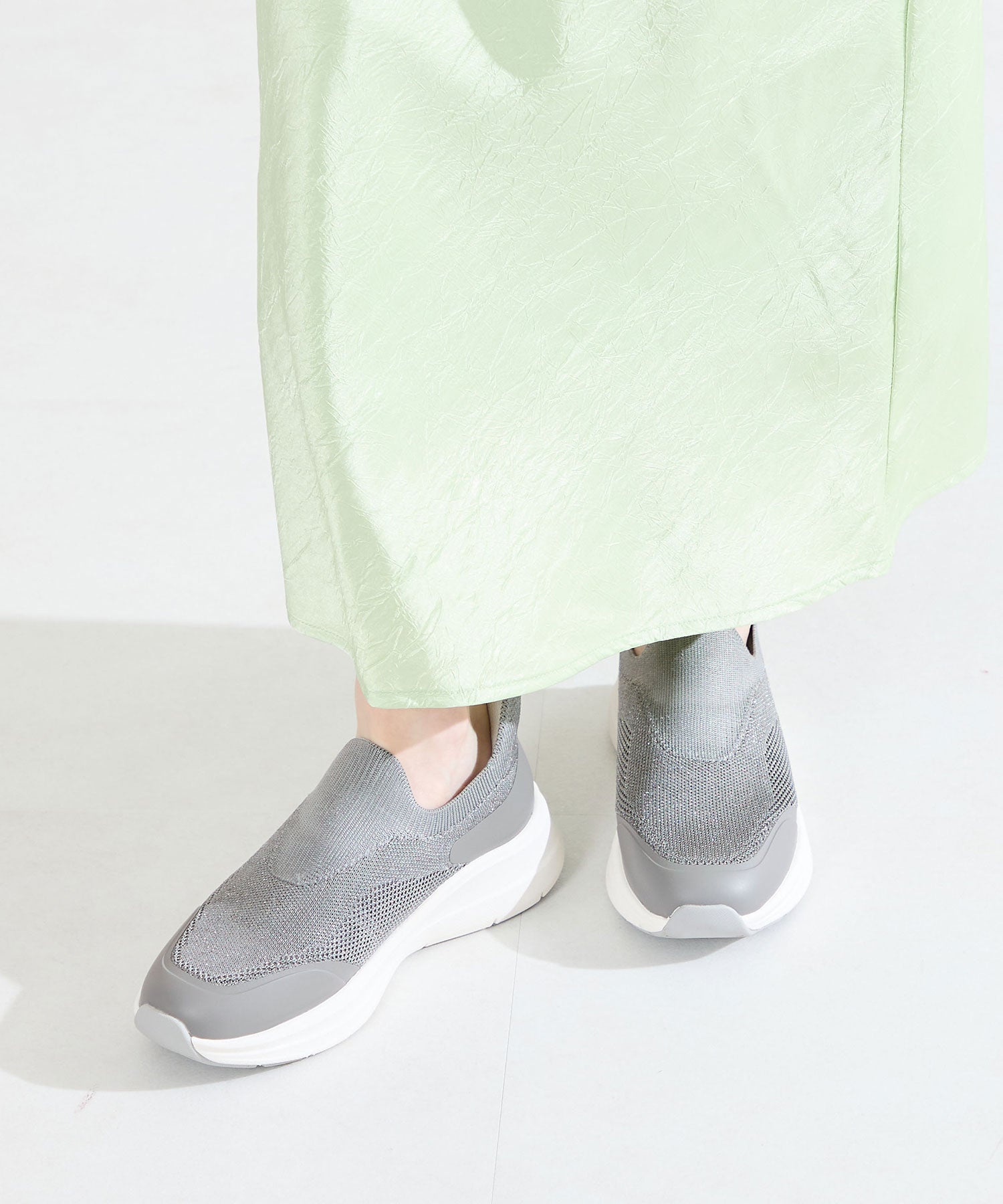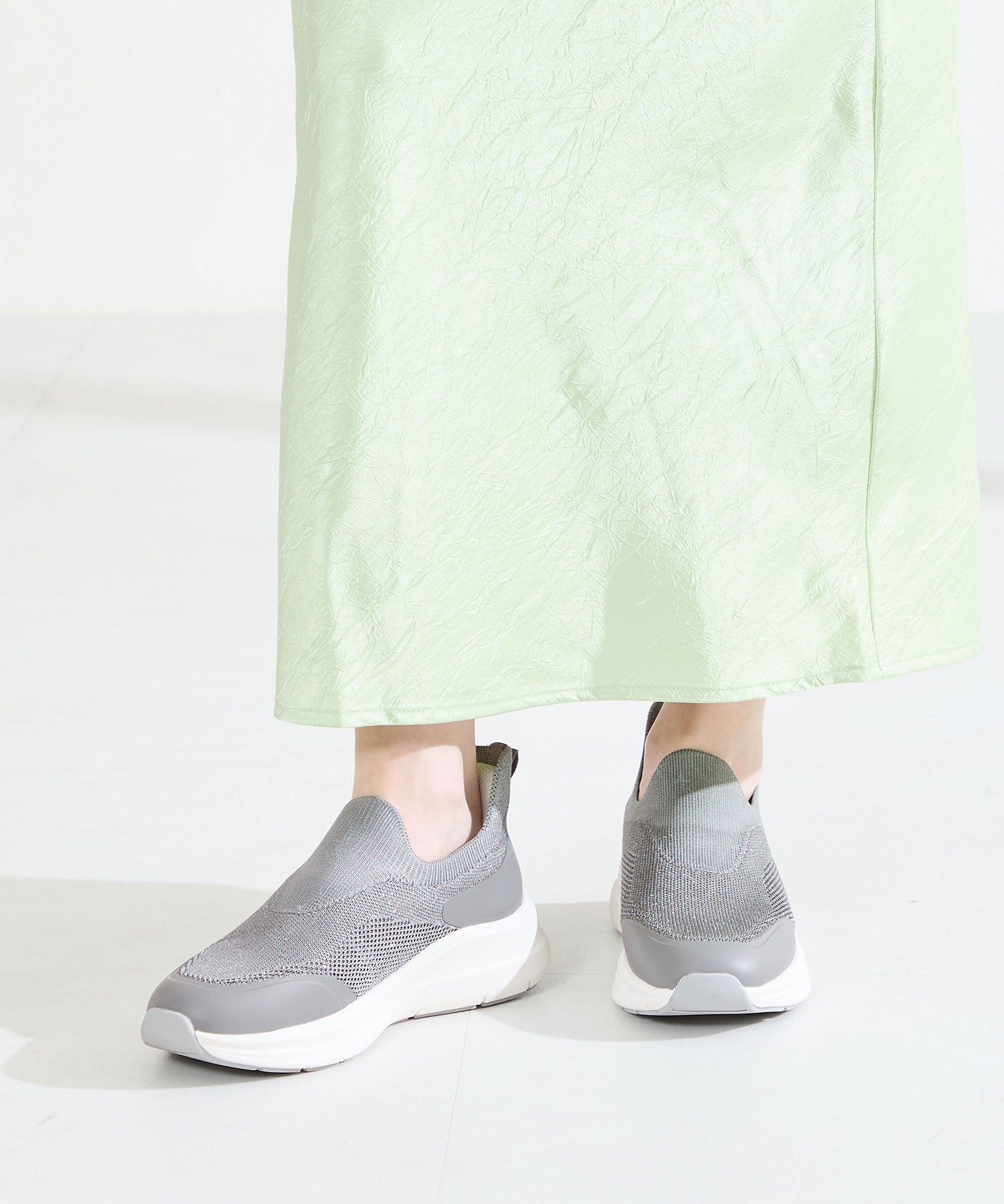 瞬間フィットシリーズから防水タイプのニットスニーカーが登場。防水シート入りで水の侵入を防ぎ、靴底にはグリップ性に優れたラバーを施し、雨の日でも安心な歩行をサポート。適度にハリのあるニット素材を使用しているのでニットならではの軽さが魅力的。さらにクッション入りの踵と伸縮する履き口が足にフィットするので、履いた瞬間から快適な履き心地を実現。さっと履けるハンズフリー仕様で、仕事で脱ぎ履きの多い方にもおすすめ。ブラックとグレーにはラメ織りのニット素材を使用しており、シンプルなデザインながらもさりげない輝きが足元に軽やかさを与えてくれます。