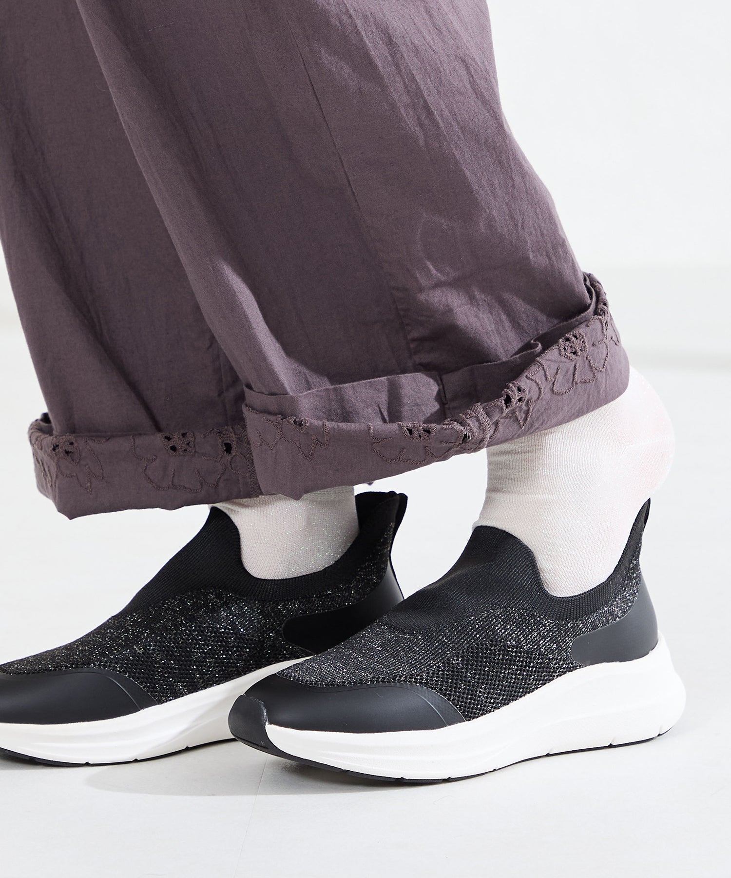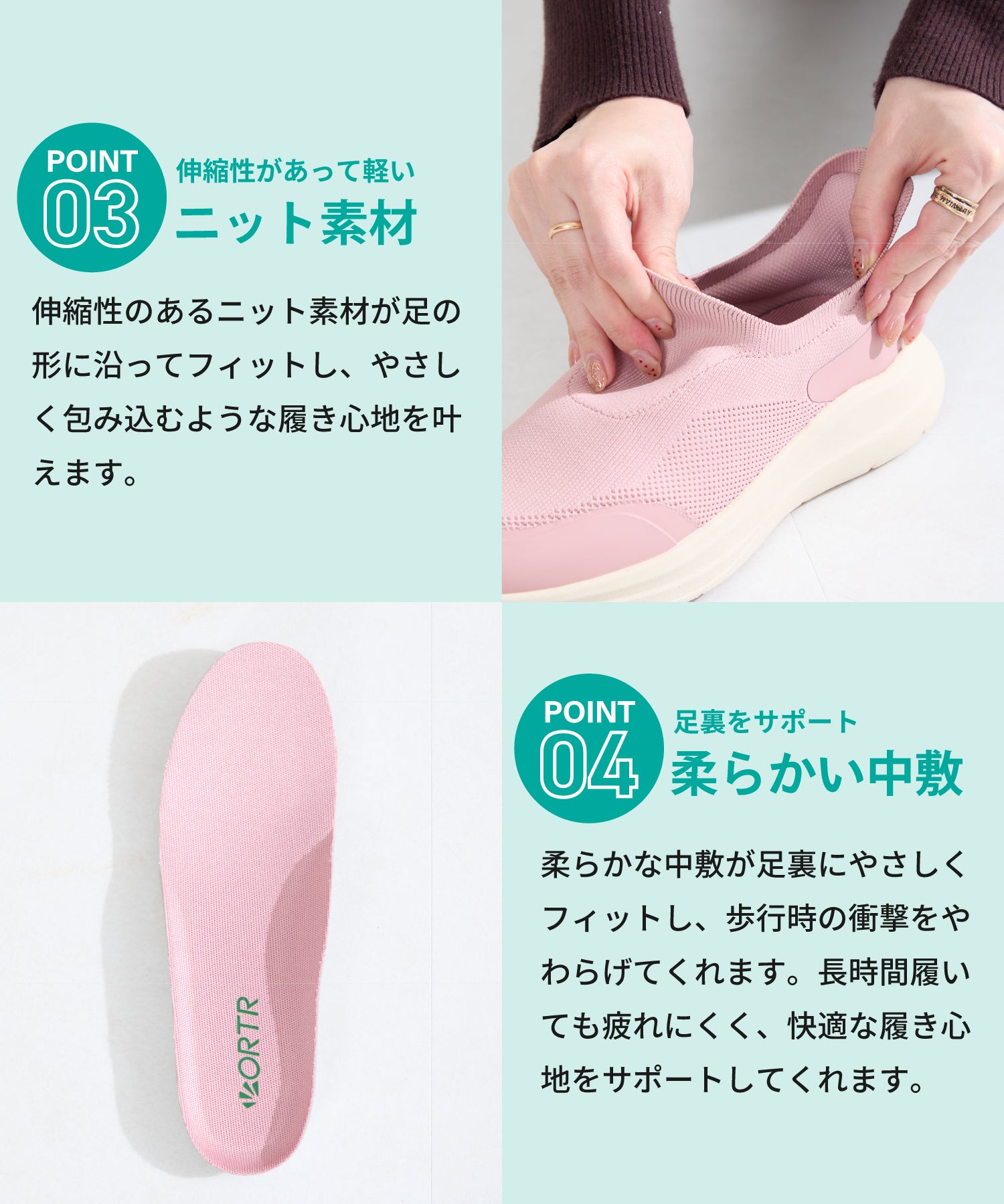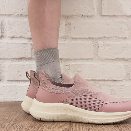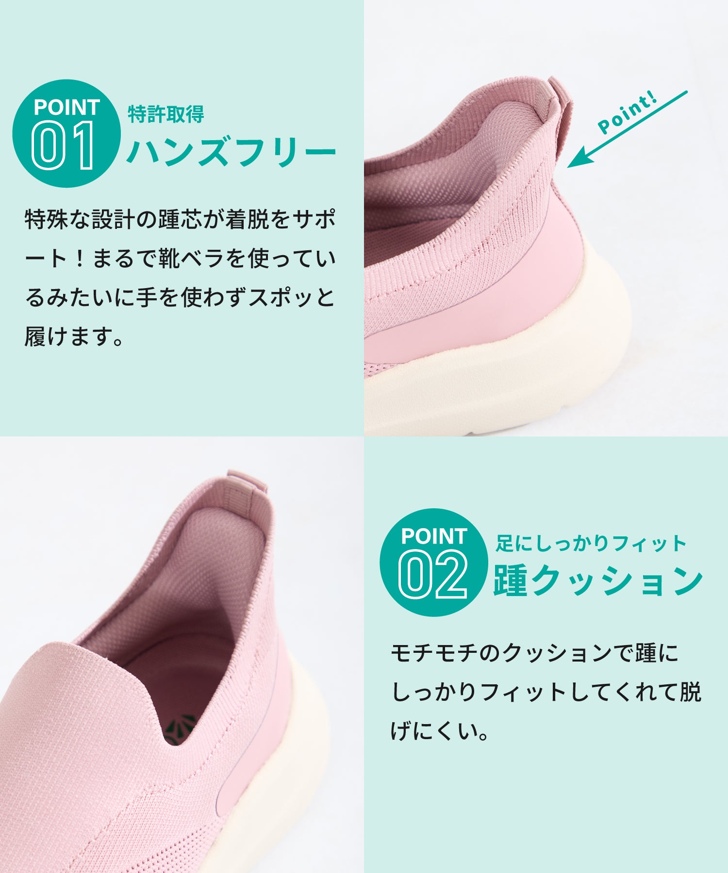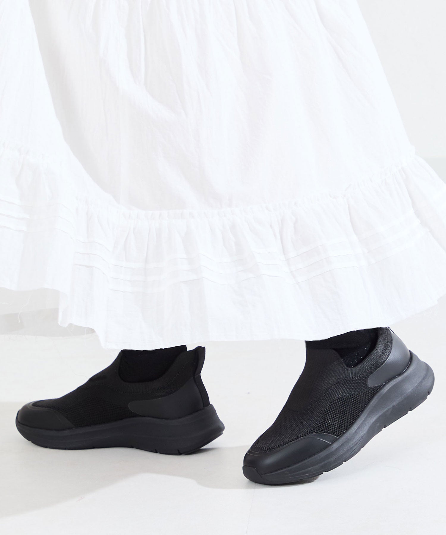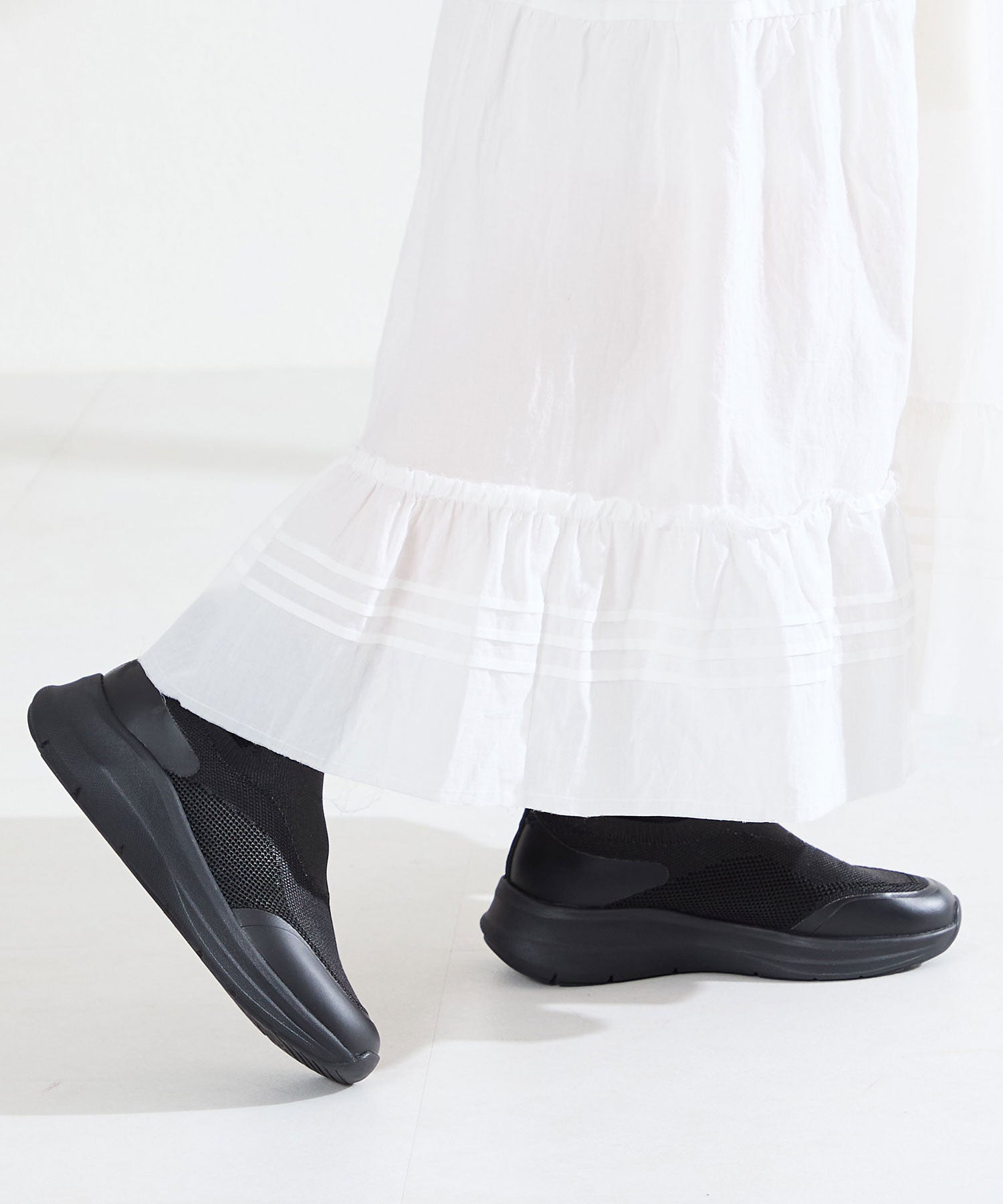 瞬間フィットシリーズから防水タイプのニットスニーカーが登場。防水シート入りで水の侵入を防ぎ、靴底にはグリップ性に優れたラバーを施し、雨の日でも安心な歩行をサポート。適度にハリのあるニット素材を使用しているのでニットならではの軽さが魅力的。さらにクッション入りの踵と伸縮する履き口が足にフィットするので、履いた瞬間から快適な履き心地を実現。さっと履けるハンズフリー仕様で、仕事で脱ぎ履きの多い方にもおすすめ。ブラックとグレーにはラメ織りのニット素材を使用しており、シンプルなデザインながらもさりげない輝きが足元に軽やかさを与えてくれます。