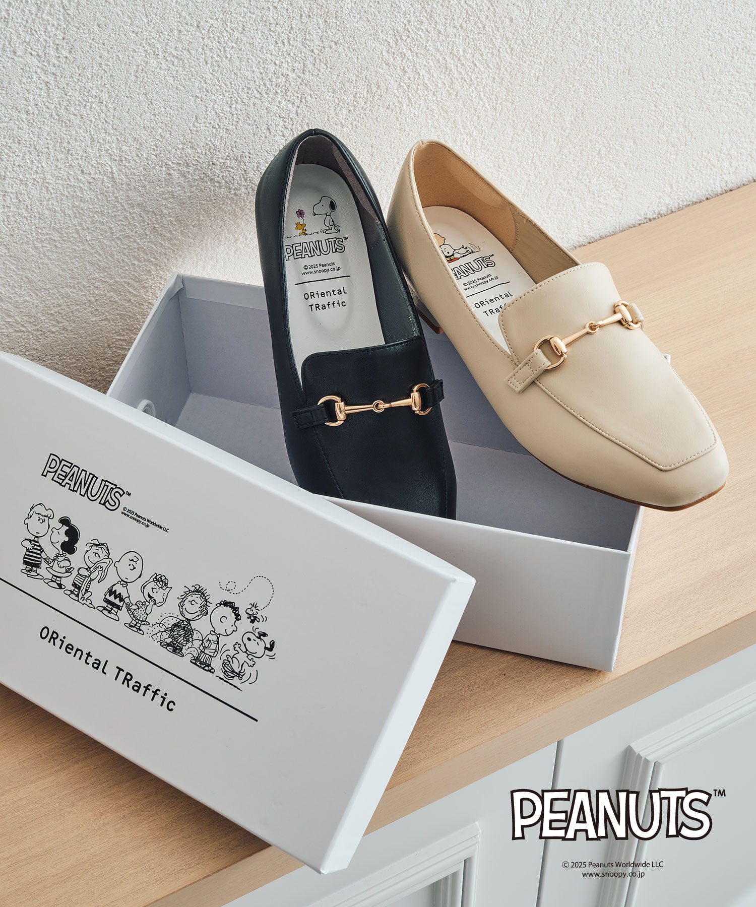 世界中で愛されるPEANUTSの仲間達とのコラボレーションアイテムが登場!ベーシックデザインのビットローファーはスヌーピーとチャーリーブラウン、ウッドストックのハートフルなアートを主役にした中敷を施して大人可愛く仕上げたアイテム。着回し力抜群のベーシックなカラーリングが中敷のカラフルな色使いのアートを引き立たせてくれる。足裏全体のクッションだけでなくつま先や踵にもクッションを搭載して足全体を包み込んでくれるフィット感を実現し歩き心地も追求した通勤などたくさん歩くシーンにも活躍してくれる1足。